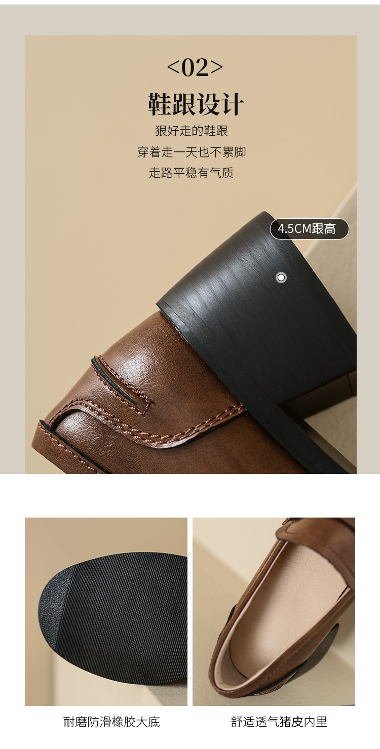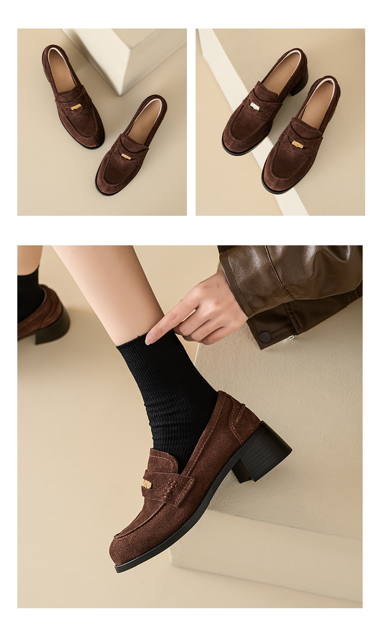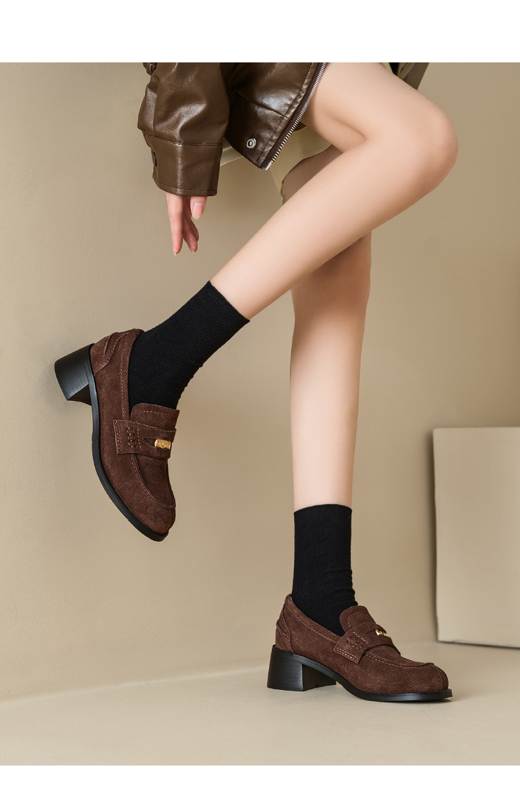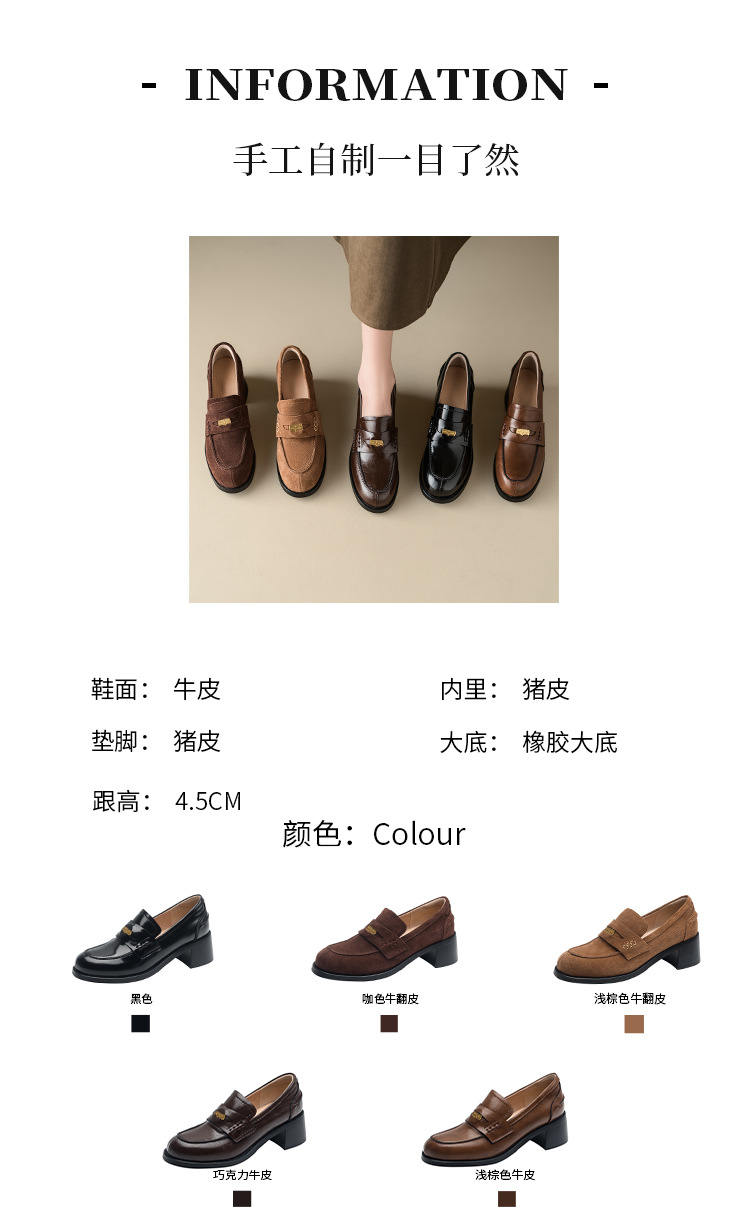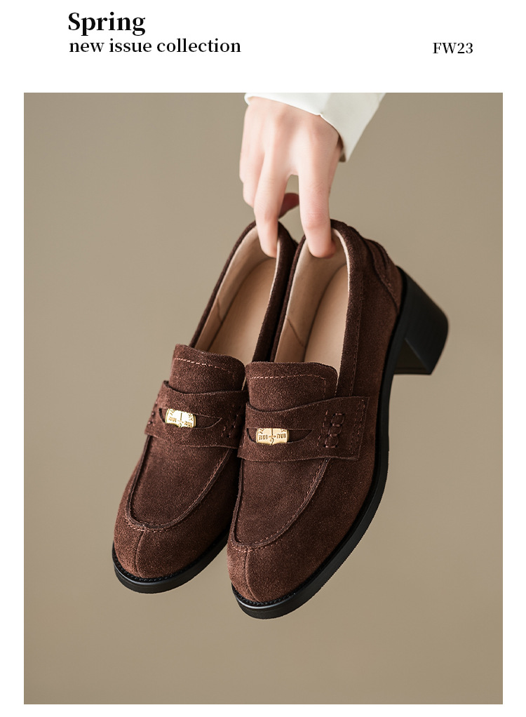 Maillard 스타일 레트로 다크 브라운 금화 블랙 가죽 신발 2023 새로운 가을 라운드 토 청키 힐 로퍼 싱글 레이어 신발스토어 가기