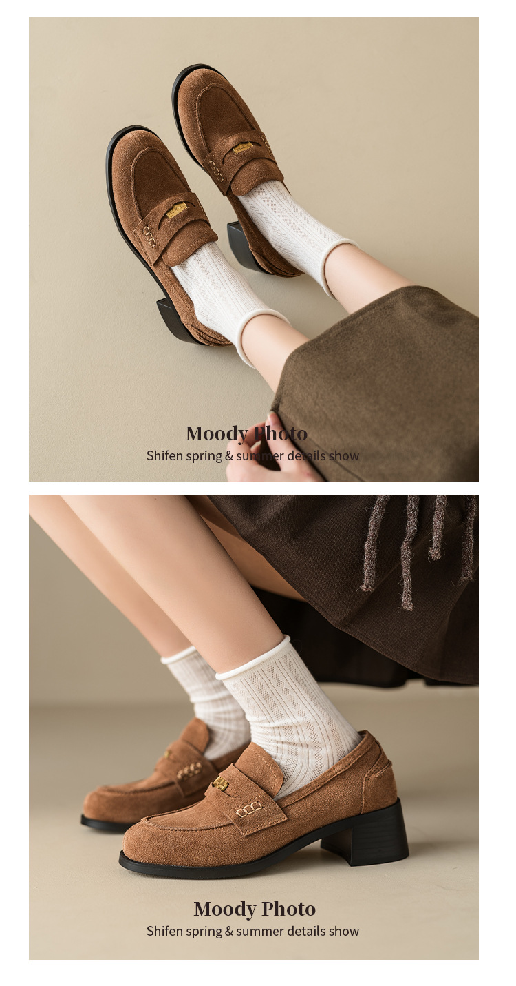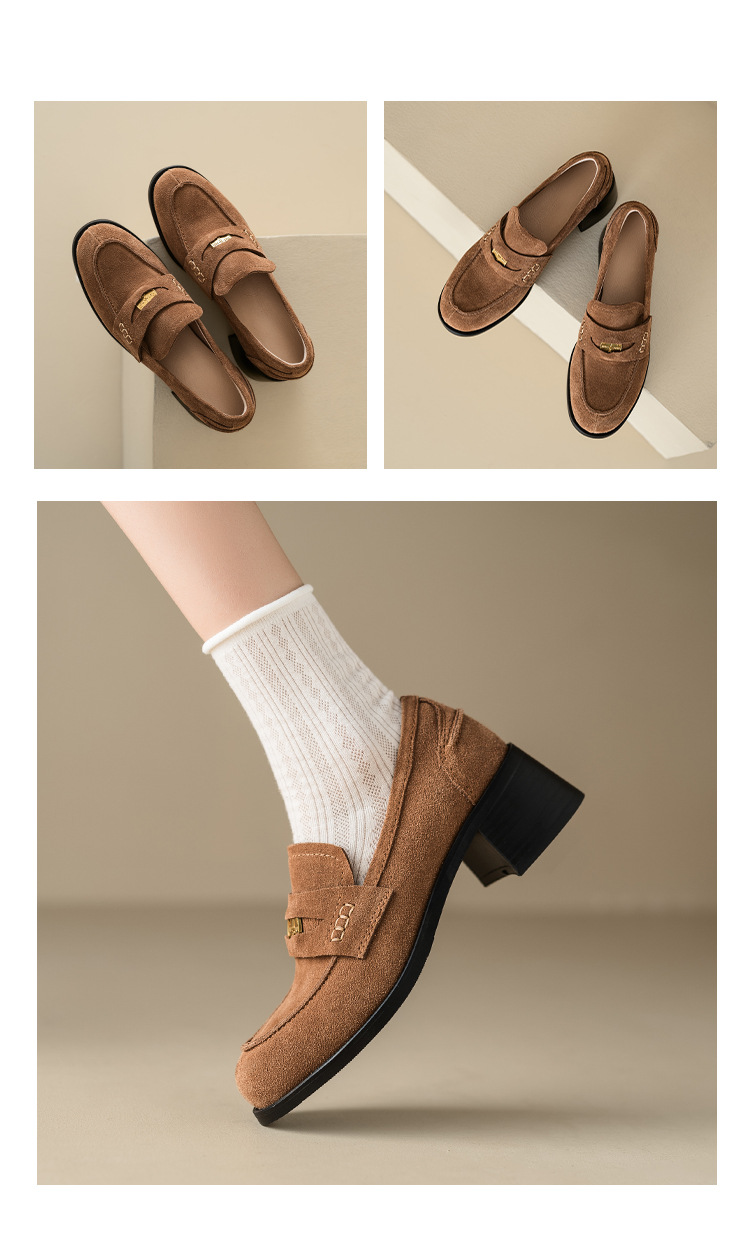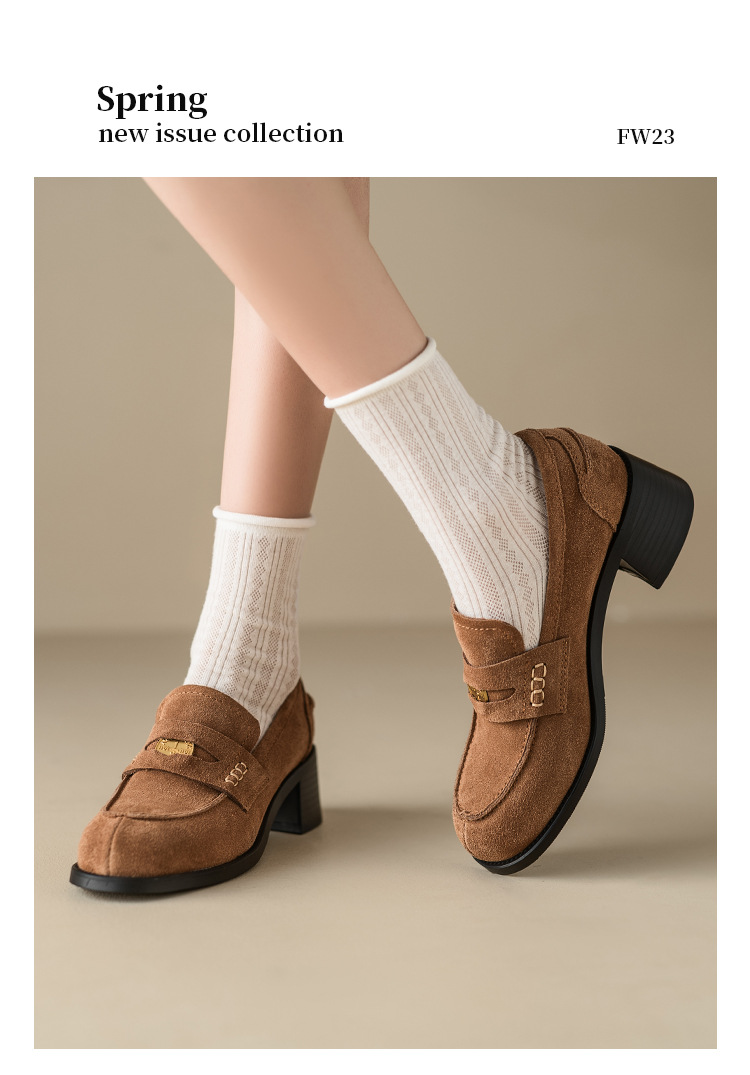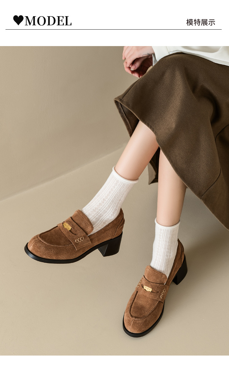 Maillard 스타일 레트로 다크 브라운 금화 블랙 가죽 신발 2023 새로운 가을 라운드 토 청키 힐 로퍼 싱글 레이어 신발스토어 가기