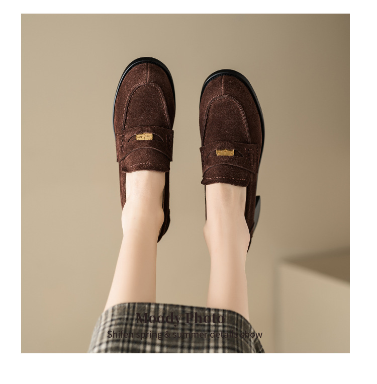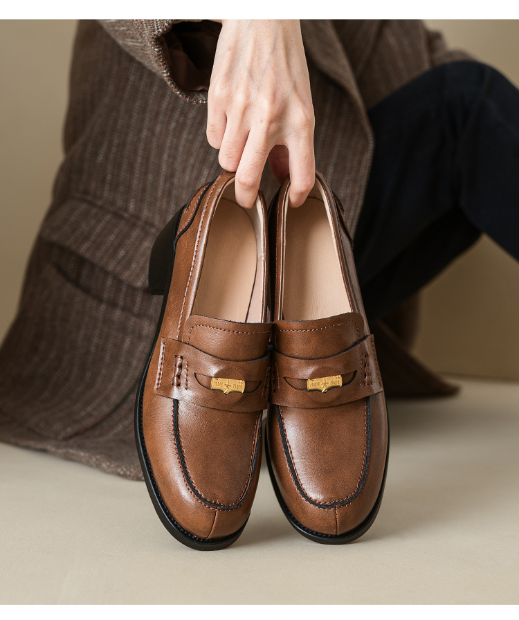 Maillard 스타일 레트로 다크 브라운 금화 블랙 가죽 신발 2023 새로운 가을 라운드 토 청키 힐 로퍼 싱글 레이어 신발