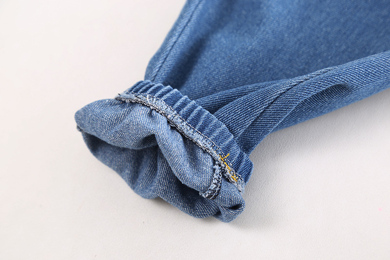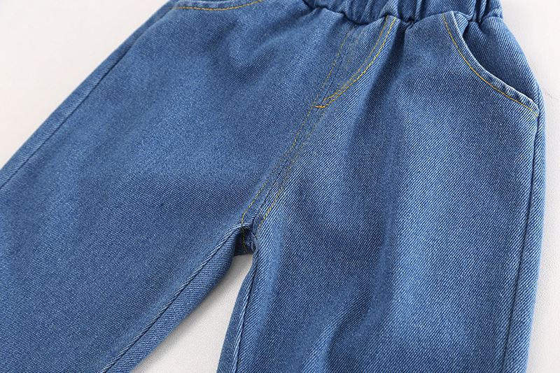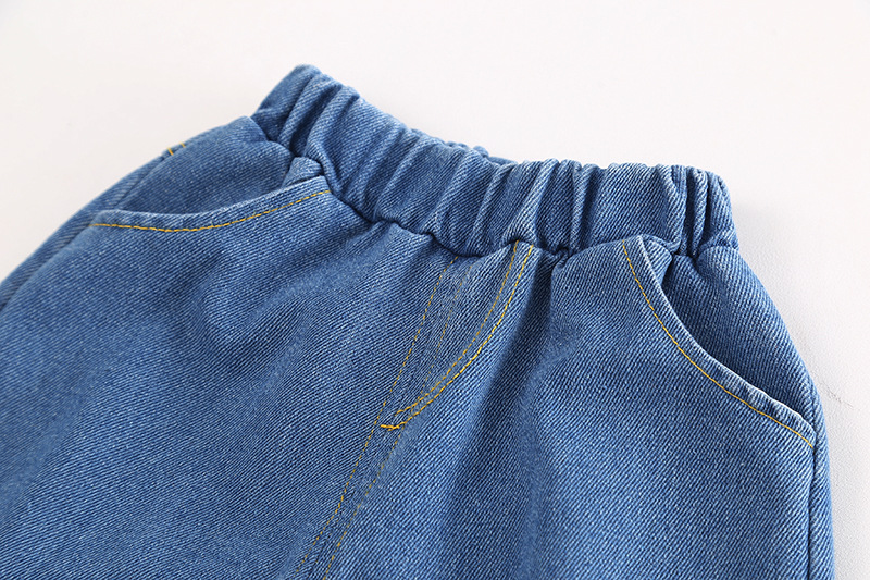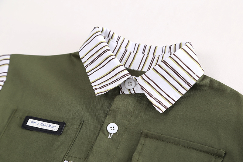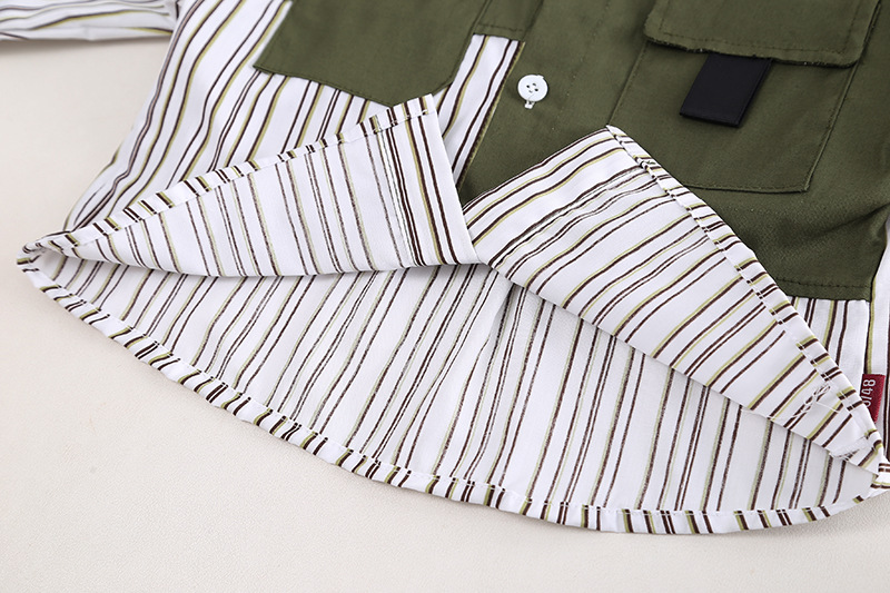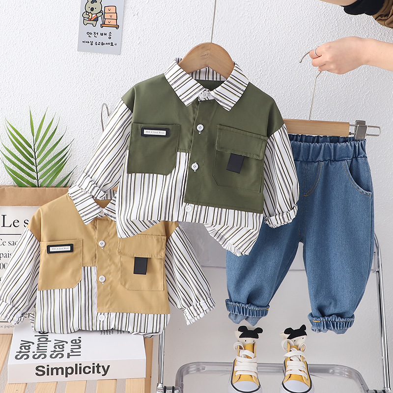 봄 2024 새로운 재미있는 아동복 작업복 소년 옷깃 블록 세로 줄무늬 스티칭 셔츠 청바지 투피스 세트스토어 가기