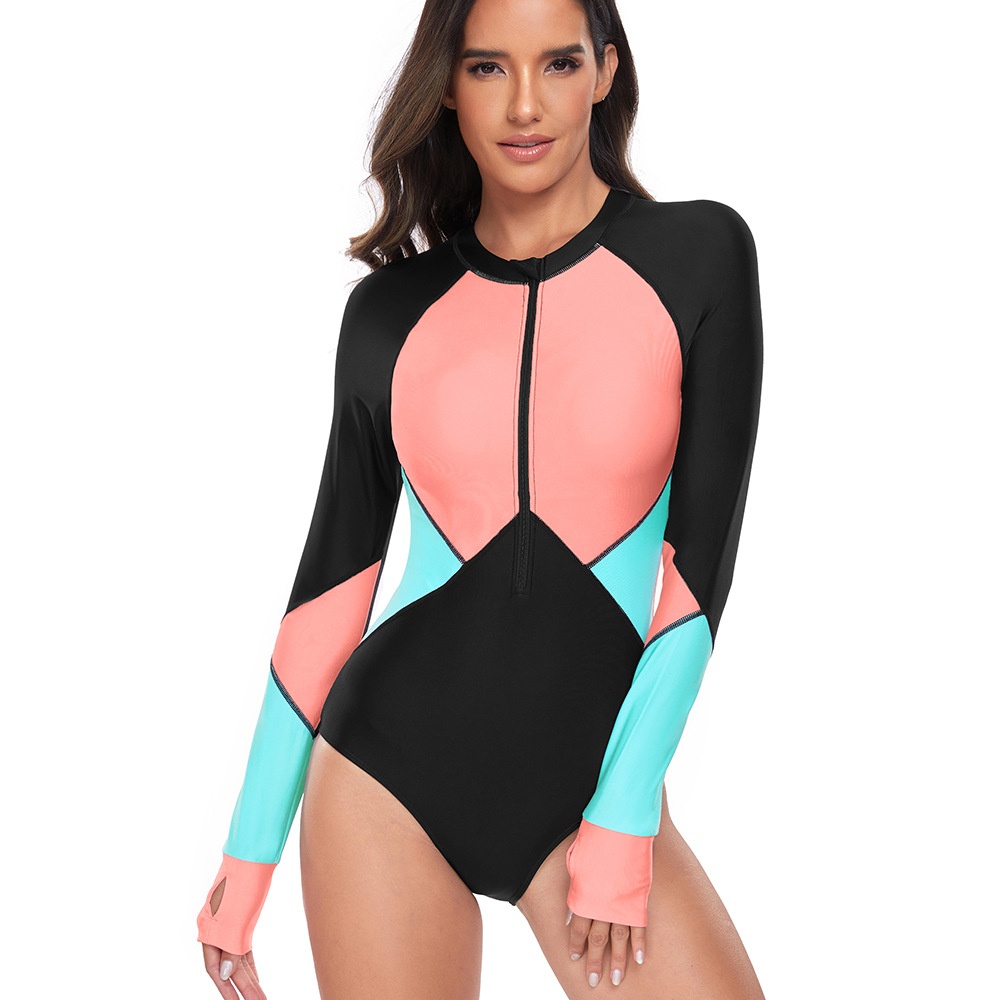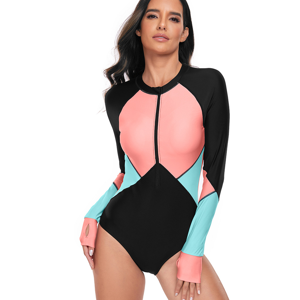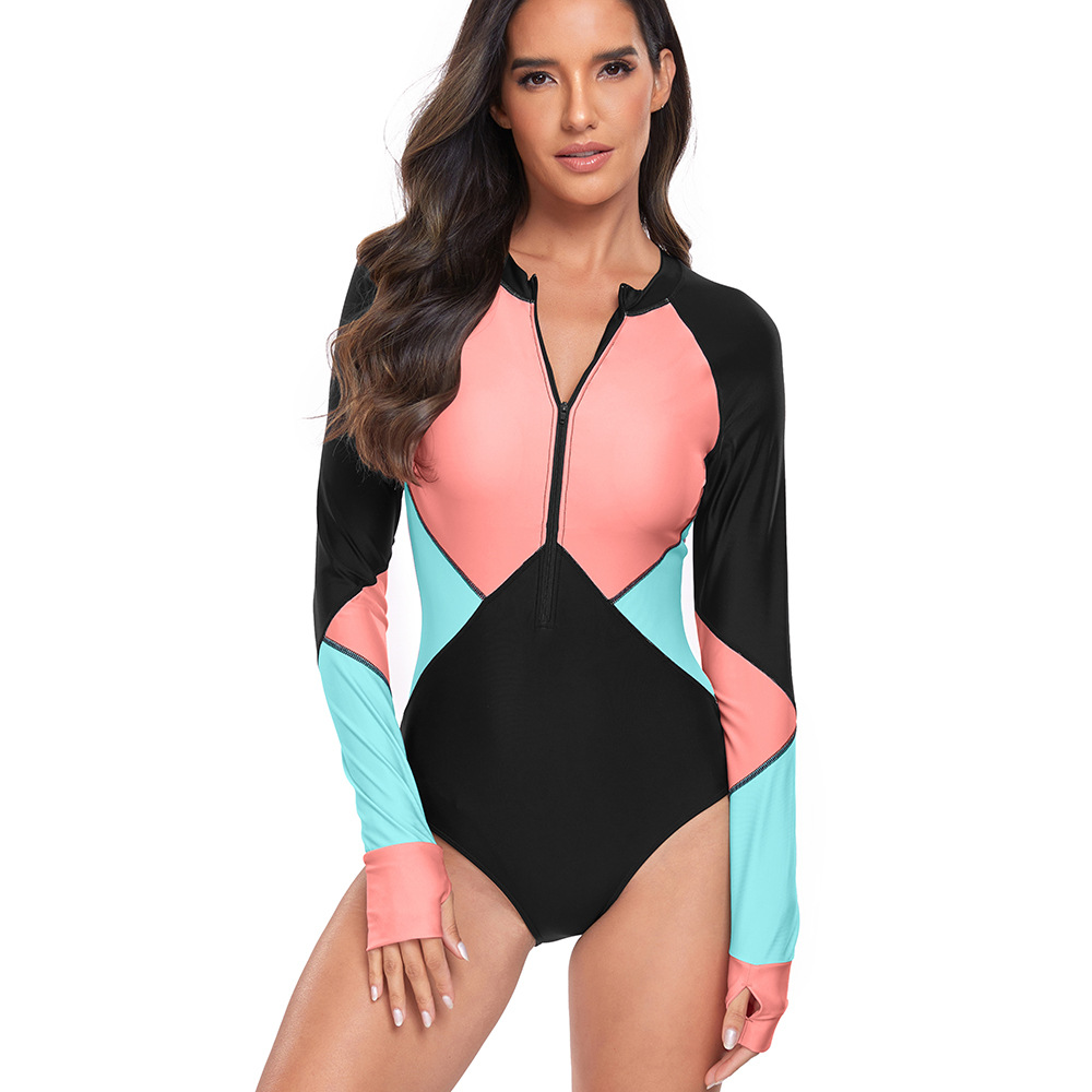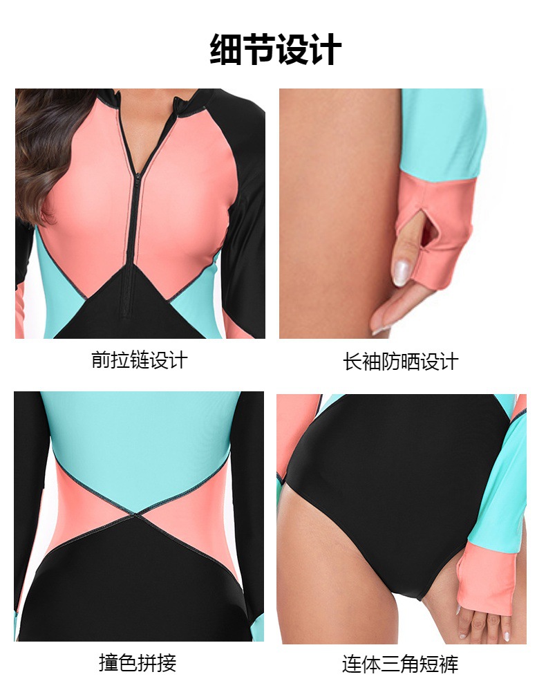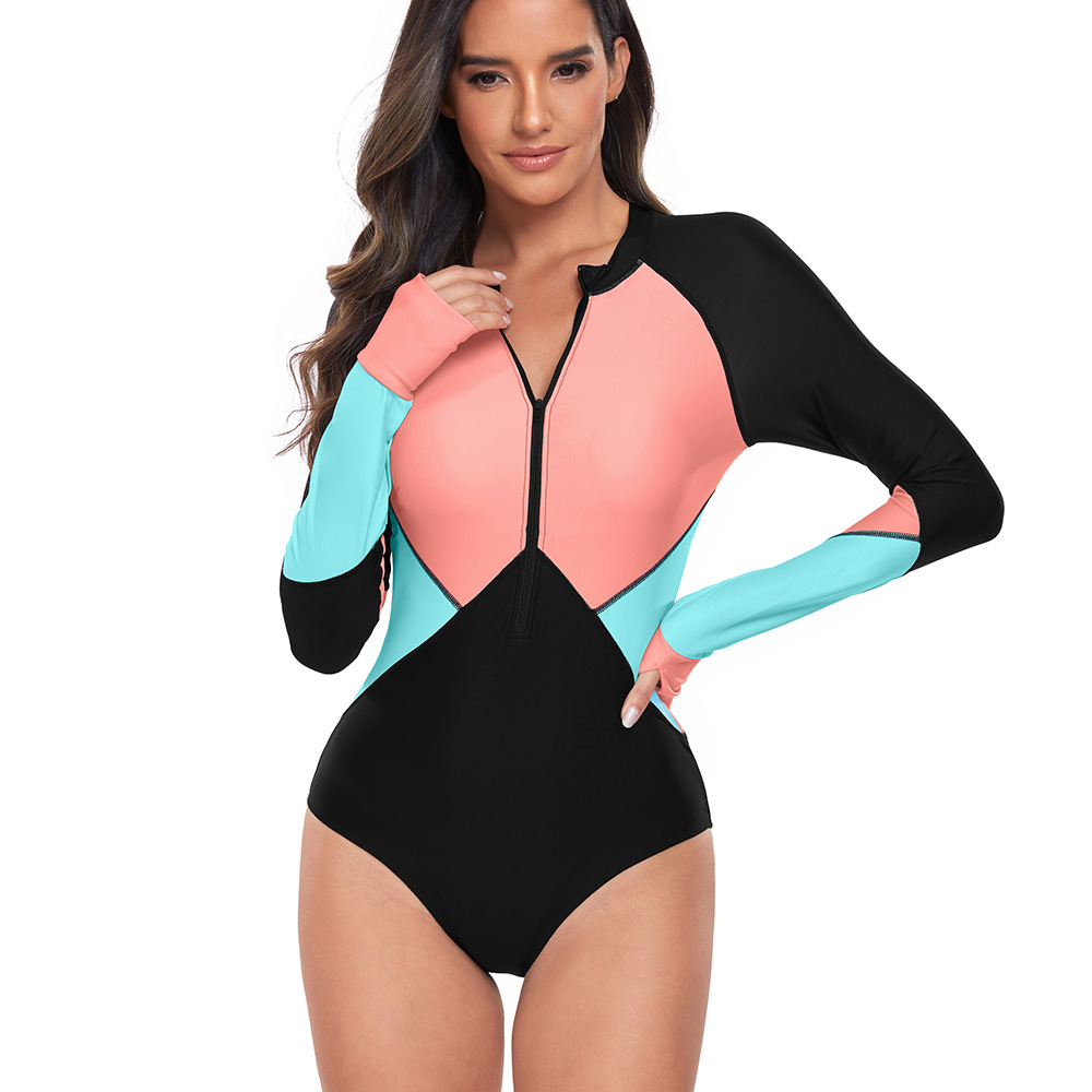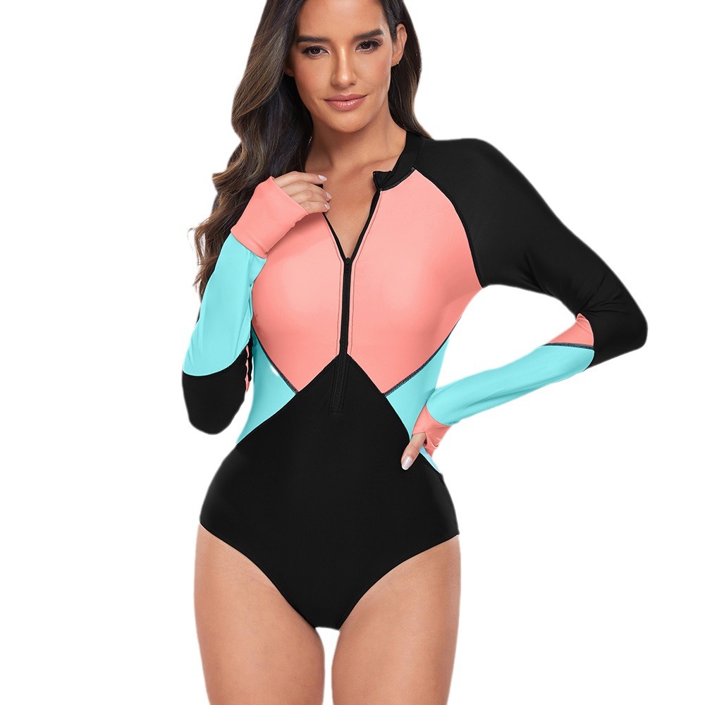 2024 유럽과 미국의 새로운 원피스 수영복 여성 서핑 세트 보수적 인 지퍼 긴 소매 선 스크린 대비 컬러 디자인 수영복 도매