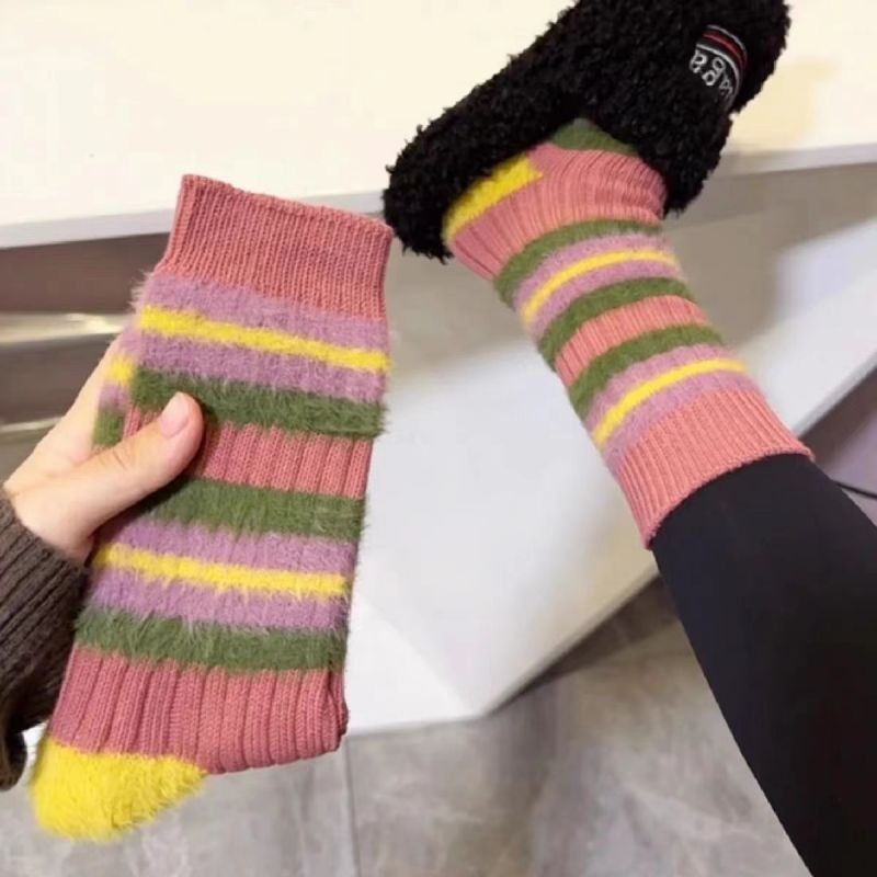 겨울 두꺼운 스트라이프 컬러 매칭 플러시 양말 인조 밍크 아우터 착용 중반 종아리 통기성 양말 여성의 따뜻한 스타킹