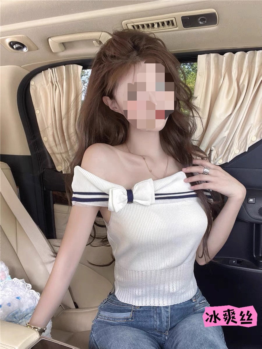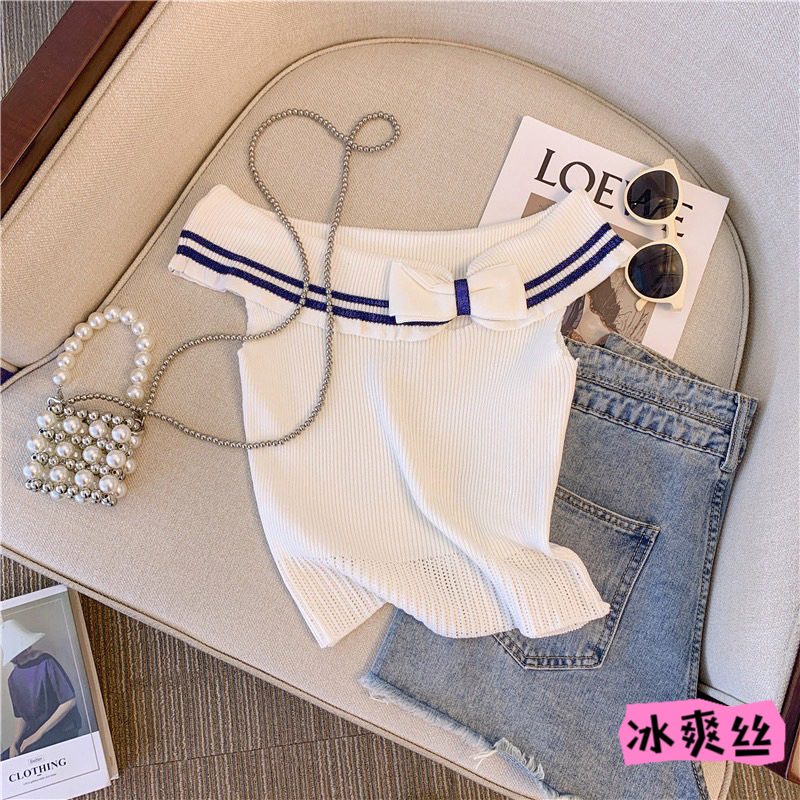 오프 숄더 활 니트 민소매 티셔츠 여성 여름 순수 달콤한 핫 소녀 섹시한 짧은 최고 디자인 감각 틈새스토어 가기