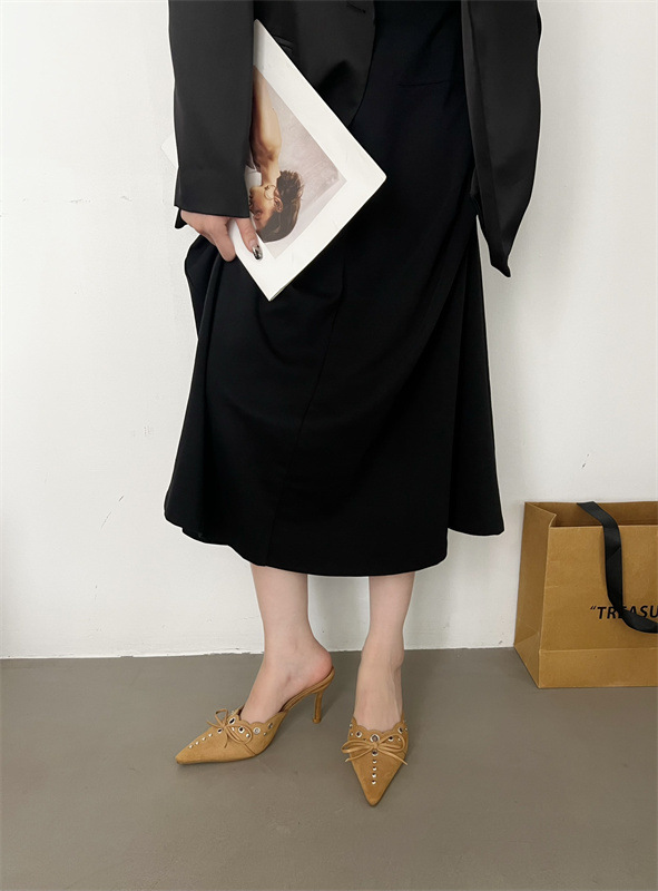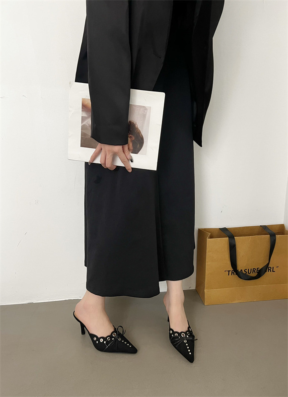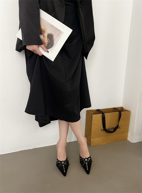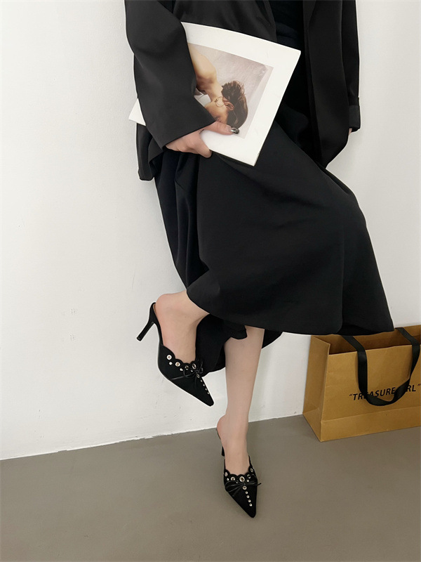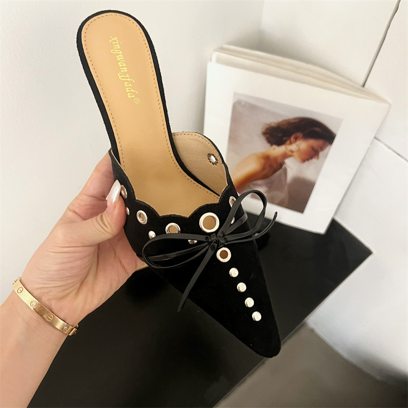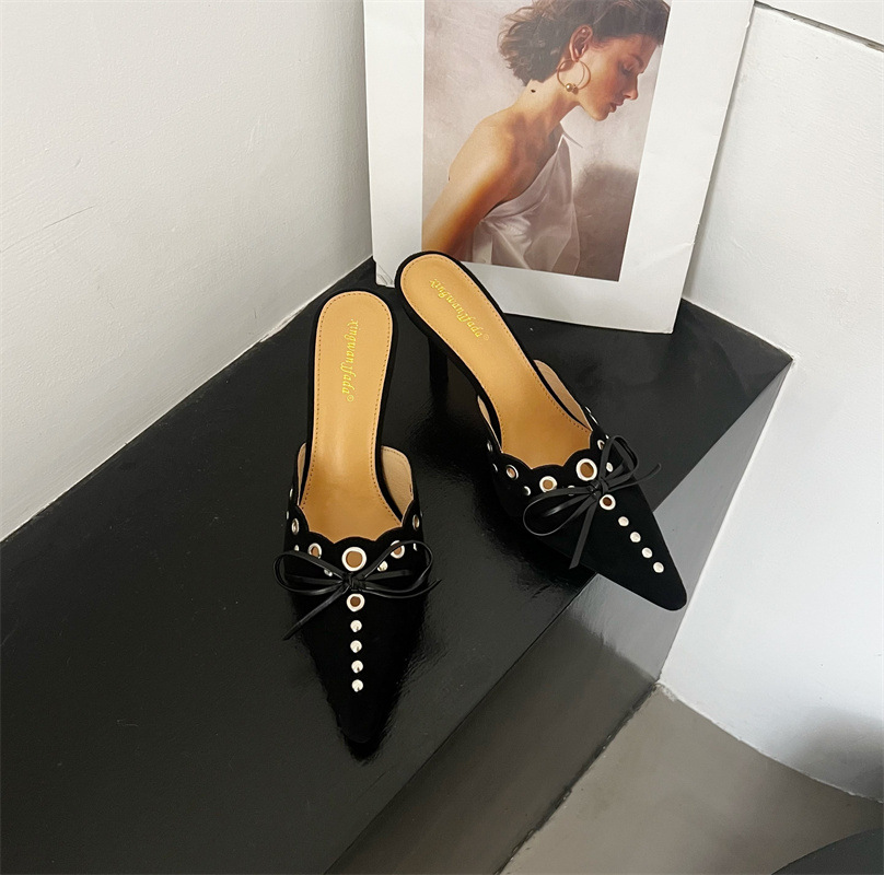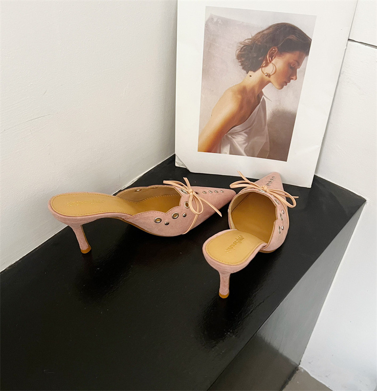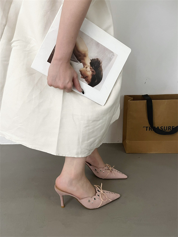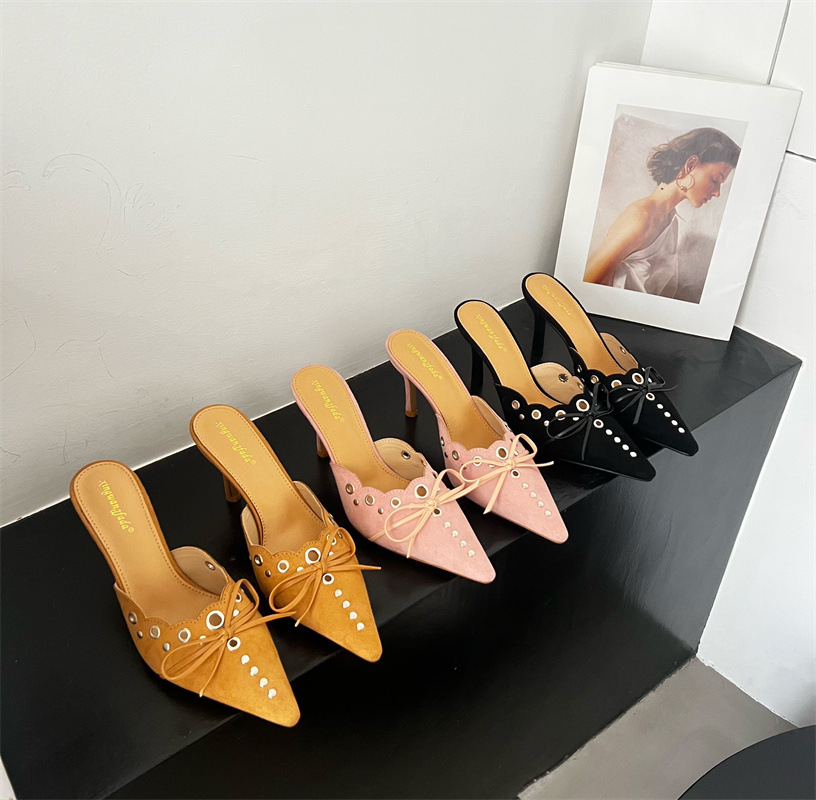 2025 패션 새로운 지적 활 레이스 중공 스웨이드 하이힐 Baotou 다시 빈 슬리퍼 하프 드래그 여성 신발스토어 가기