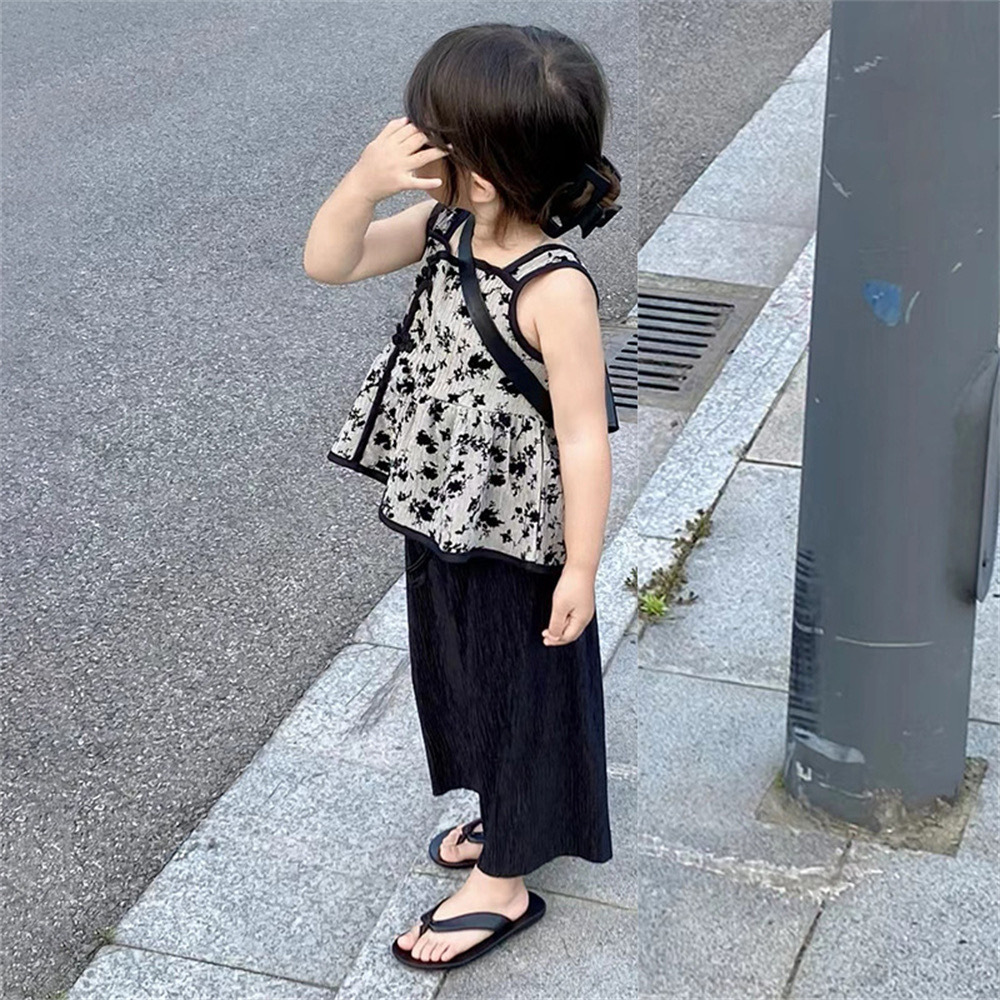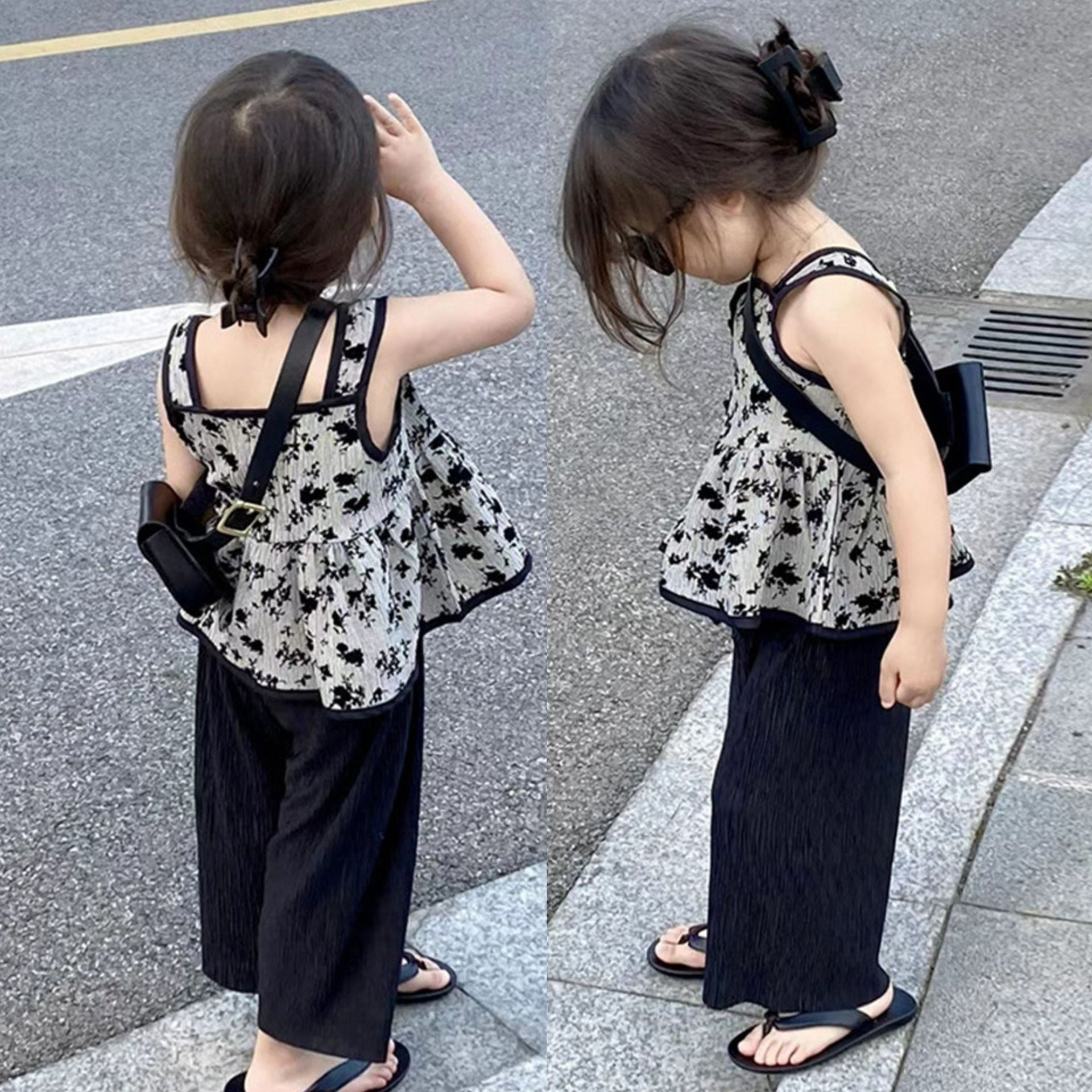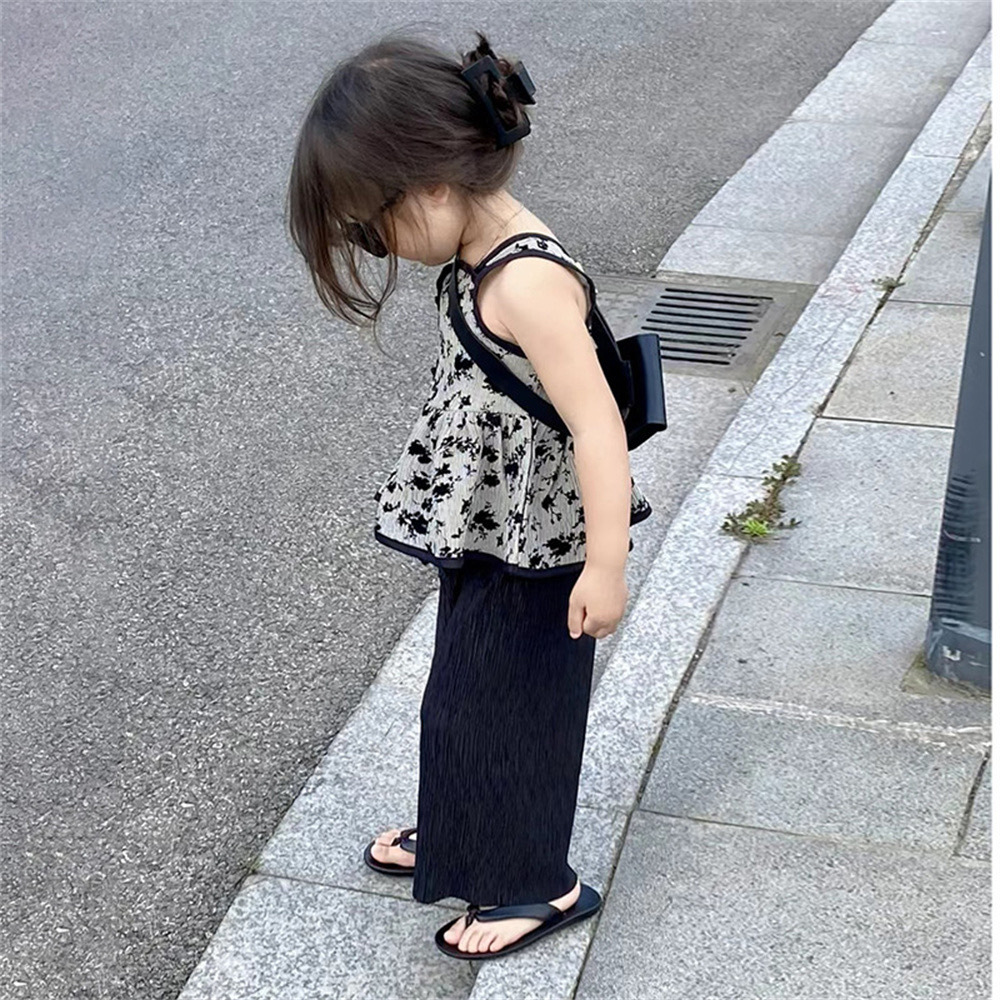 소녀의 여름 세트 새로운 한국어 버전의 꽃 조끼 주름 넓은 다리 바지 2 피스 세트