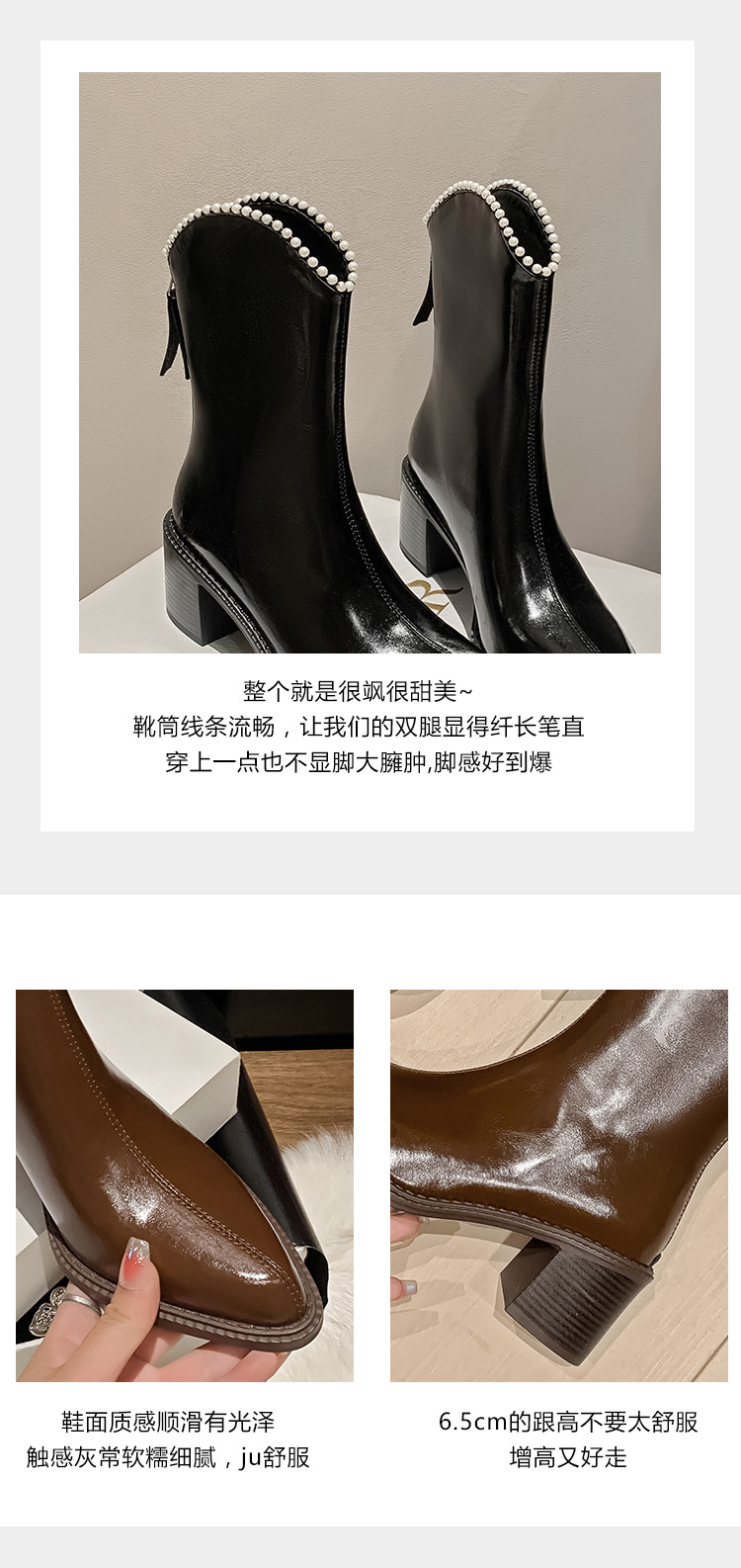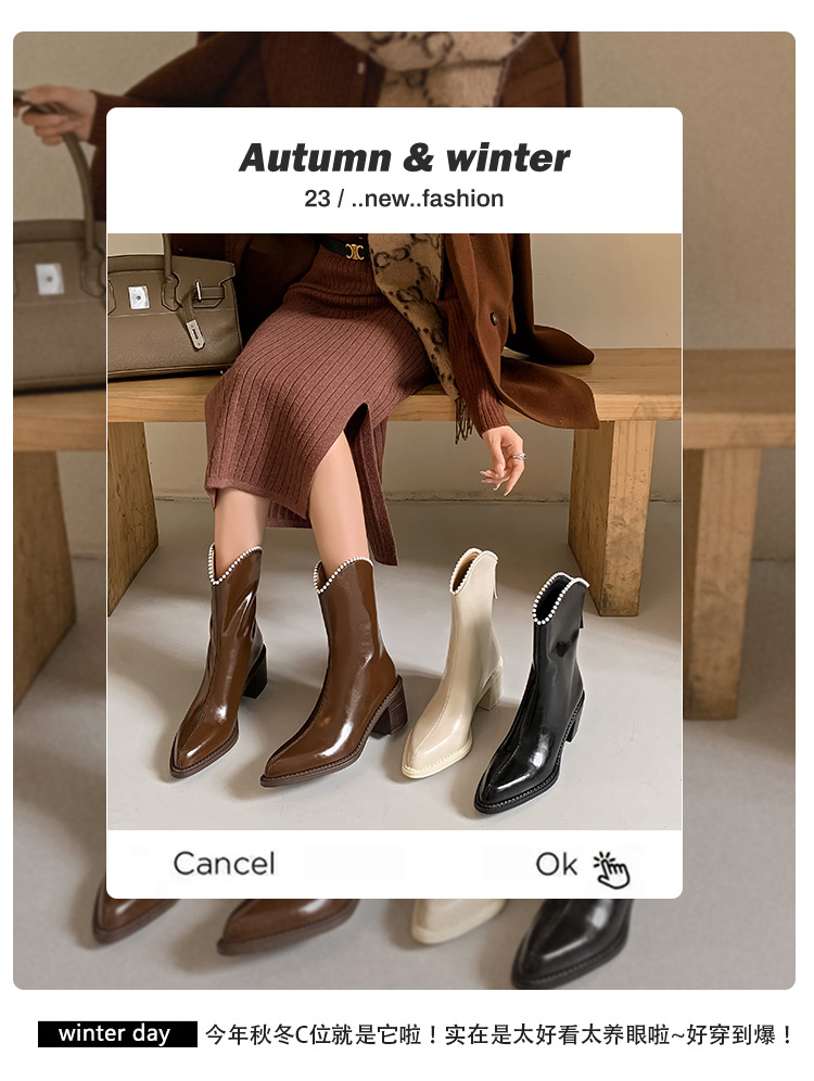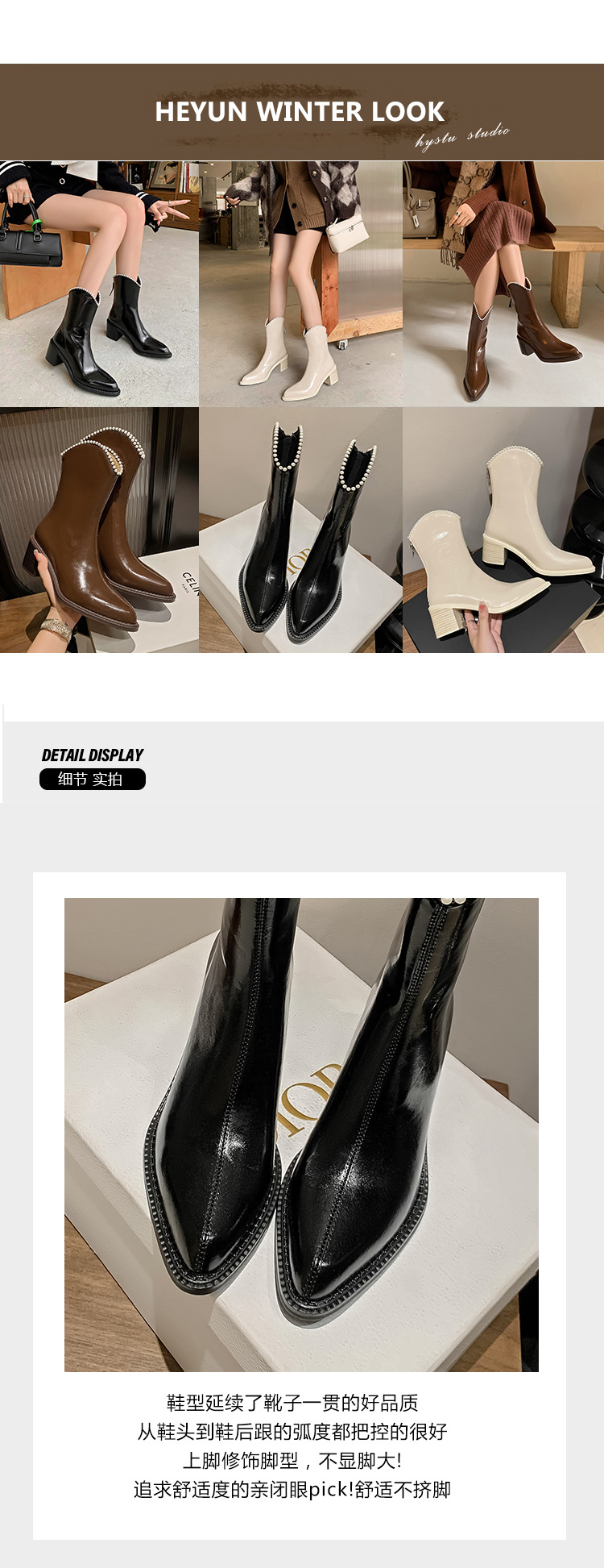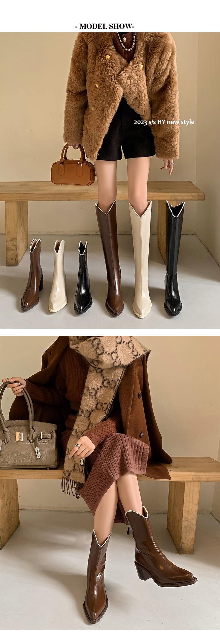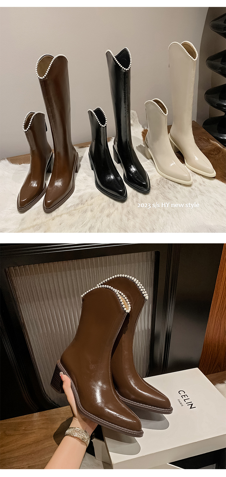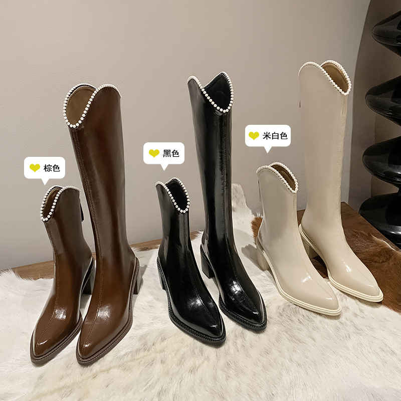 정품 가죽 뾰족한 발가락 두꺼운 하이힐 부츠 다크 브라운 v 입 롱 부츠 여성 작은 높이 증가 얇은 부츠 화이트 하이 부츠스토어 가기