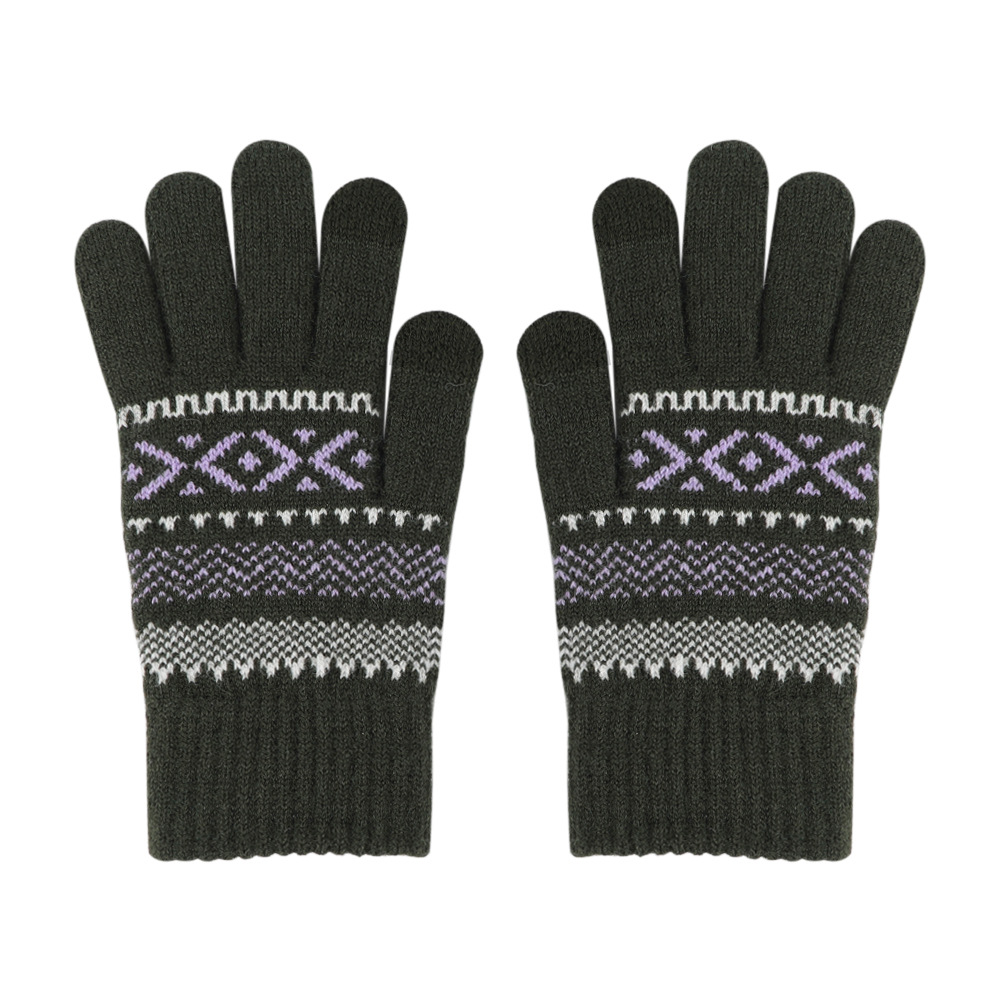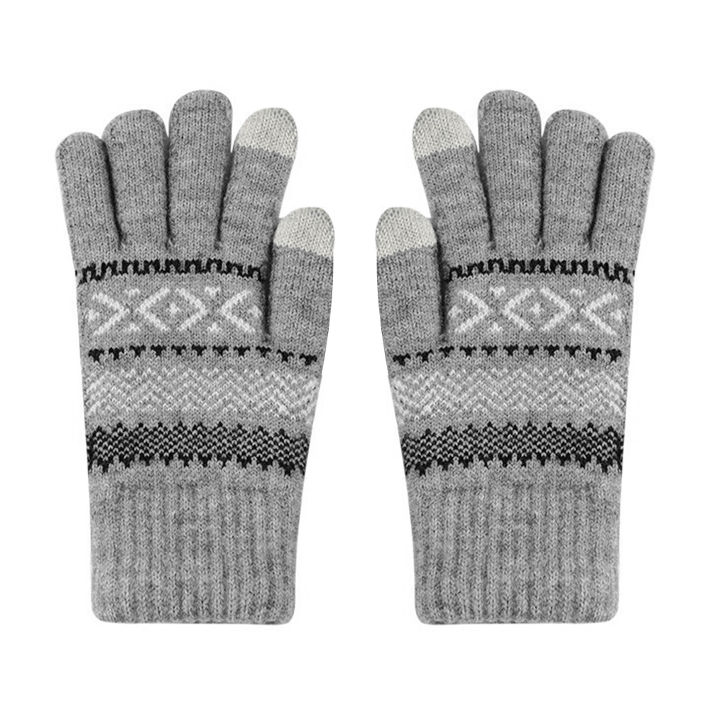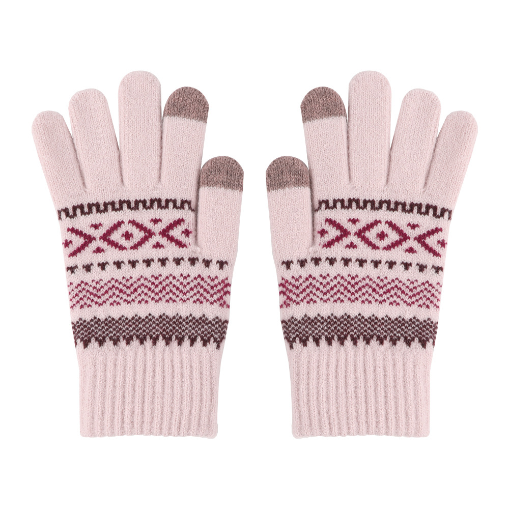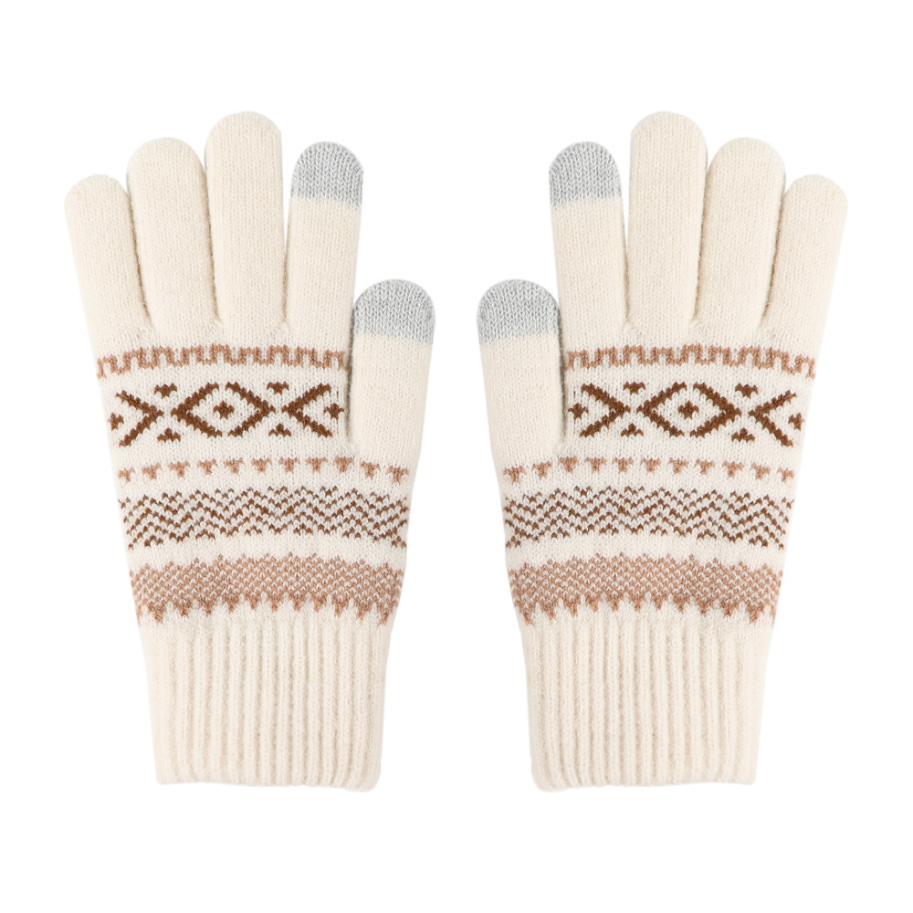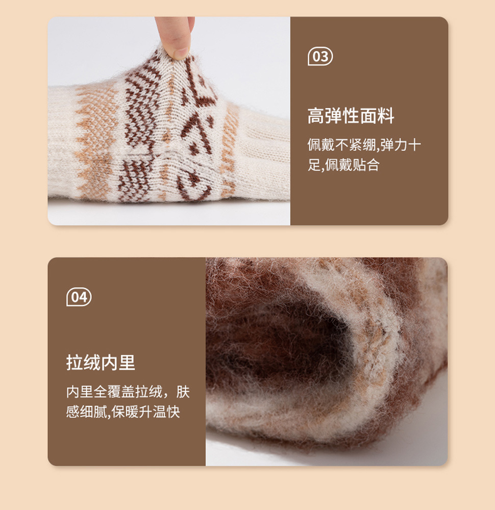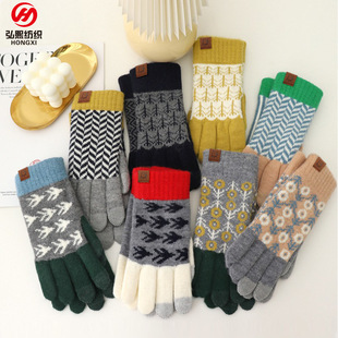 日系秋冬爆款羊毛撞色毛线针织手套复古提花加绒骑车触屏保暖手套