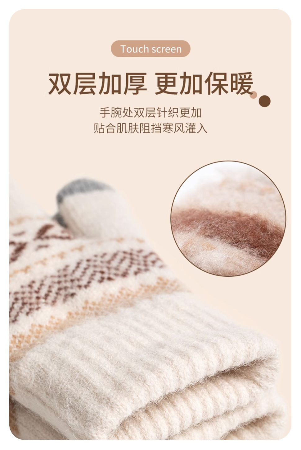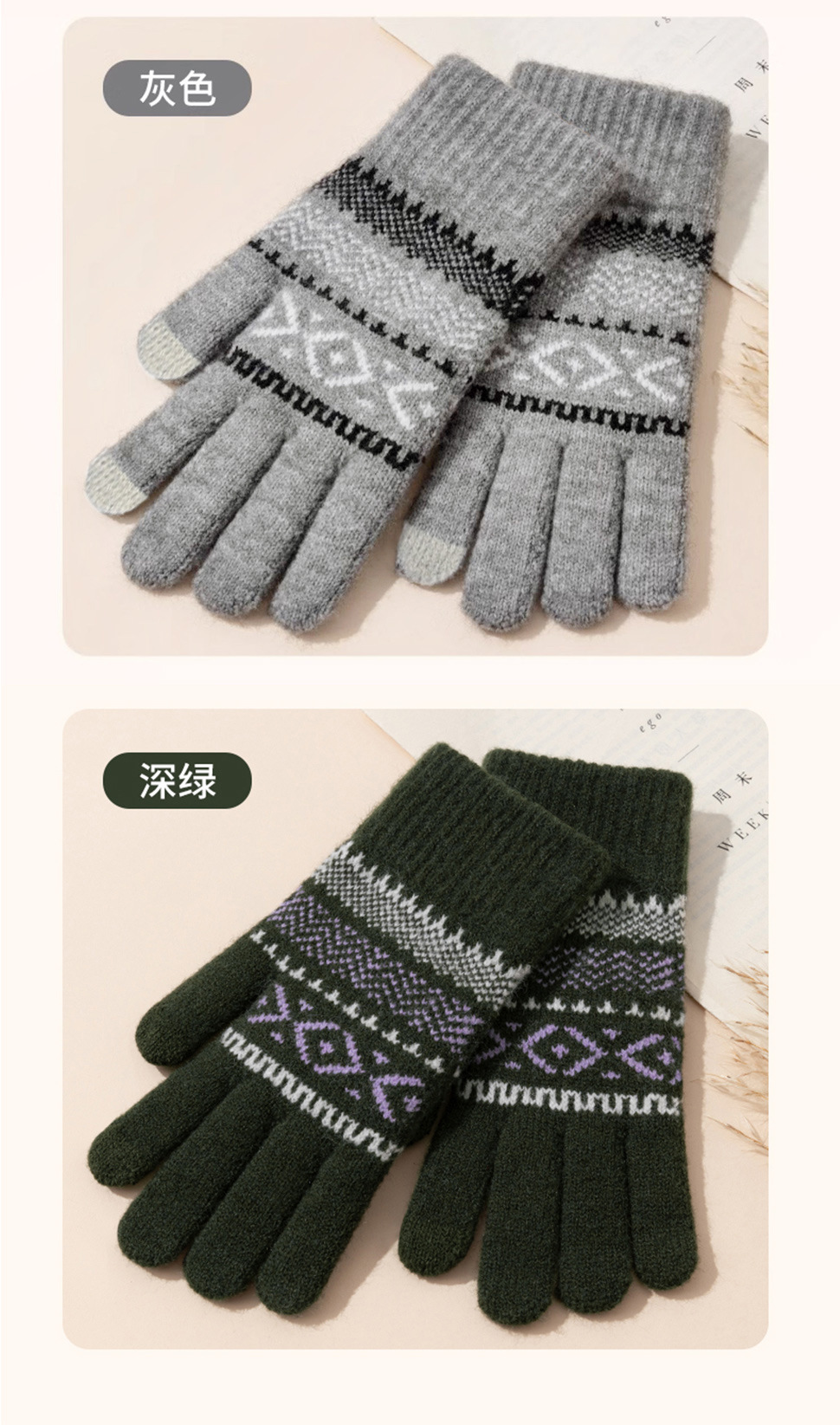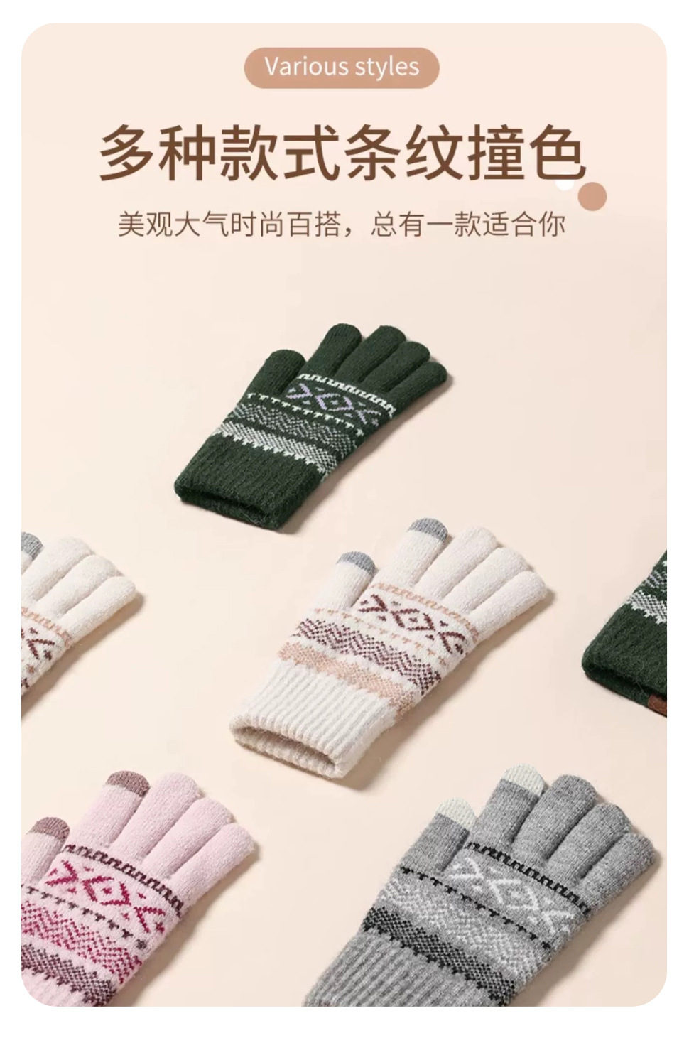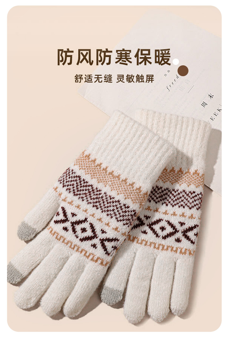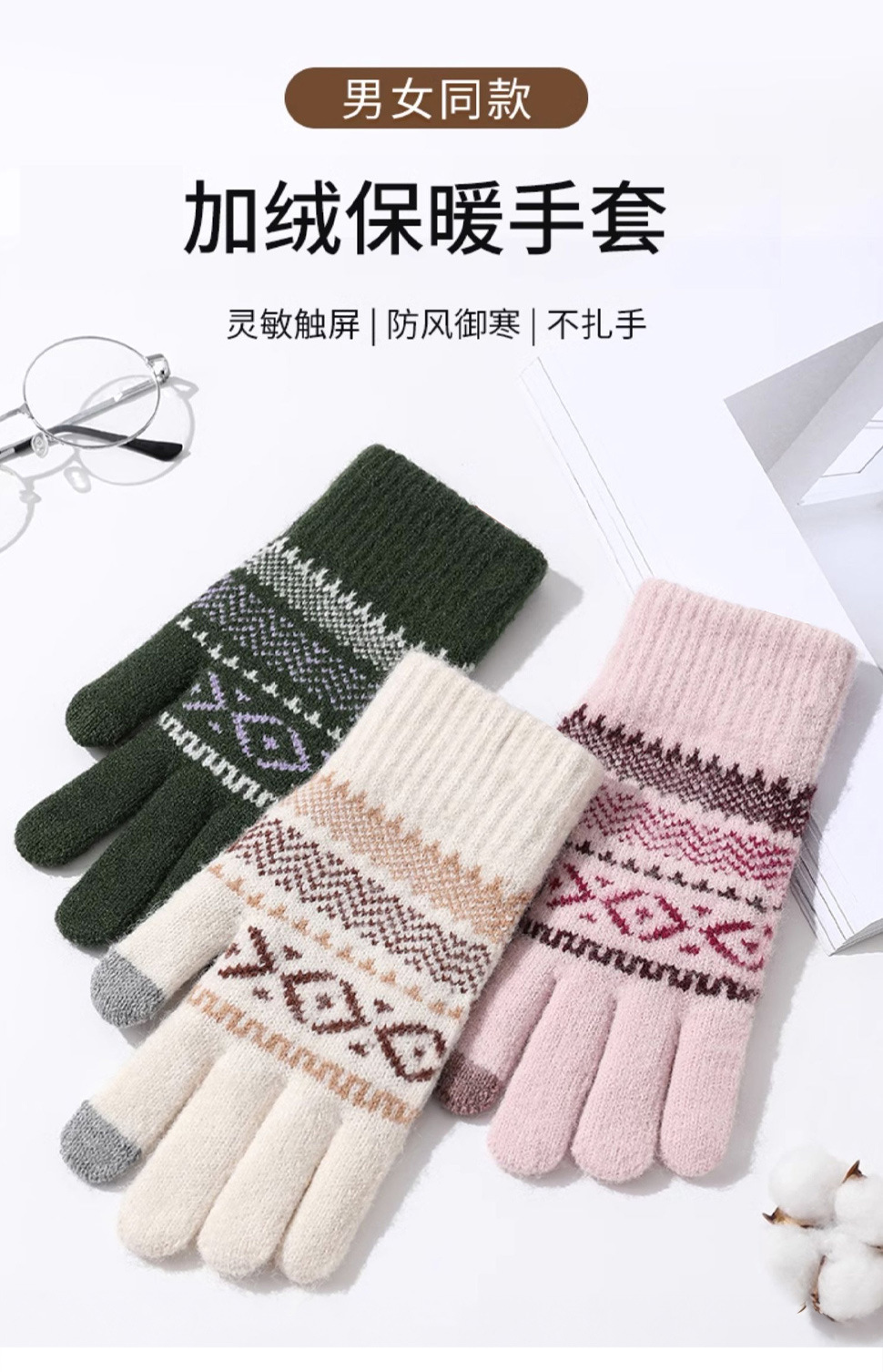 日系秋冬爆款羊毛撞色毛线针织手套复古提花加绒骑车触屏保暖手套