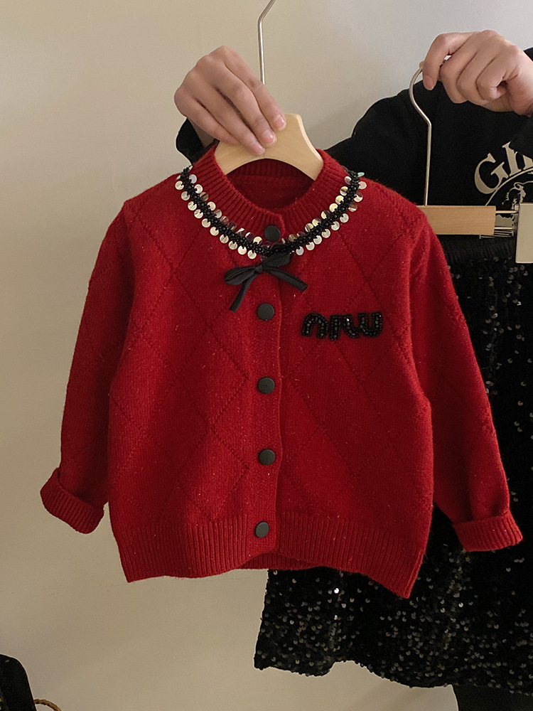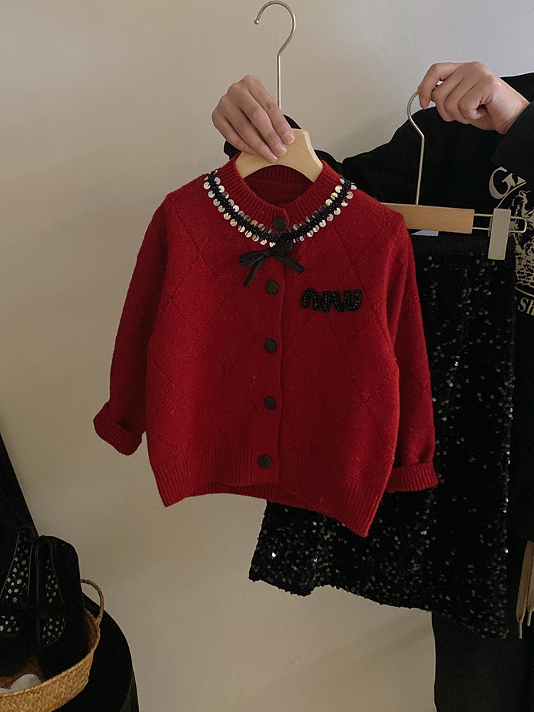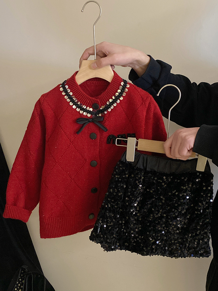 부드러운 샤넬 스타일 가을과 겨울 다이아몬드 구슬 니트 카디건 스웨터 코트 서양식 스팽글 스커트 세트