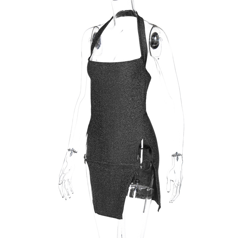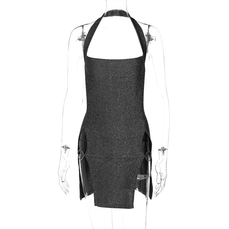 섹시한 뜨거운 여자 스타일 짧은 치마 2025 봄 유럽과 미국의 대외 무역 여성의 새로운 스타일 홀터넥 슬릿 밝은 실크 엉덩이 덮는 드레스스토어 가기