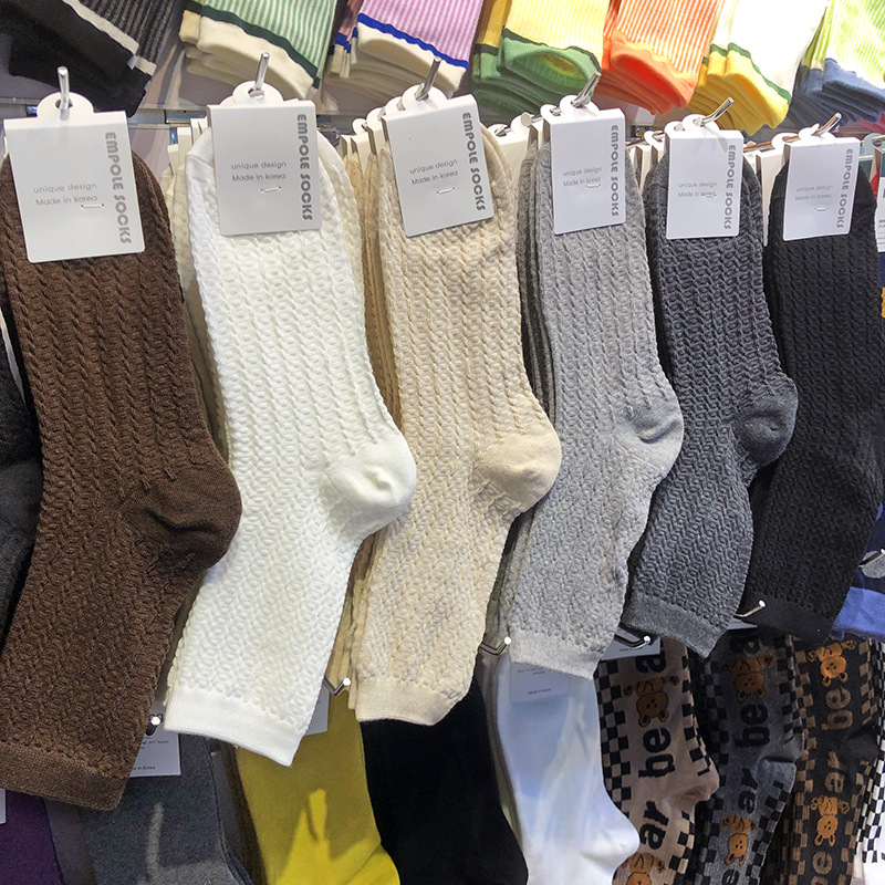 한국 수입 양말 양각 작은 격자 무늬 단색 기본 여성면 양말 Maillard 복고풍 스타일 다크 브라운 중간 종아리 길이 양말스토어 가기