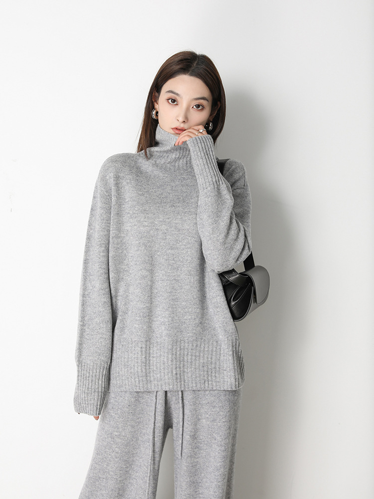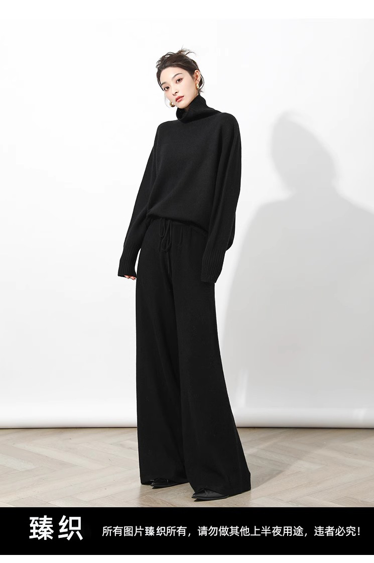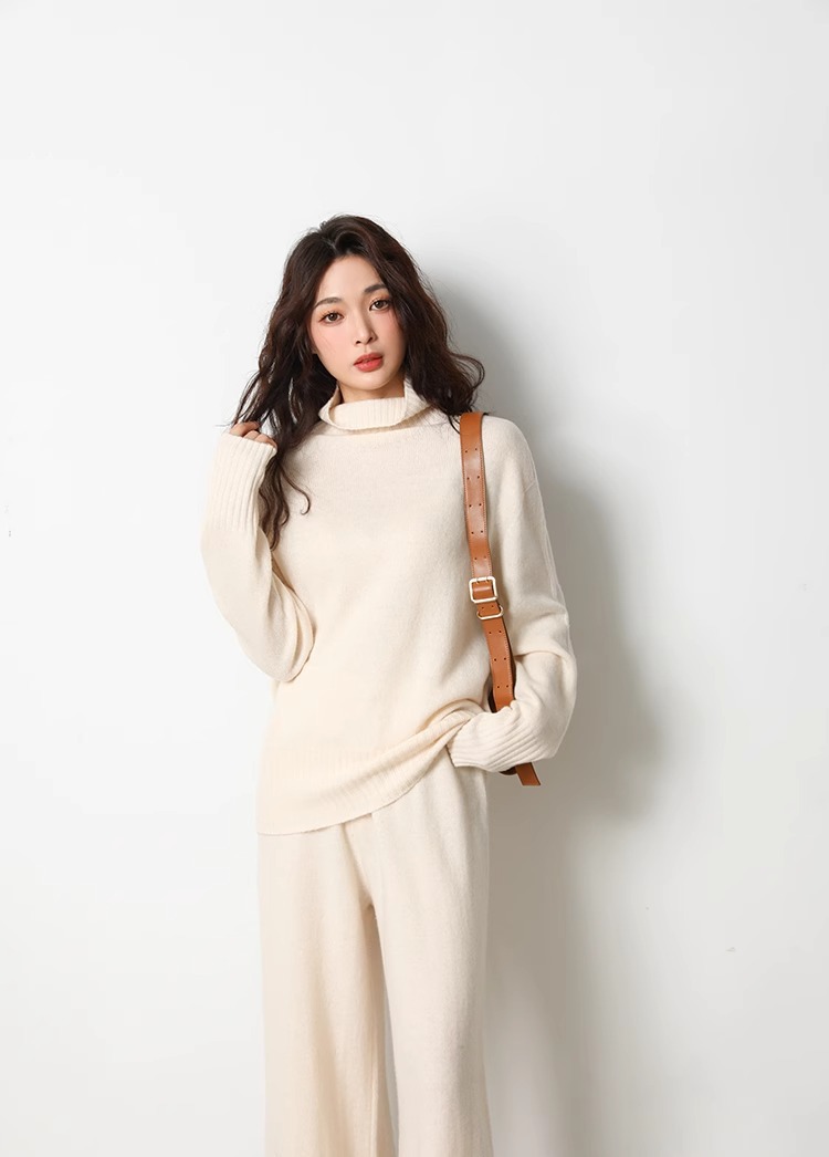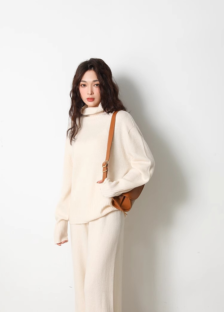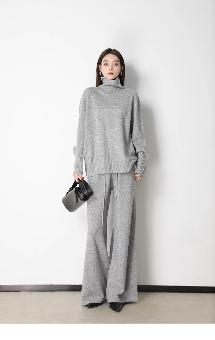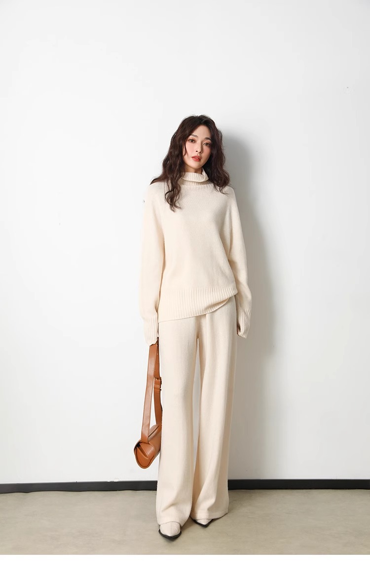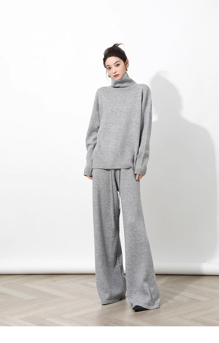 캐주얼한 올 울 스웨터 세트, 봄철 루즈핏 하이넥 이너 니트 와이드 팬츠 투피스 세트, 출퇴근룩스토어 가기