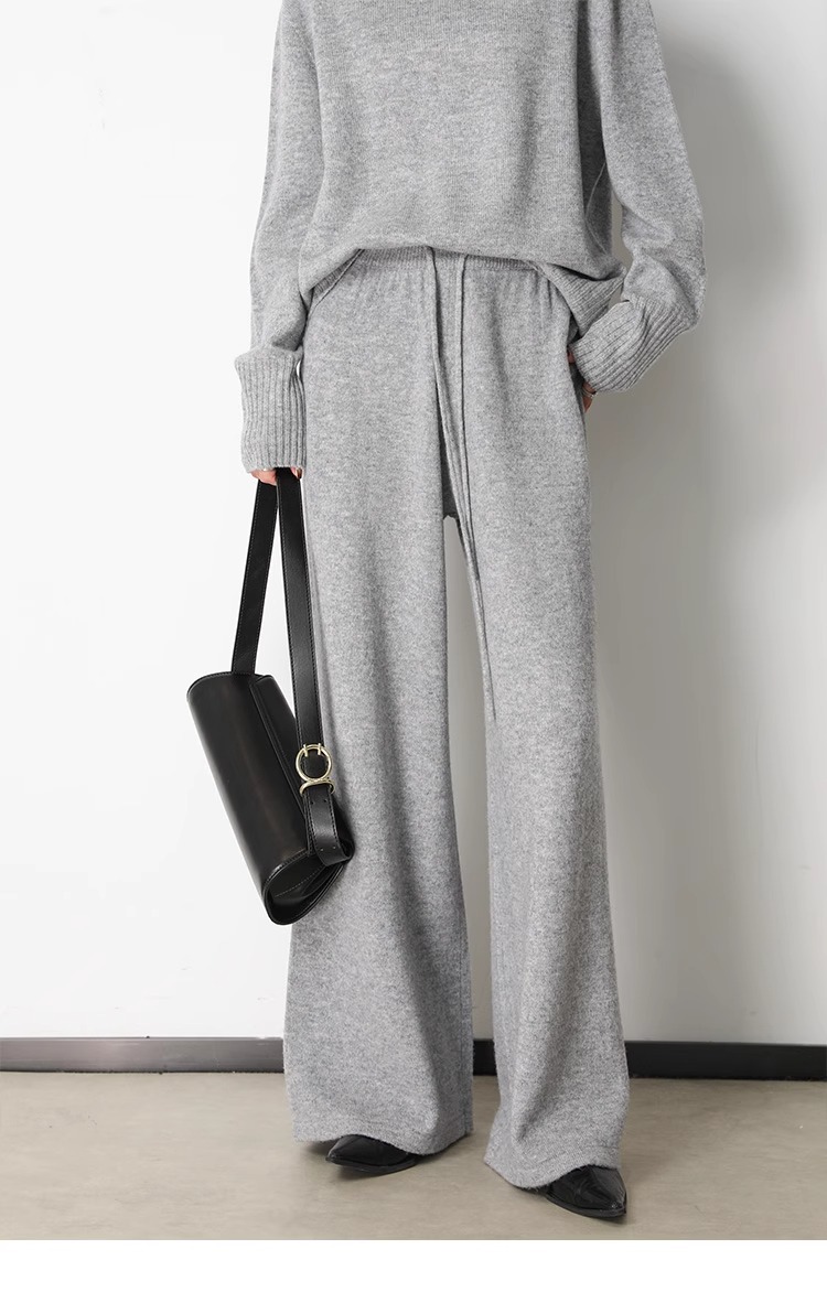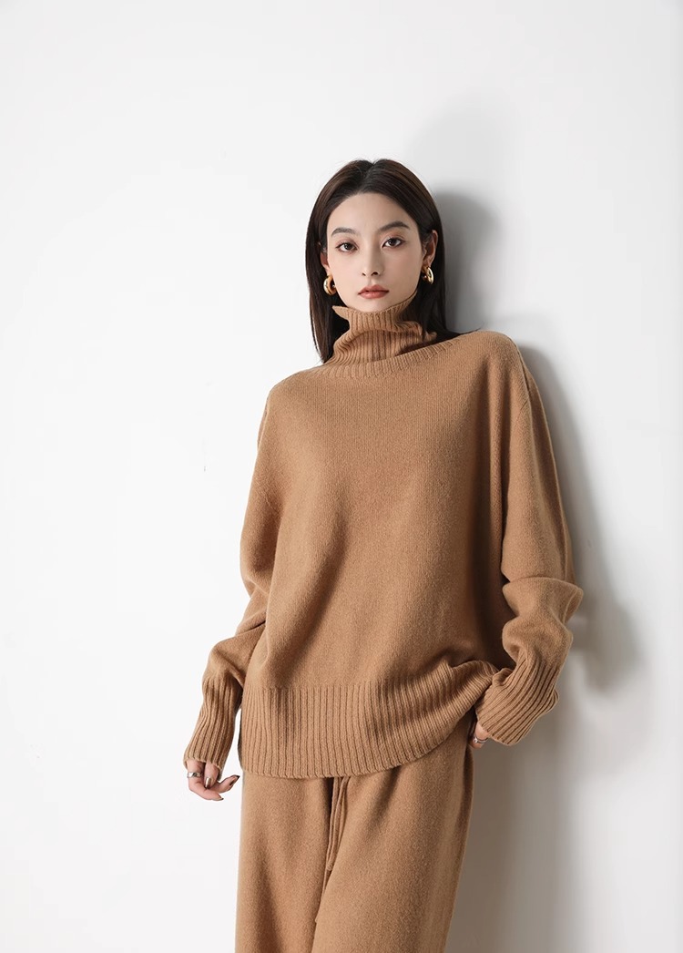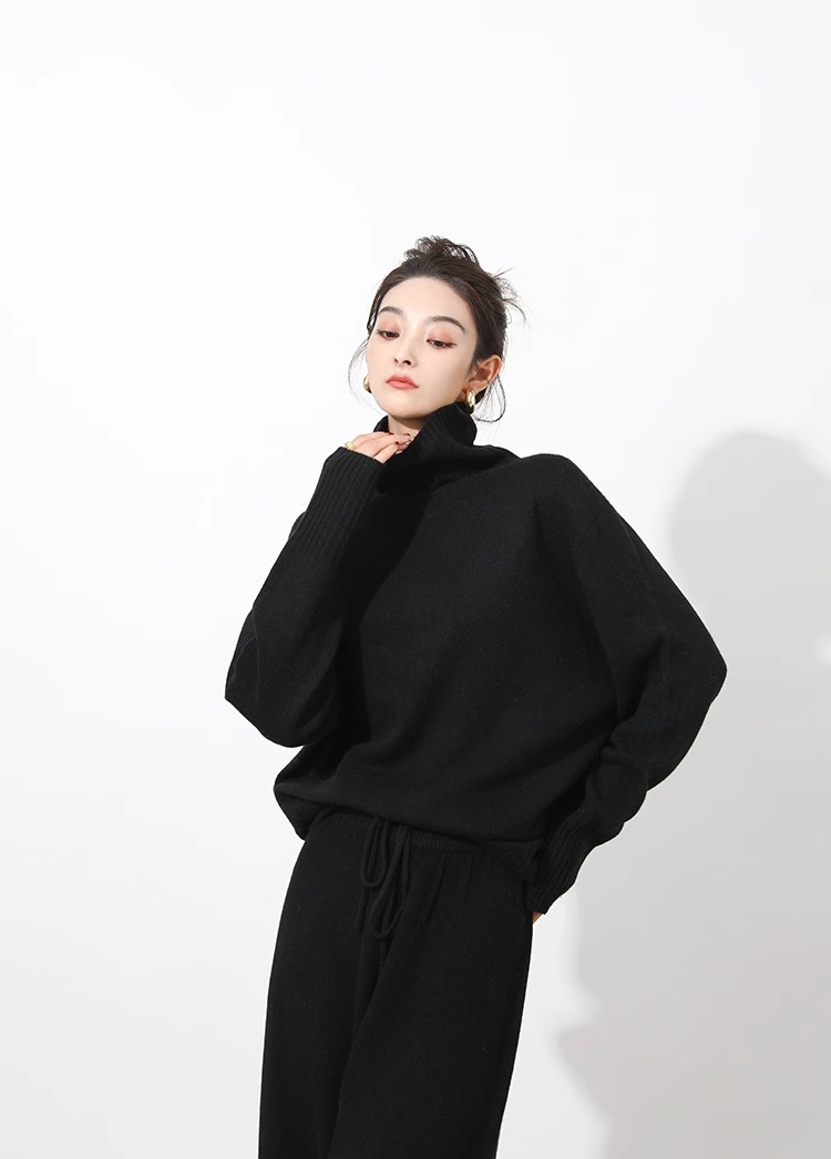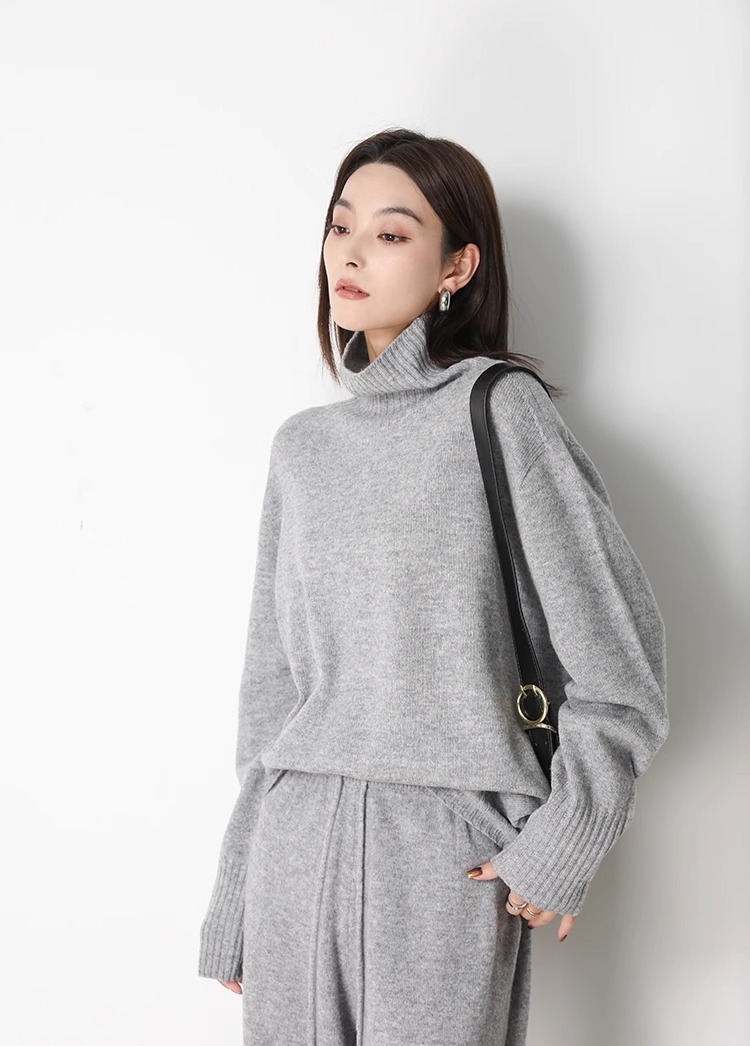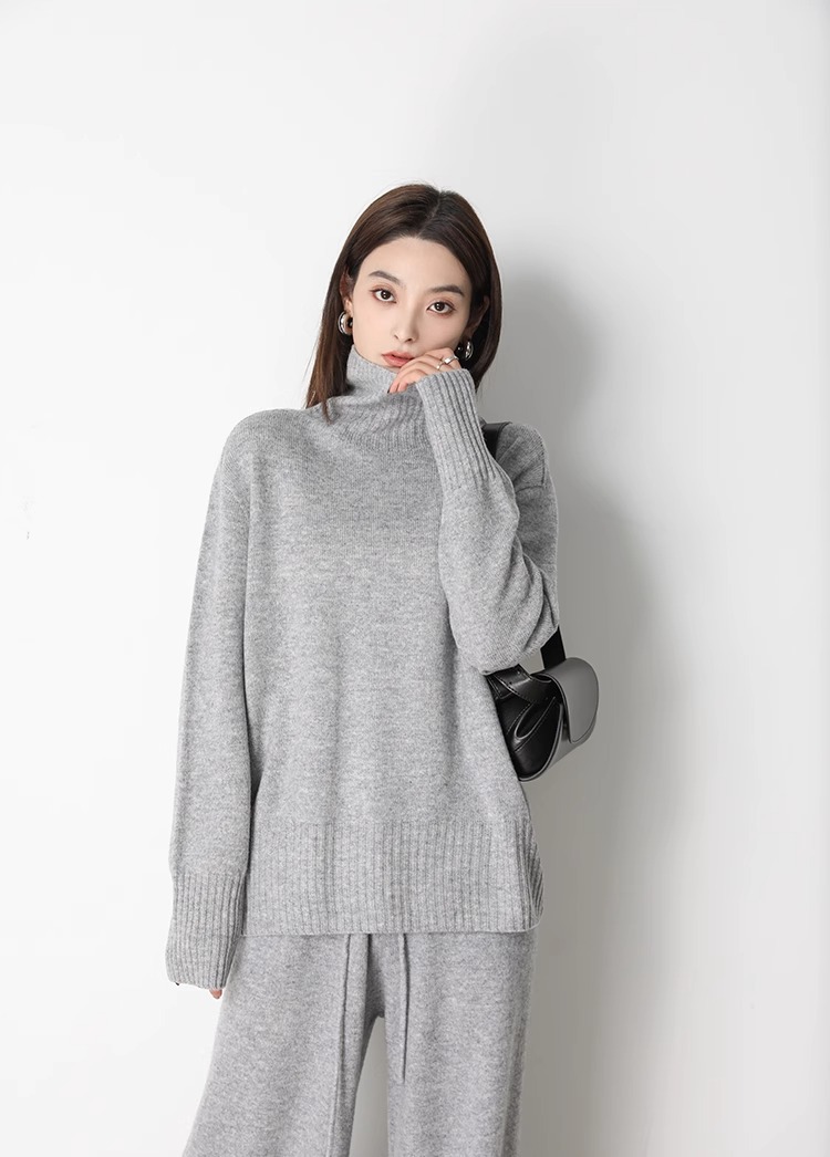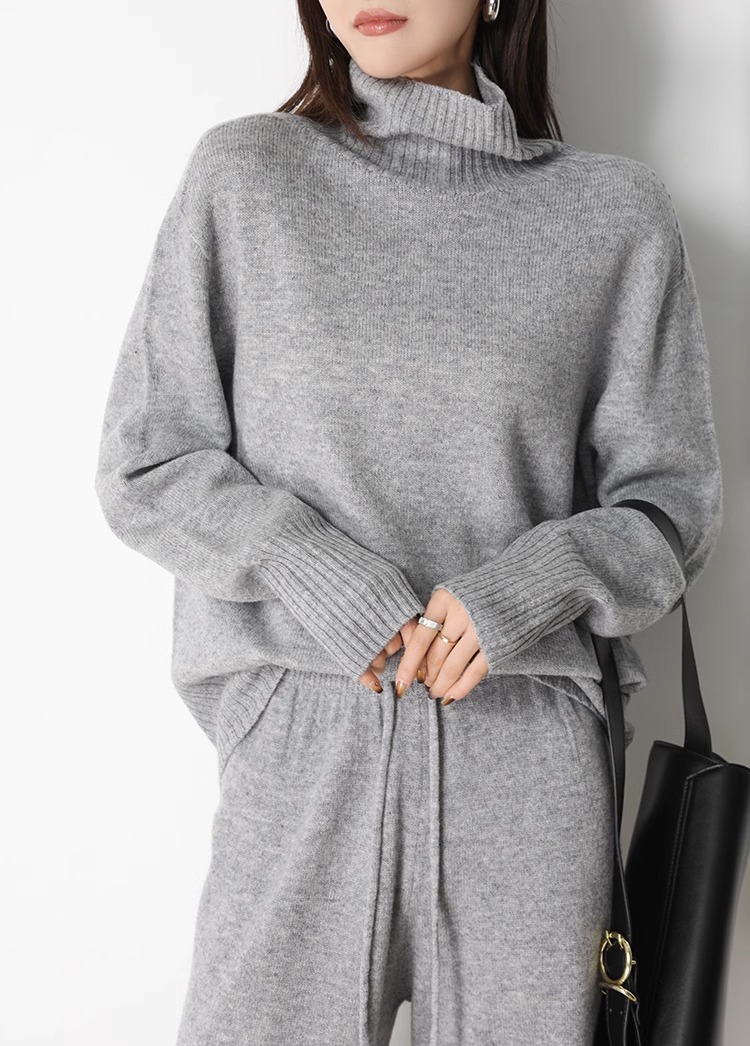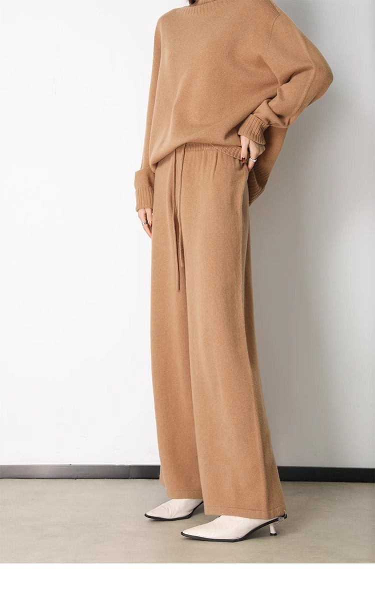 캐주얼한 올 울 스웨터 세트, 봄철 루즈핏 하이넥 이너 니트 와이드 팬츠 투피스 세트, 출퇴근룩스토어 가기