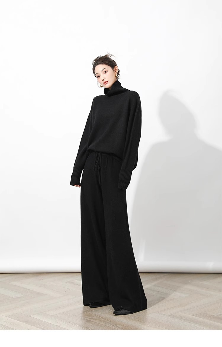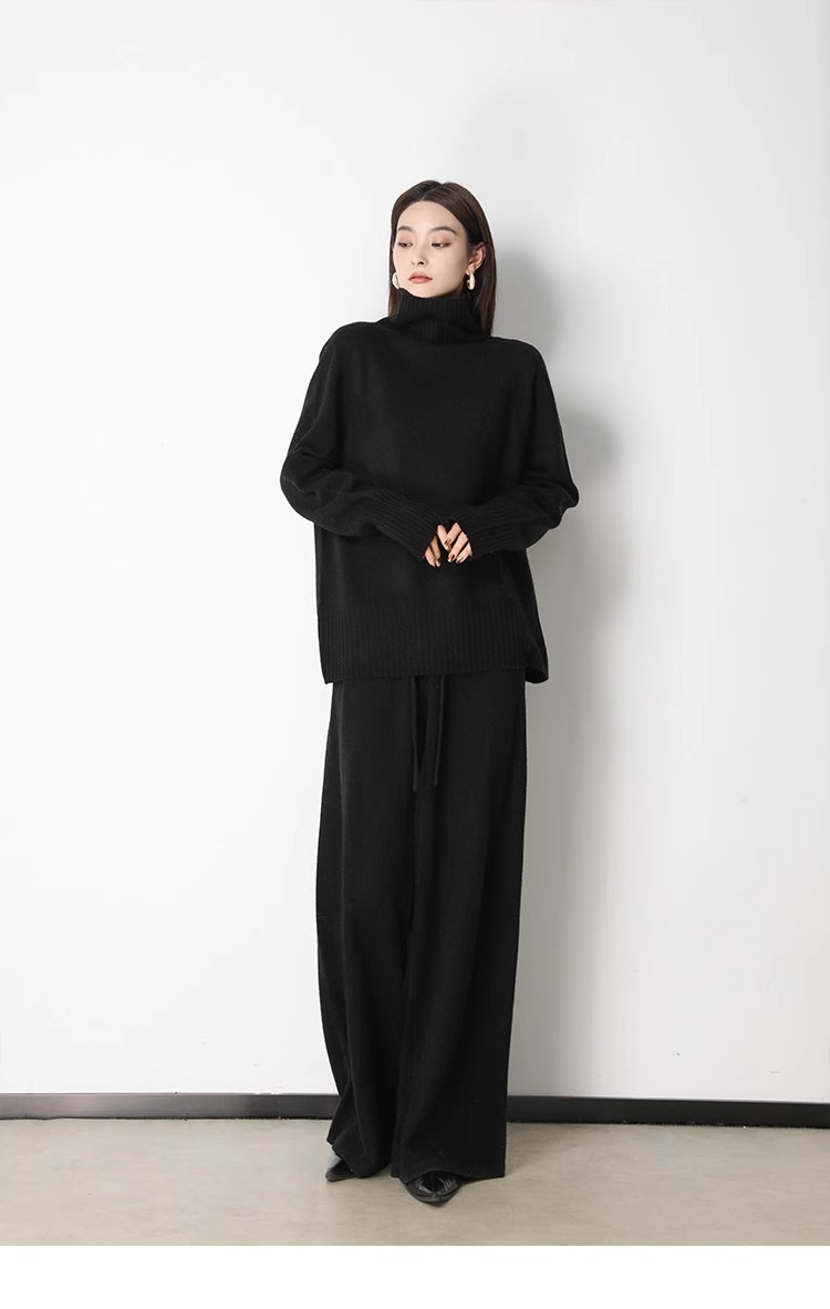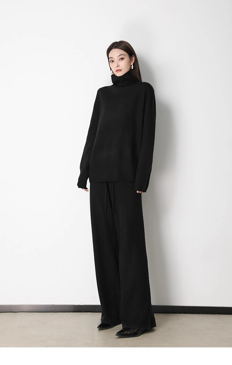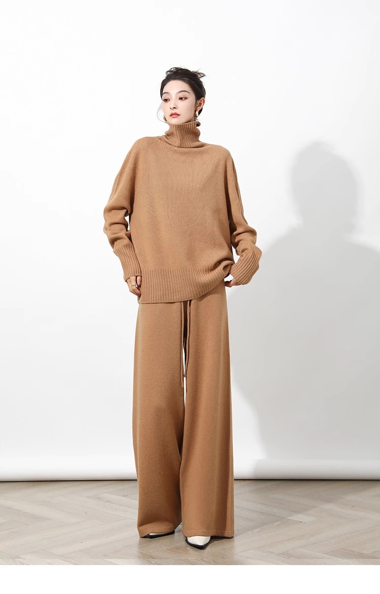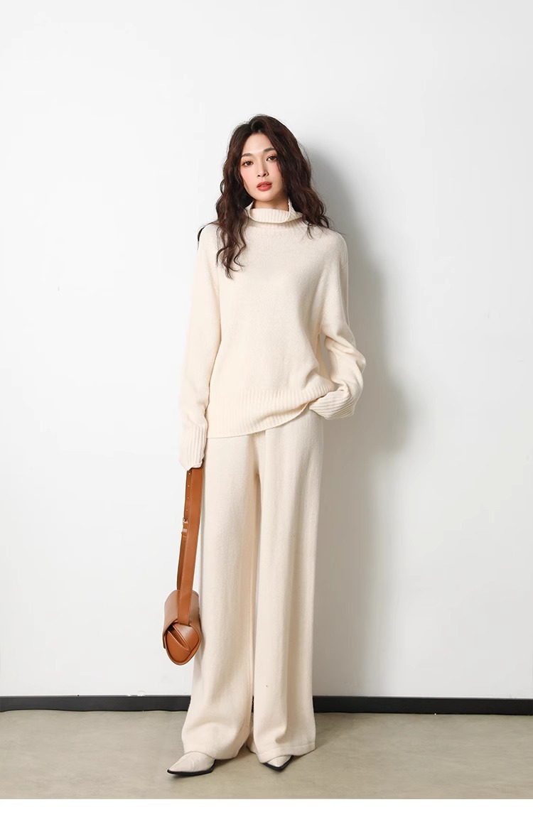 캐주얼한 올 울 스웨터 세트, 봄철 루즈핏 하이넥 이너 니트 와이드 팬츠 투피스 세트, 출퇴근룩
