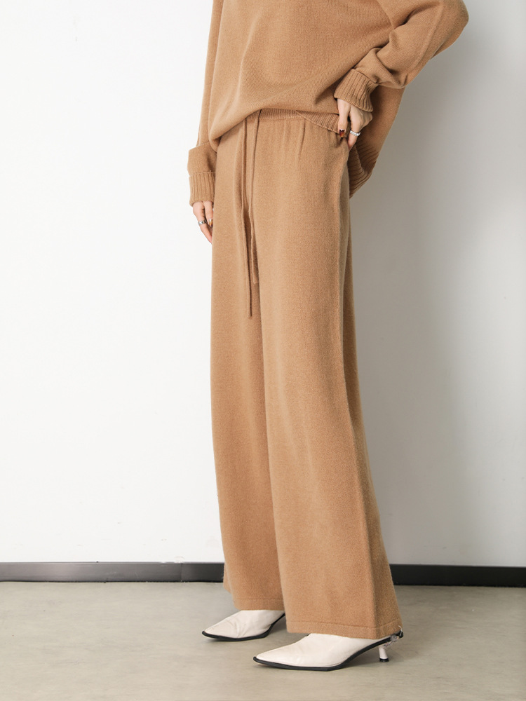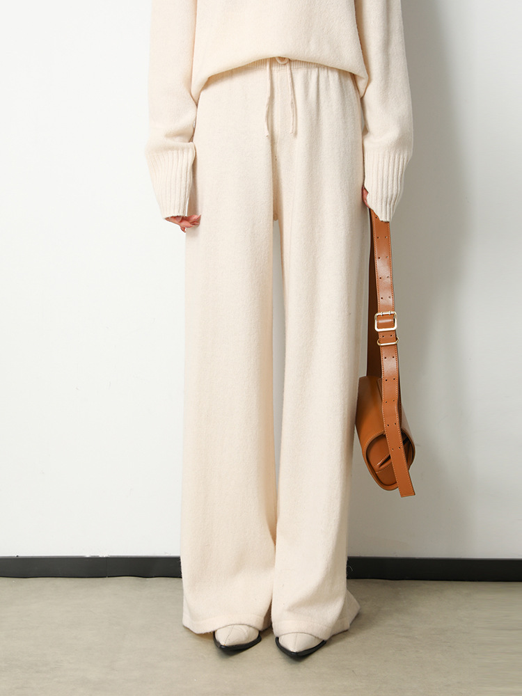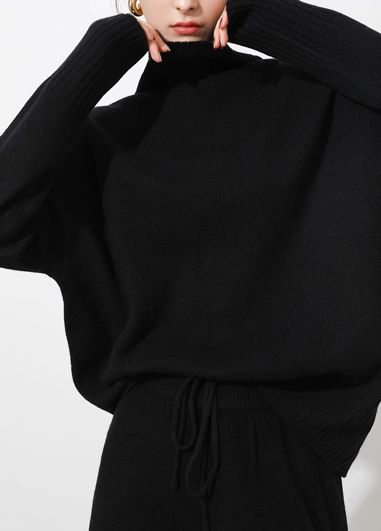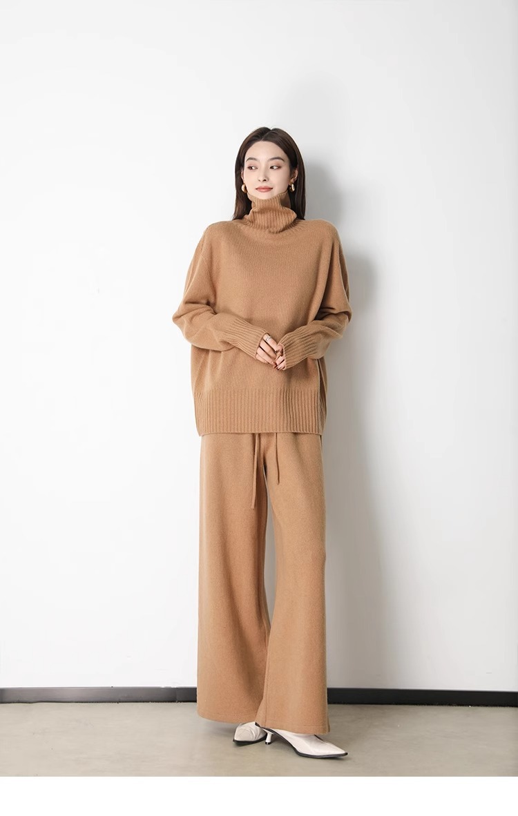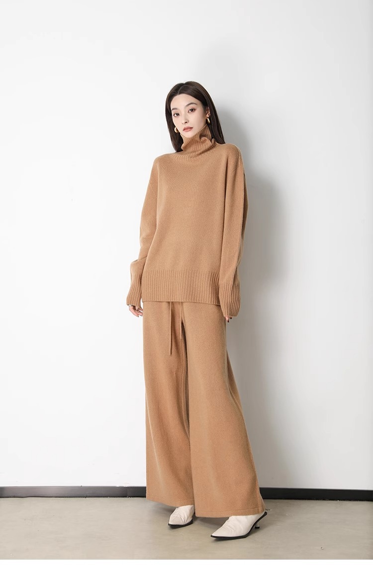 캐주얼한 올 울 스웨터 세트, 봄철 루즈핏 하이넥 이너 니트 와이드 팬츠 투피스 세트, 출퇴근룩
