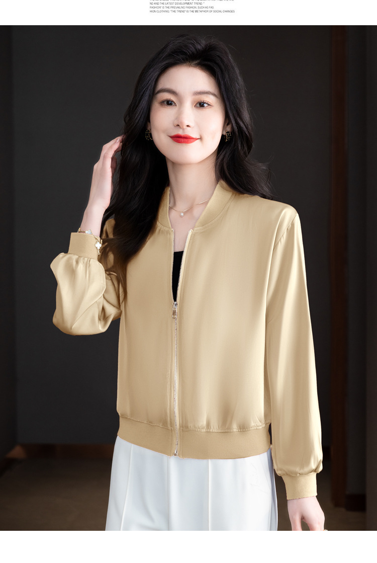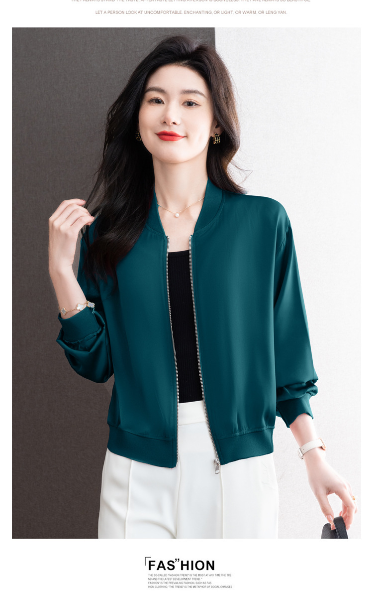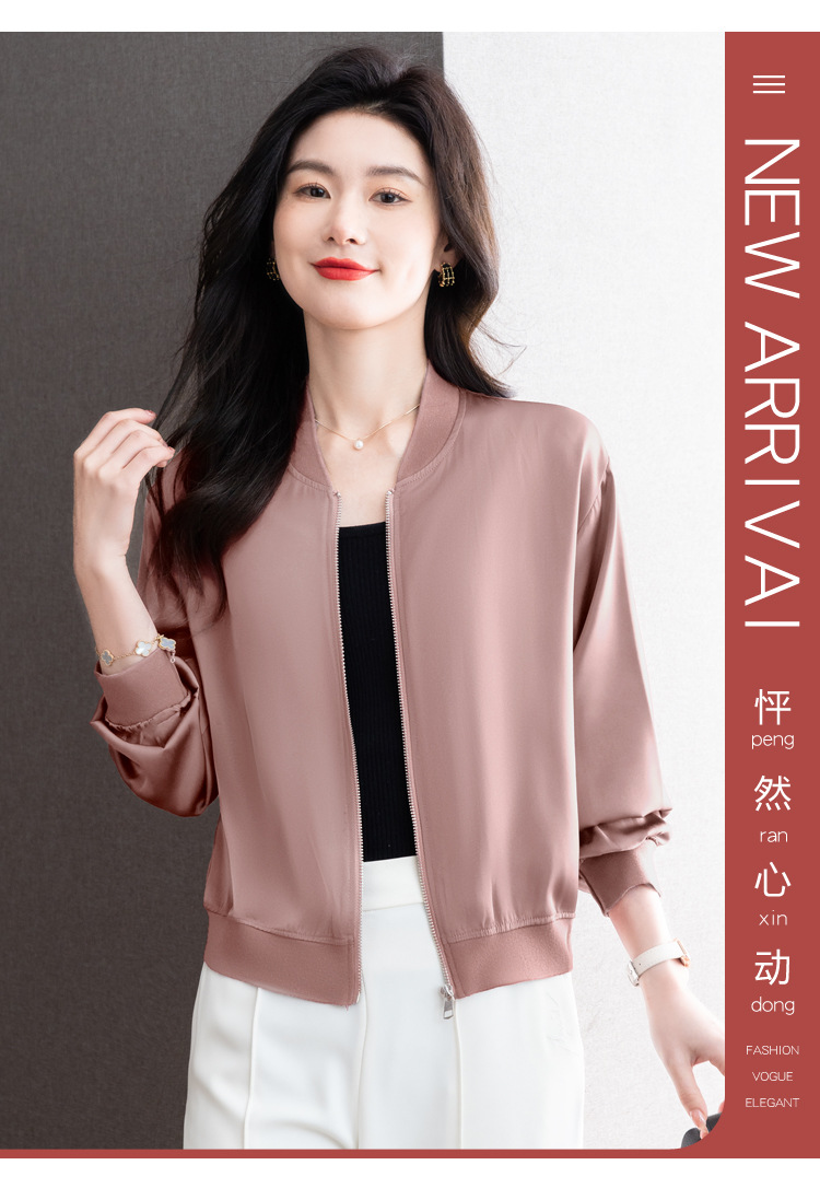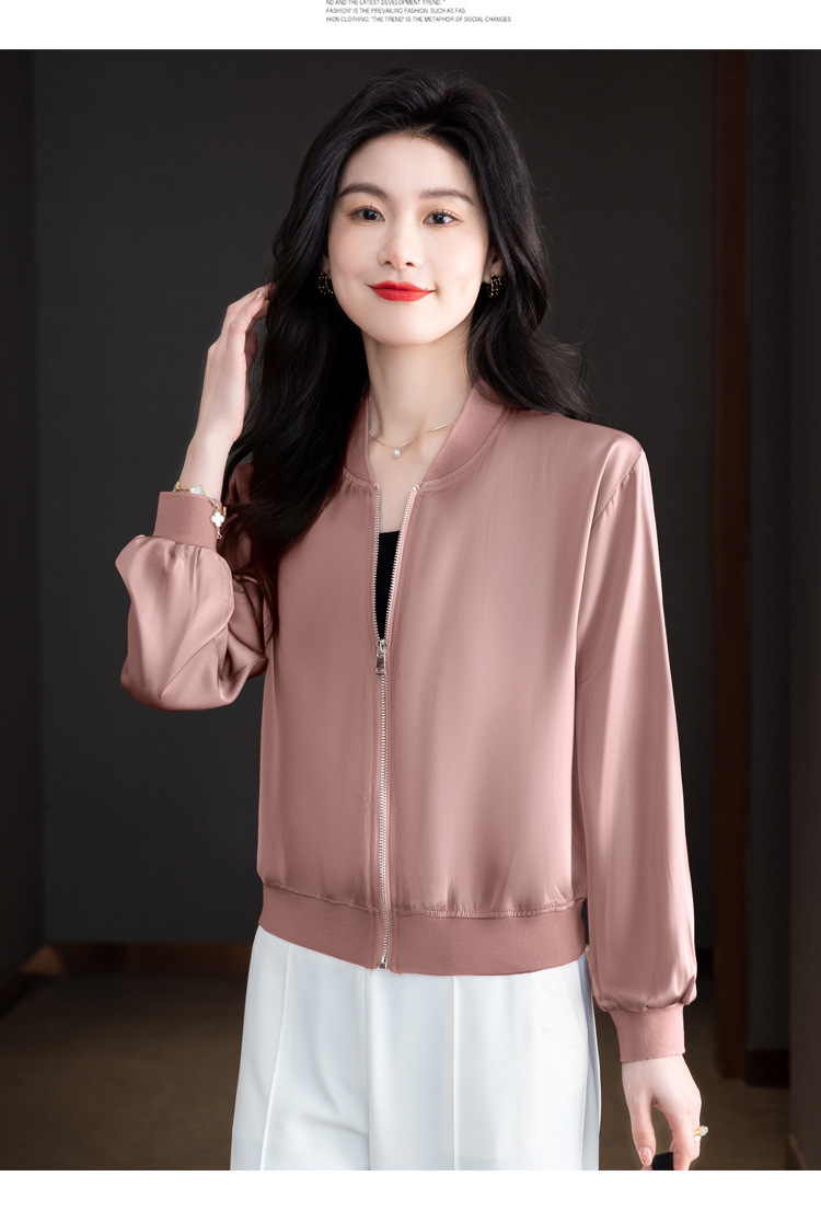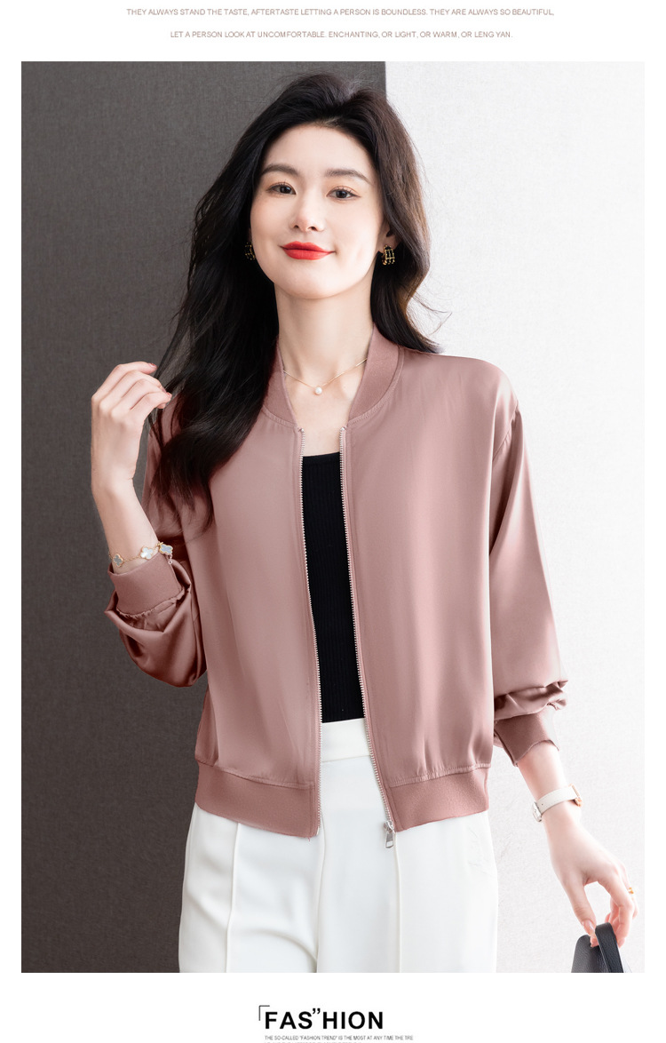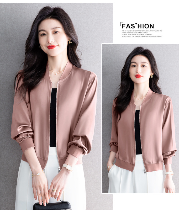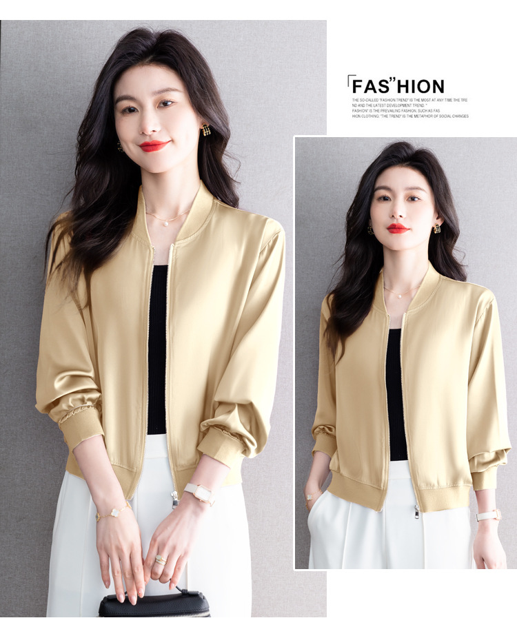아세테이트 새틴 야구 유니폼 2024 봄 새로운 캐주얼 느슨한 긴 소매 카디건 재킷 짧은 코트 여성용 탑