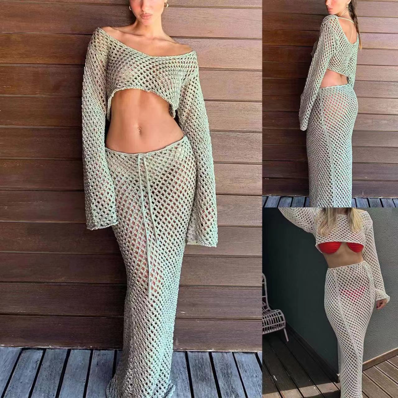 섹시한 우아한 투피스 유럽과 미국식 여성 쇼트 오픈 허리 긴팔 니트 하이 허리 엉덩이 스커트 세트스토어 가기