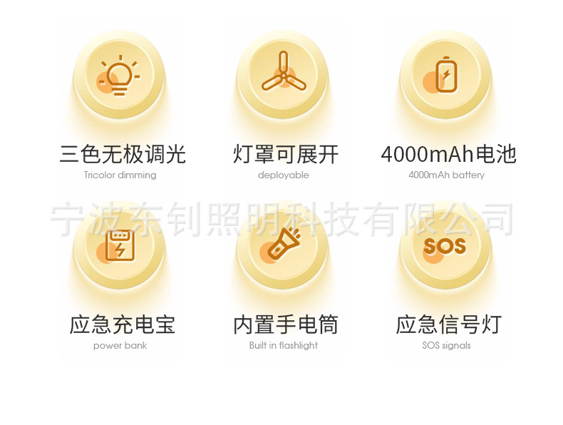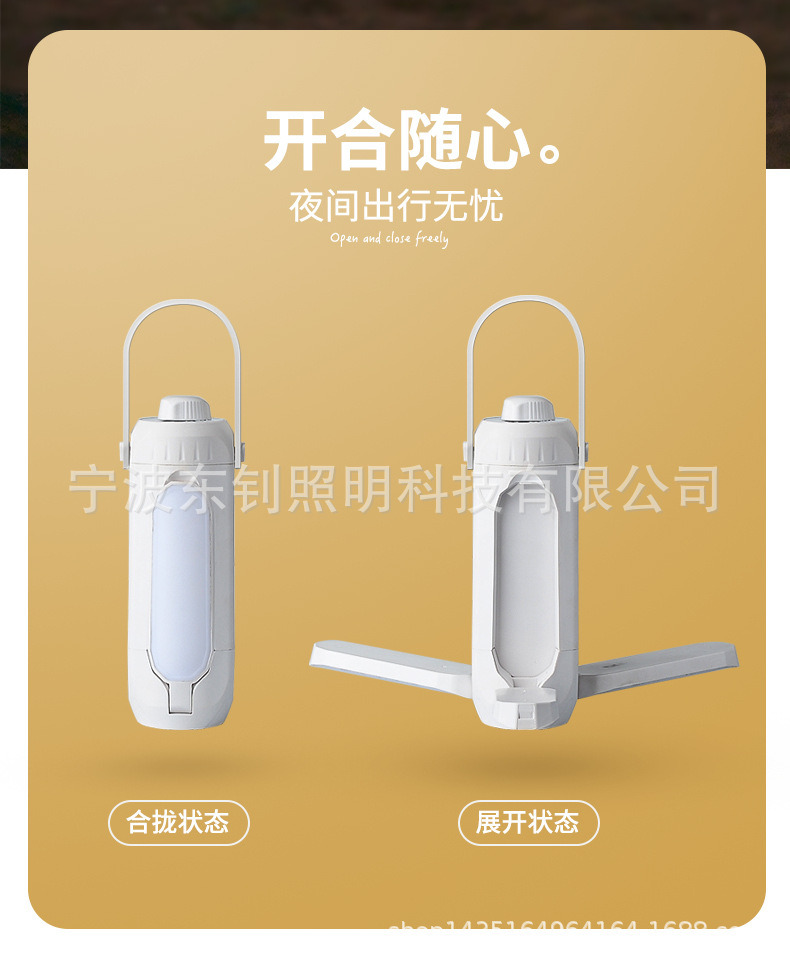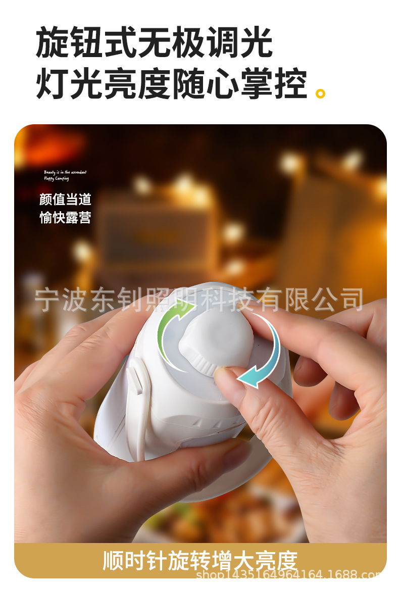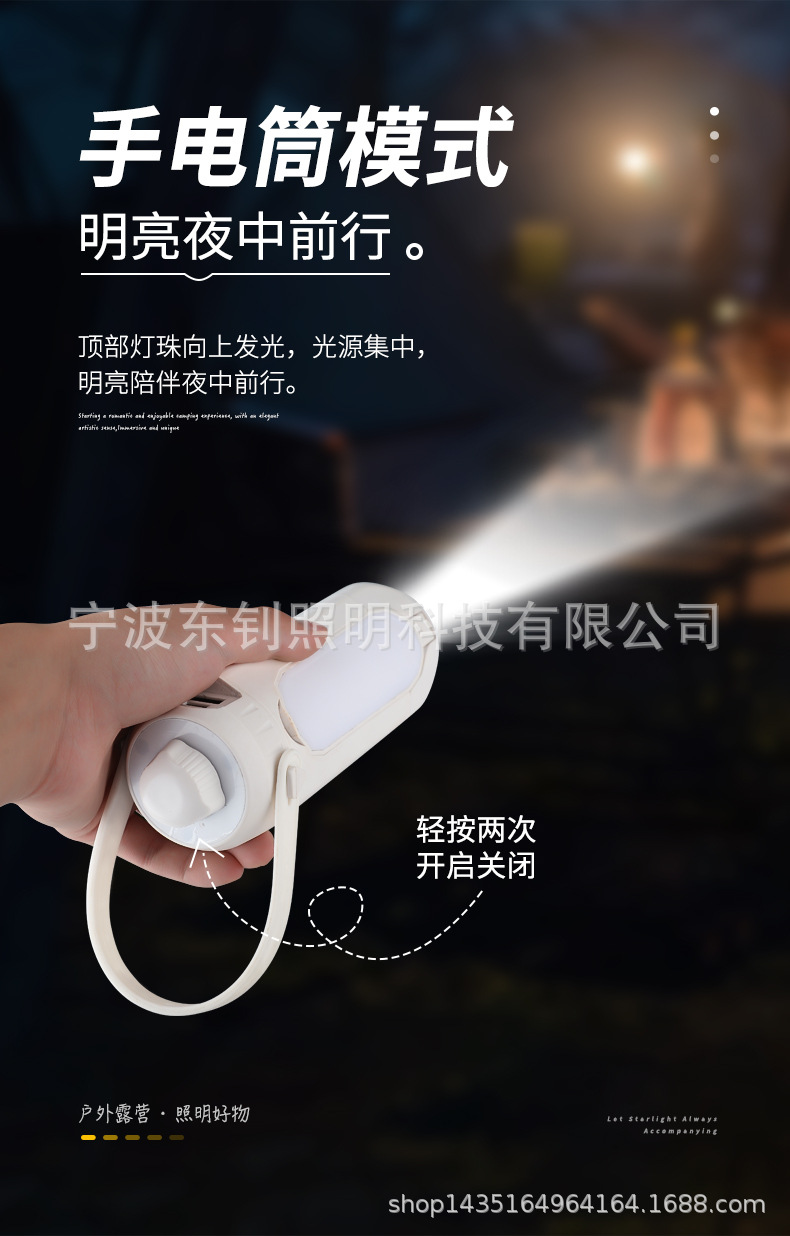 短按旋钮按键,开启第一种暖光模式,再次短按按键,切换到白光模式,再次短按按键,切换到混合光模式,再次短按按键,切换到红色sos灯模式;双击旋钮按键,开启手电筒,再次双击旋钮按键,关闭手电筒;旋转开关按键,可调整灯灯亮度;任何模式下,长按旋钮按键即可关闭所有灯光。