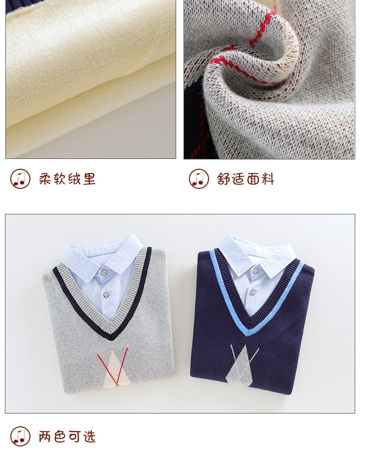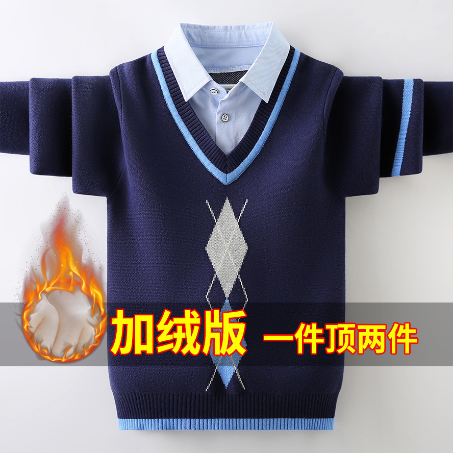 소년 스웨터 가을과 겨울 2023 새로운 잘 생긴 중형 및 대형 소년 겨울 양털 안감 두꺼운 셔츠 칼라 풀오버 바닥 셔츠