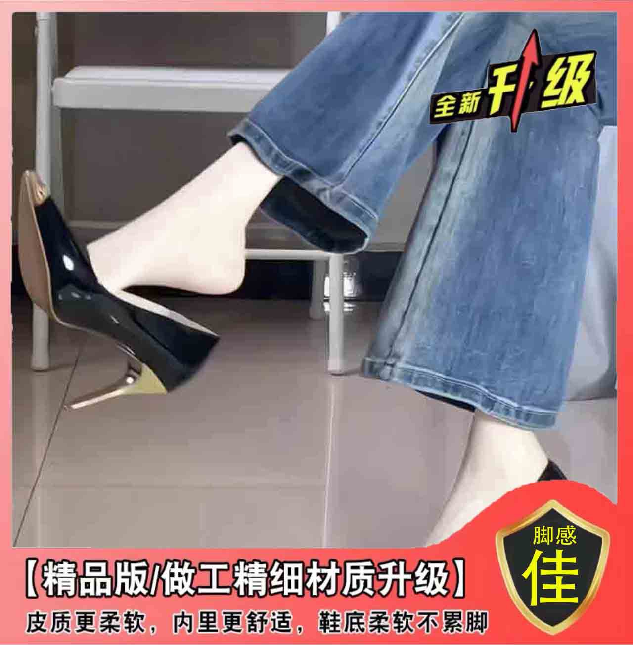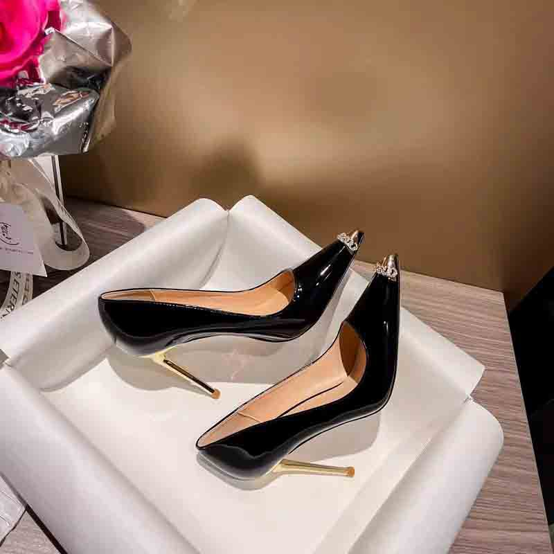 프랑스 스타일 블랙 하이힐 여성 2023 새로운 하이 엔드 센스 디자인 센스 니쉬 메탈릭 뾰족한 섹시한 스틸레토 힐스토어 가기