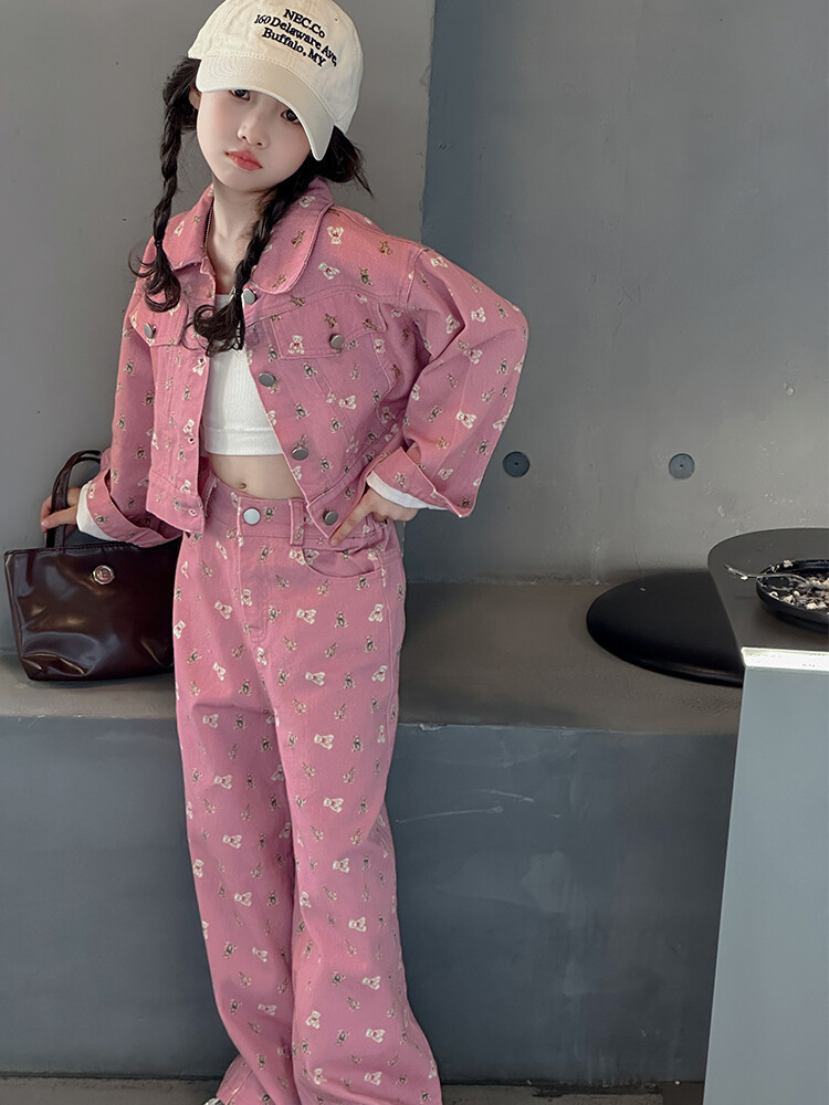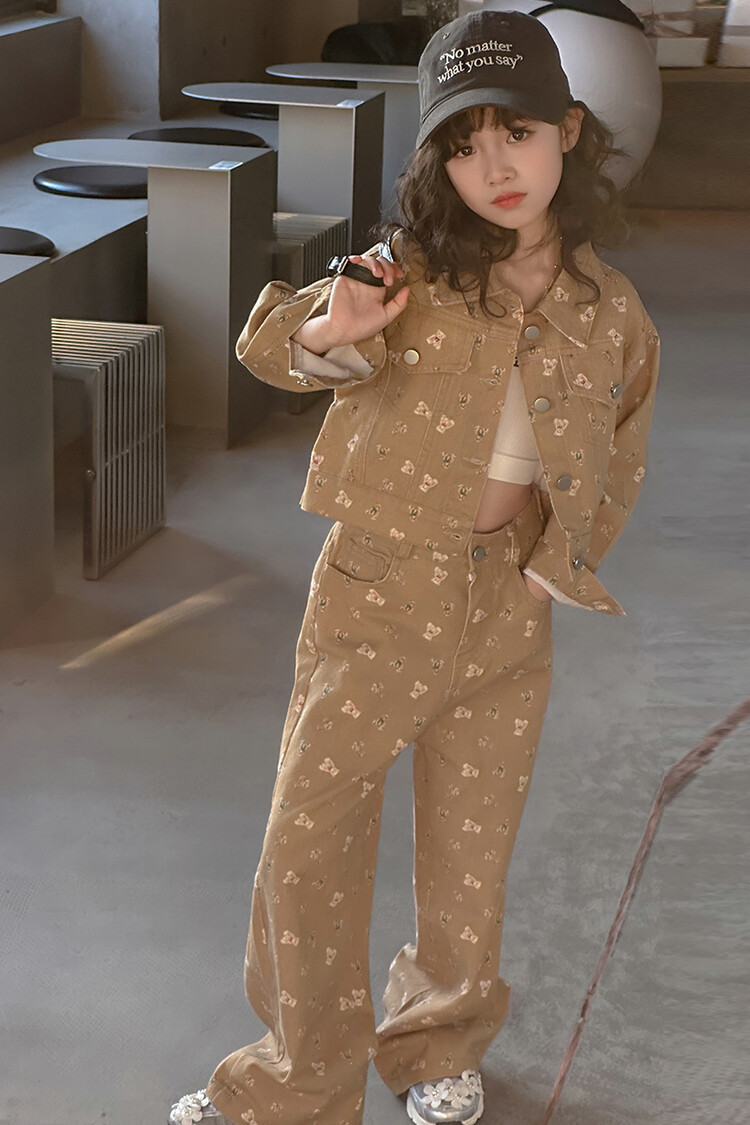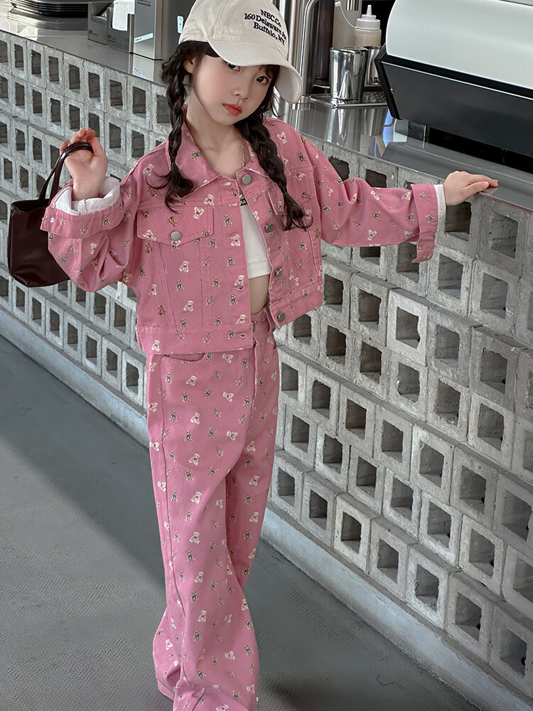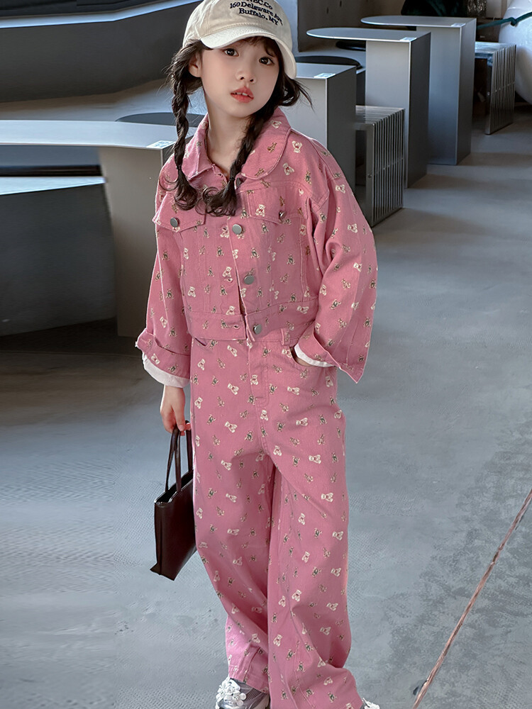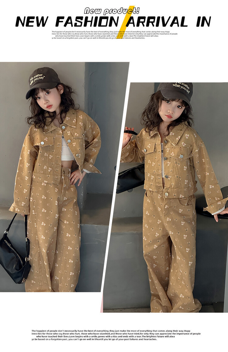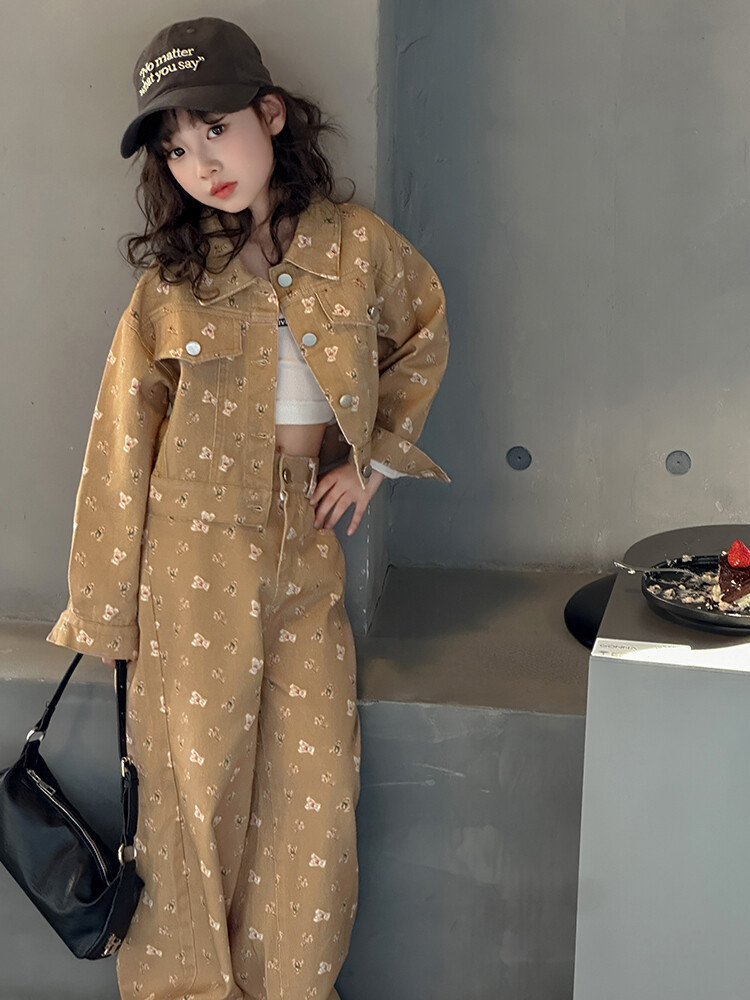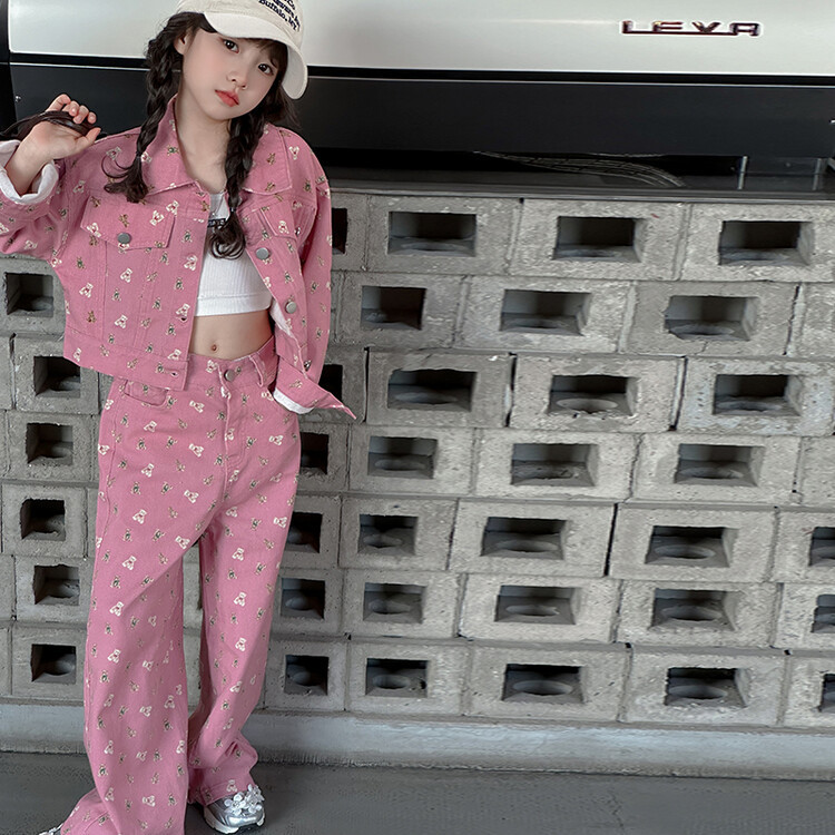 국경 간 어린이 봄 2024 년 새 소녀 세트 서양식 복고풍 한국식 워시 코튼 얇은 데님 투피스 세트