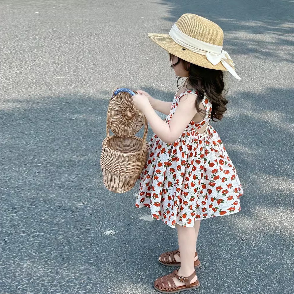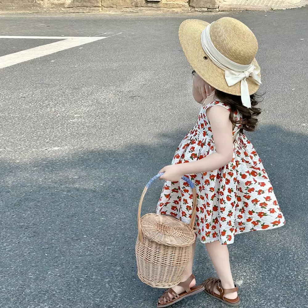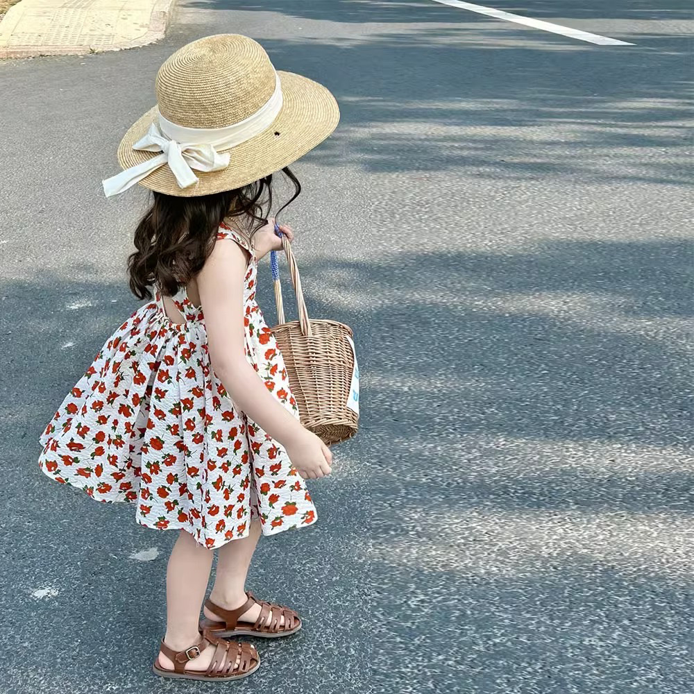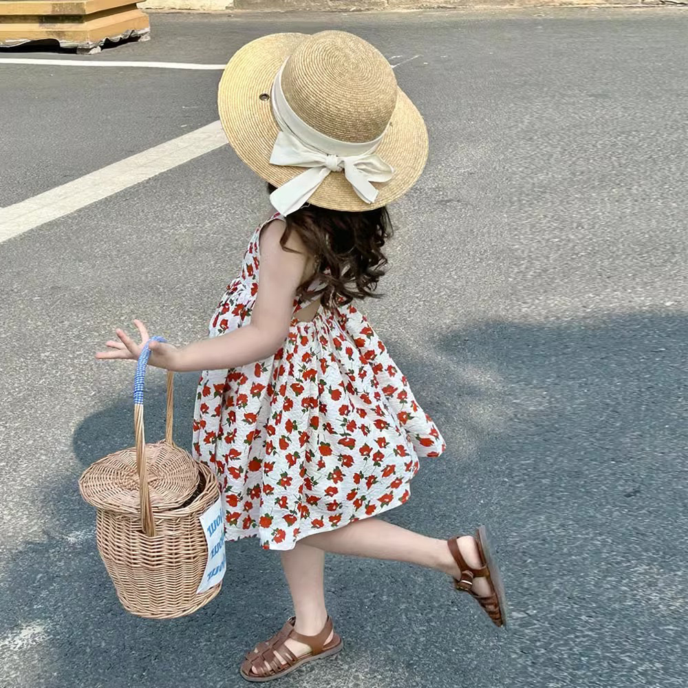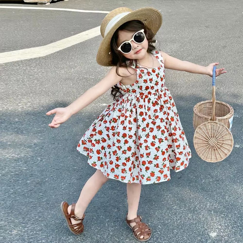 소녀 서스펜더 스커트 여름 새로운 달콤한 꽃 크로스 조끼 어린이를위한 비치 공주 원피스 원피스 배달