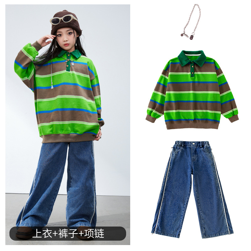 • 8330 녹색 줄무늬 셔츠 + 7038 청바지 + 목걸이