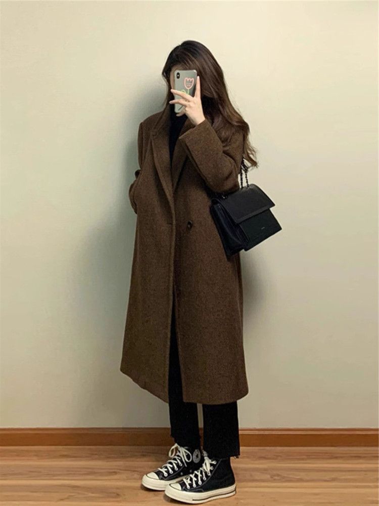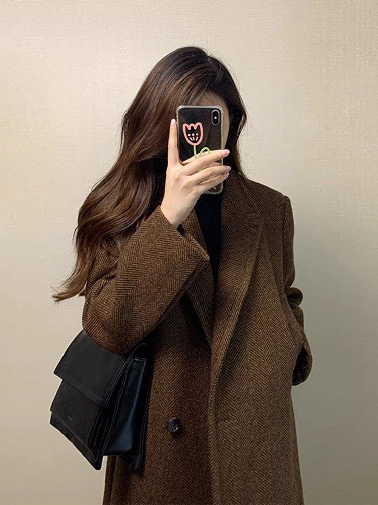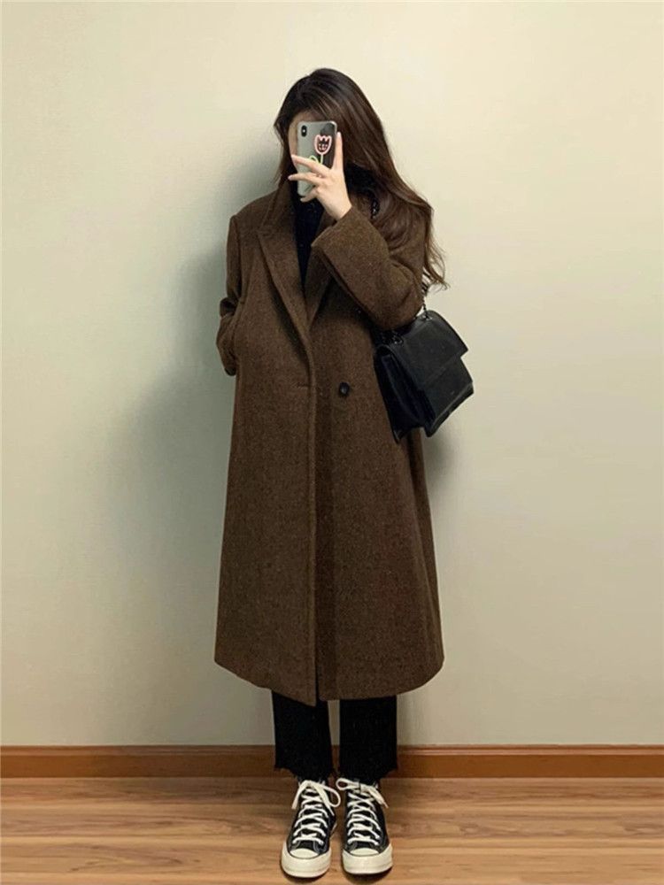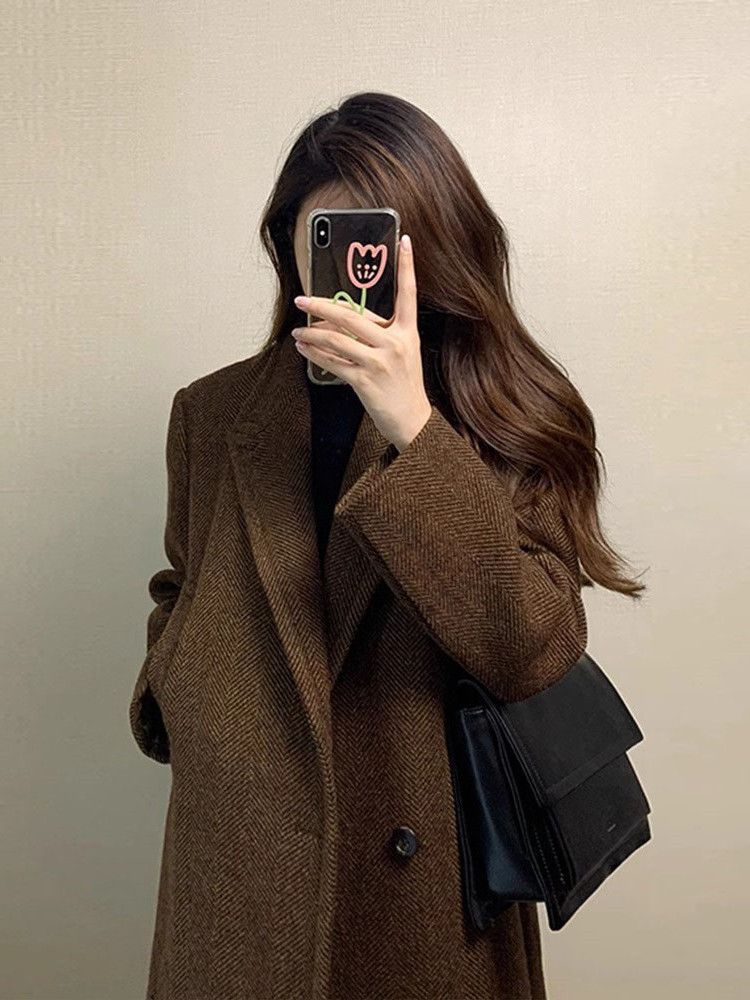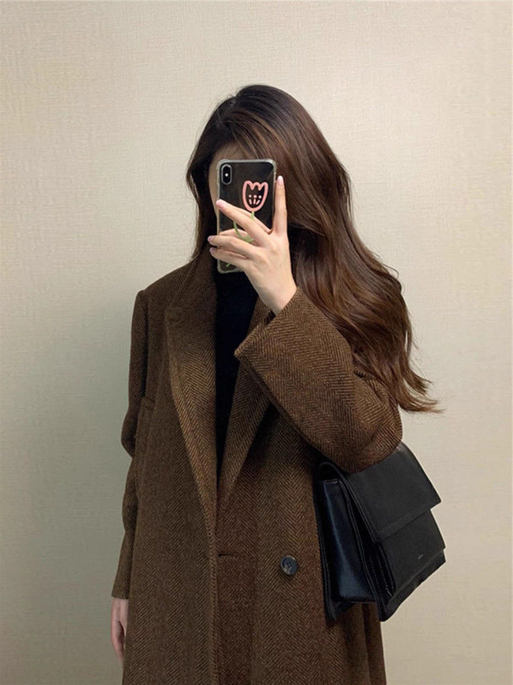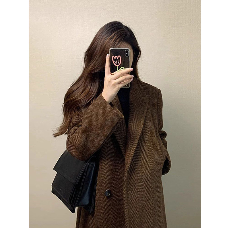 한국 스타일 정장 칼라 고급 모직 코트 여성용 가을 겨울 2025년 신상품 무릎 위 중간 길이 모직 코트스토어 가기