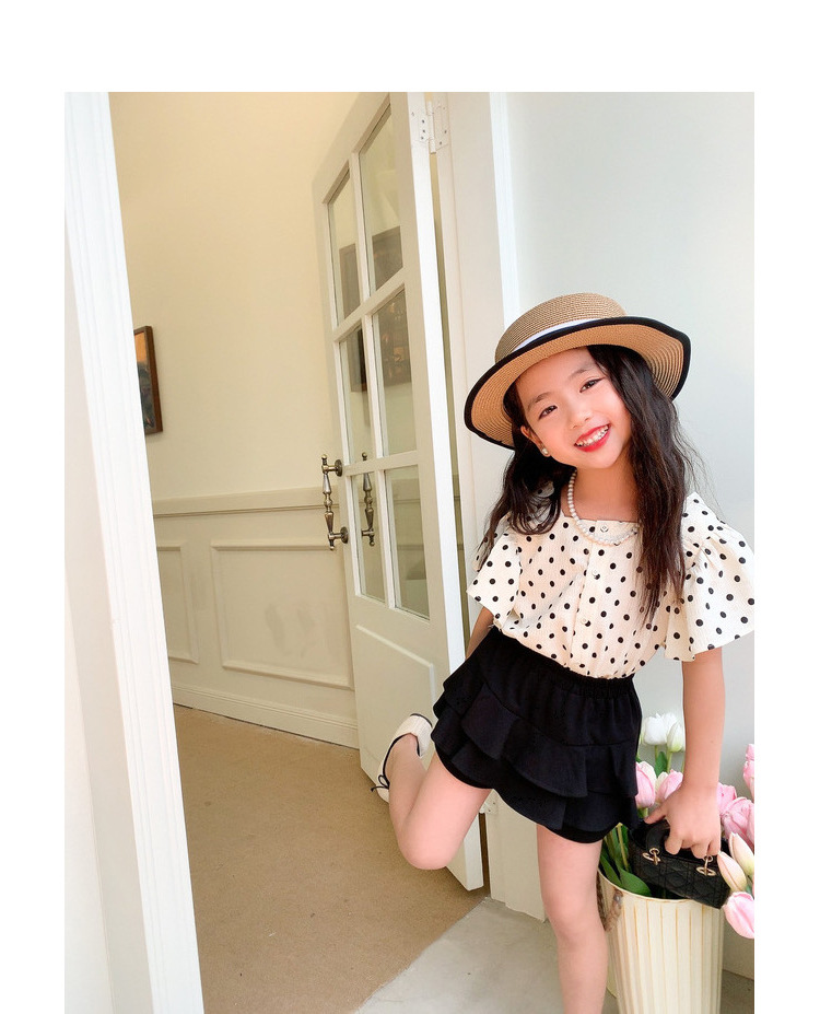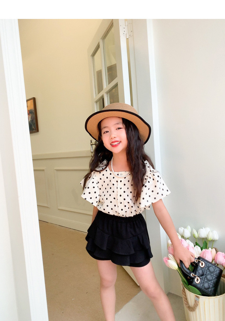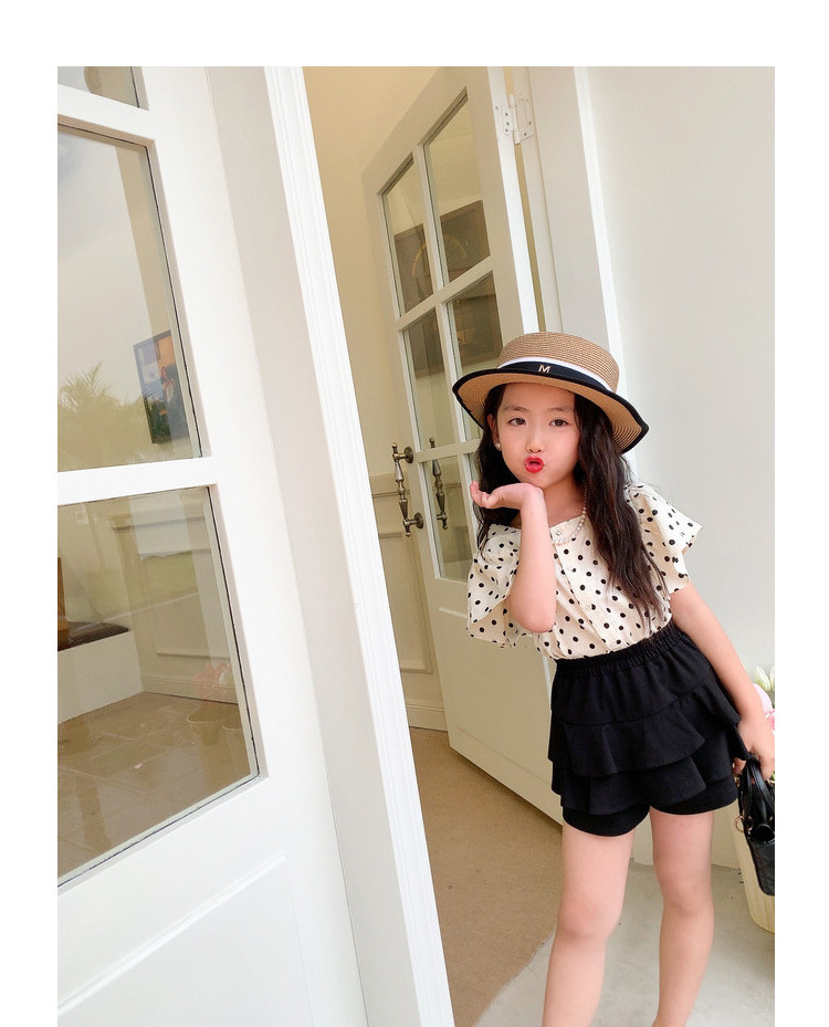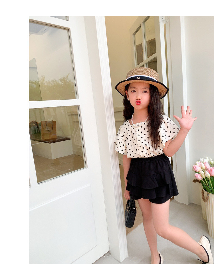 소녀들의 세트 여름 새로운 달콤한 폴카 도트 퍼프 슬리브 탑 + 퀼로트 2 피스 세트