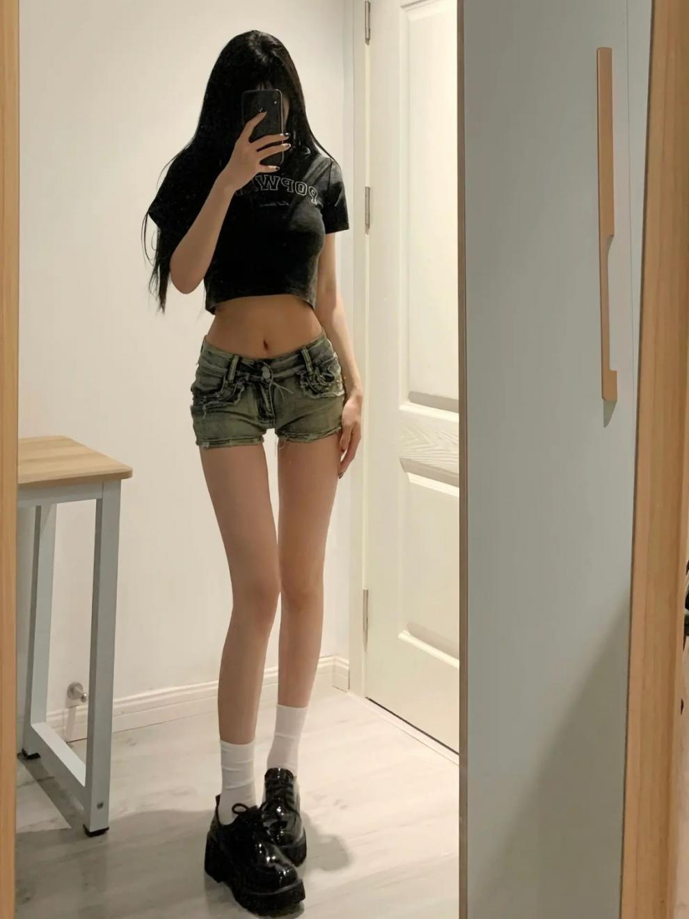 허리가 낮은 바지 짧은 미국 핫 걸 Liu Ding, 2024 년 봄과 여름에 데님 새로운 근접 슬리밍 백 엉덩이 와이드 레그 핫 공급