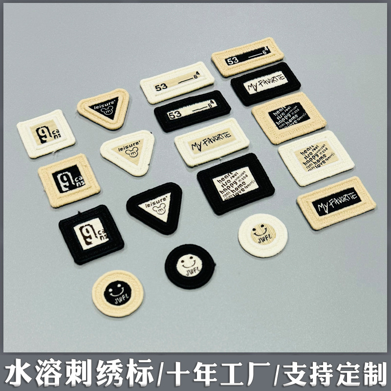 수용성 자수 라벨 10 년 공장 3 차원 컴퓨터 자수 라벨 의류 장식 라벨 폴리 에스테르 하이 퀄리티 천 라벨