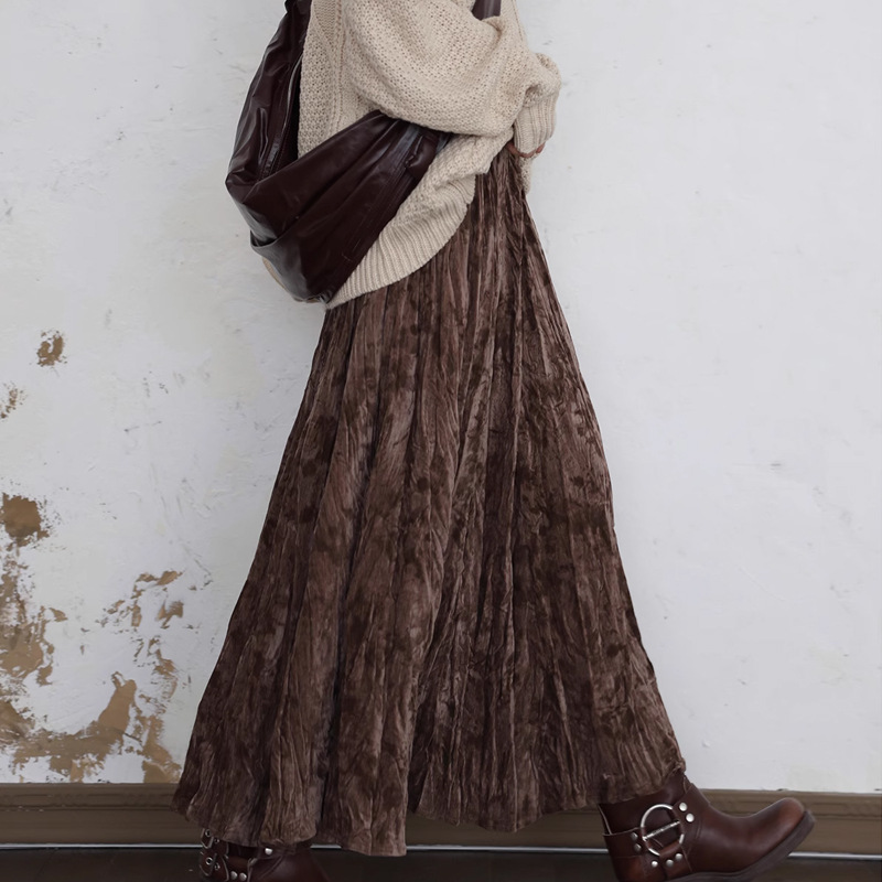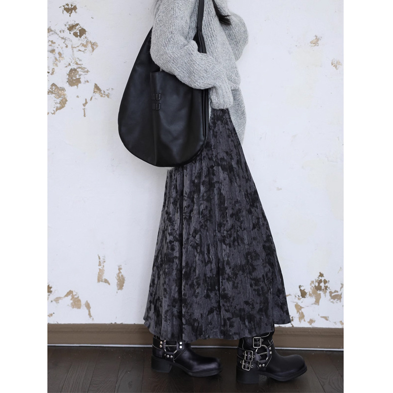 레트로 새로운 중국 스타일 프린트 두꺼운 벨벳 A 라인 우산 스커트 여성용 긴 스커트 탄성 하이 웨이스트 올 매치스토어 가기