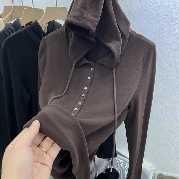 슈퍼 소프트 양면 벨벳 후드 긴 소매 기모 따뜻한 바닥 셔츠 가을과 겨울 새로운 서양식 작은 셔츠 올 매칭 탑스토어 가기