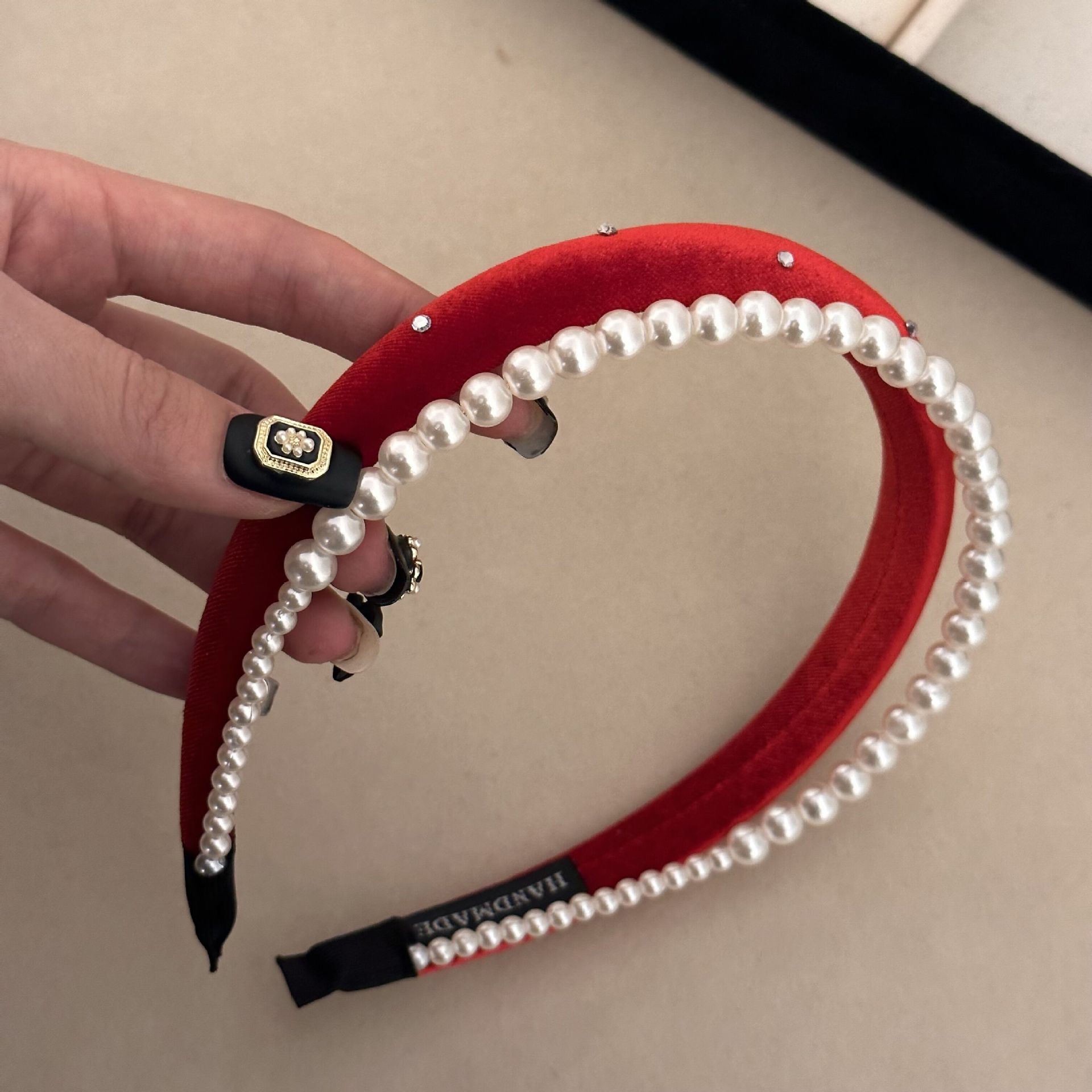 고급 새틴 진주 머리띠 한국 복고풍 이중층 머리 누르는 머리띠 여성 그물 레드 하이 해골 탑 머리띠 머리 액세서리