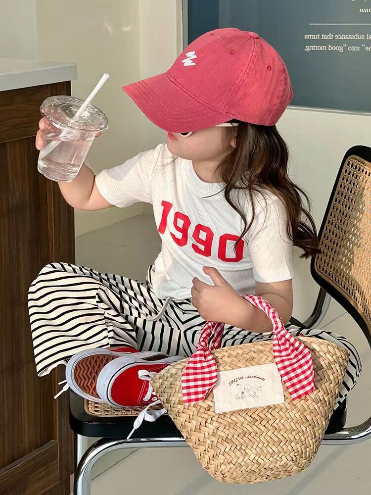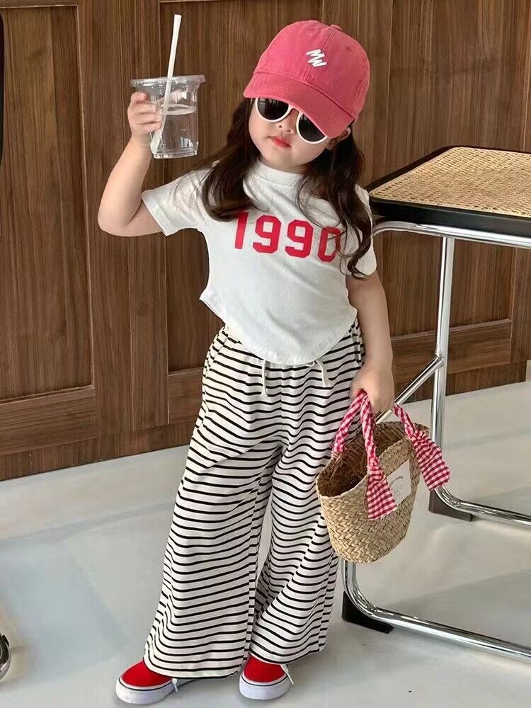 여자 여름 2024 서양식 불규칙한 반팔 티셔츠 줄무늬 넓은 다리 바지 한국 스타일 세트 소녀의 여름 세트