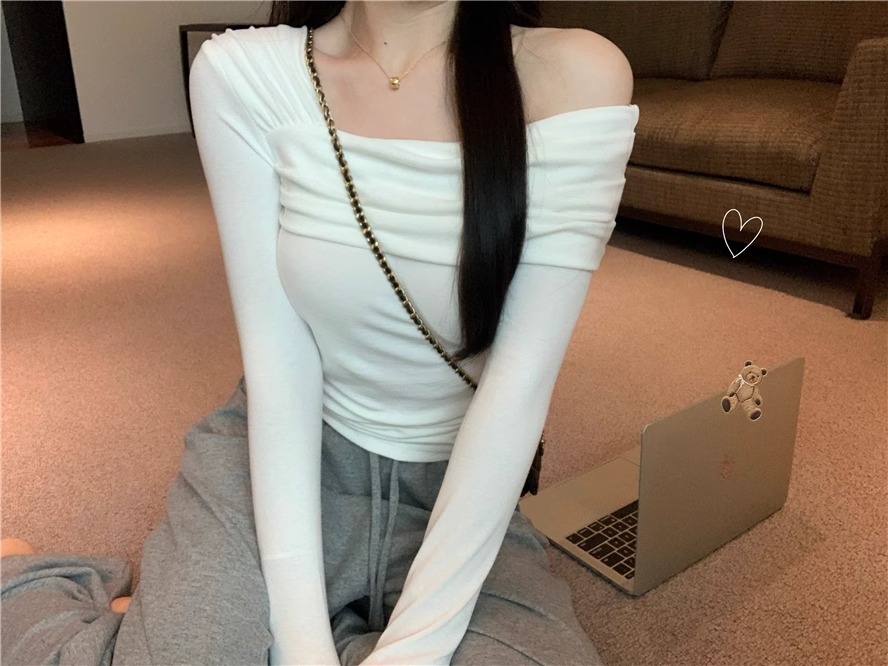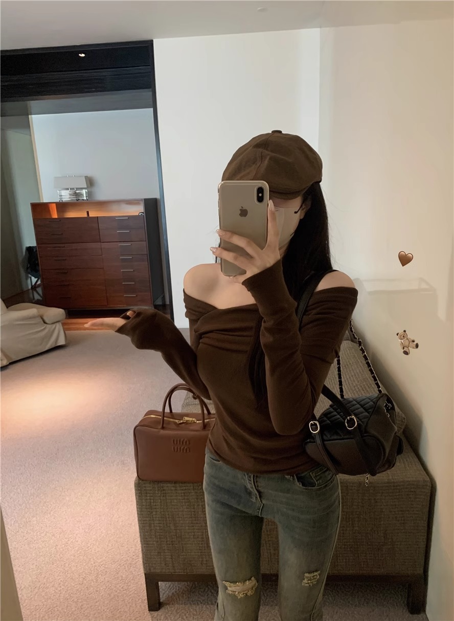 아메리칸 핫 걸 디자인 티셔츠 여성 봄과 가을 새로운 오프 숄더 우아한 슬림 시크한 바닥 셔츠 올 매치 탑