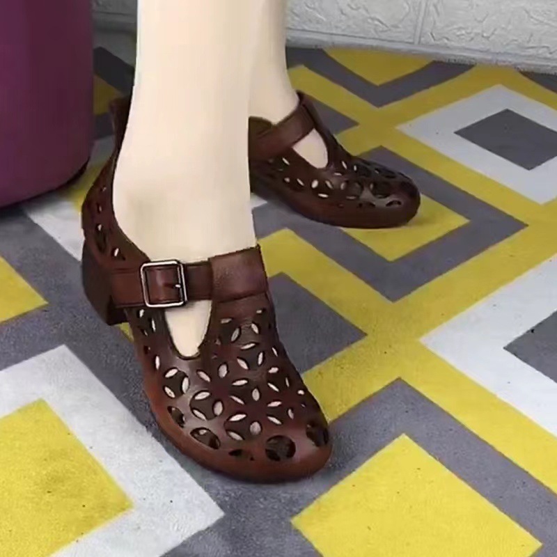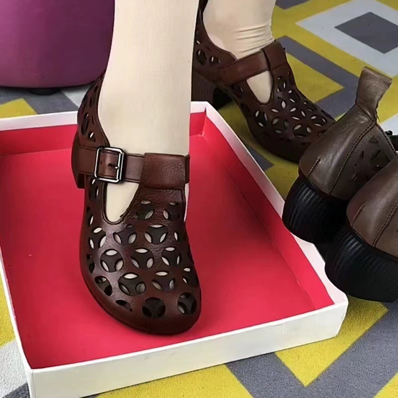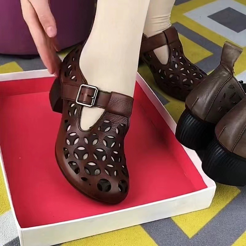 민족 스타일 복고풍 캐주얼 진짜 부드러운 가죽 신발 여성 2023 두꺼운 뒤꿈치 부드러운 바닥 어머니 신발 속이 빈 구멍 신발 도매스토어 가기