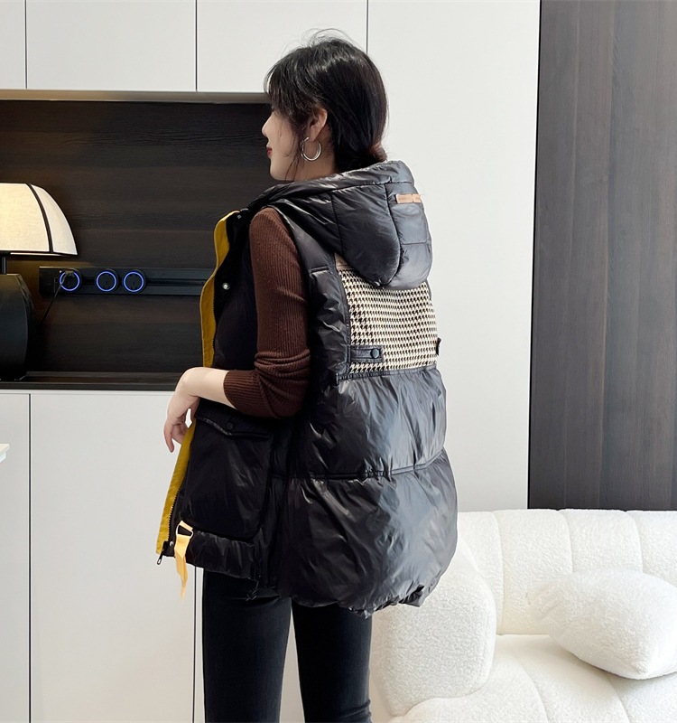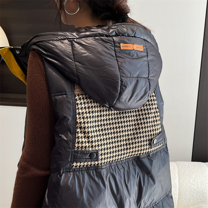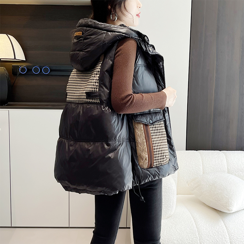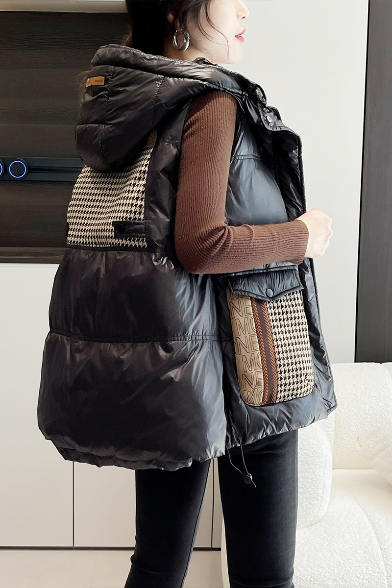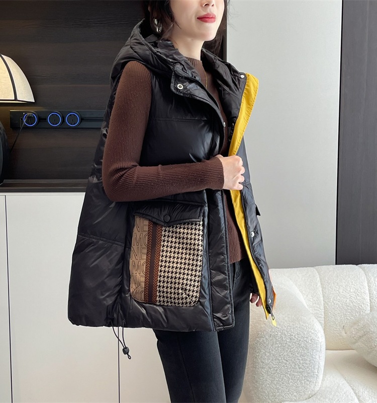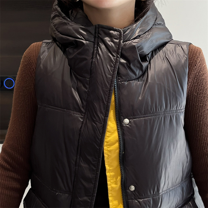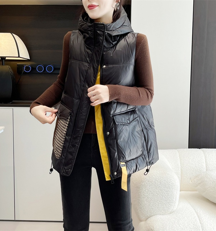 여성용 루즈한 컬러 매칭 후드 다운 조끼 2025 가을 겨울 신상 유럽 스타일 패션 화이트 덕 다운 재킷 조끼스토어 가기