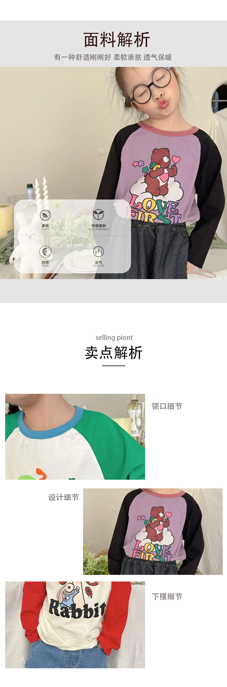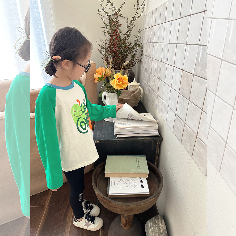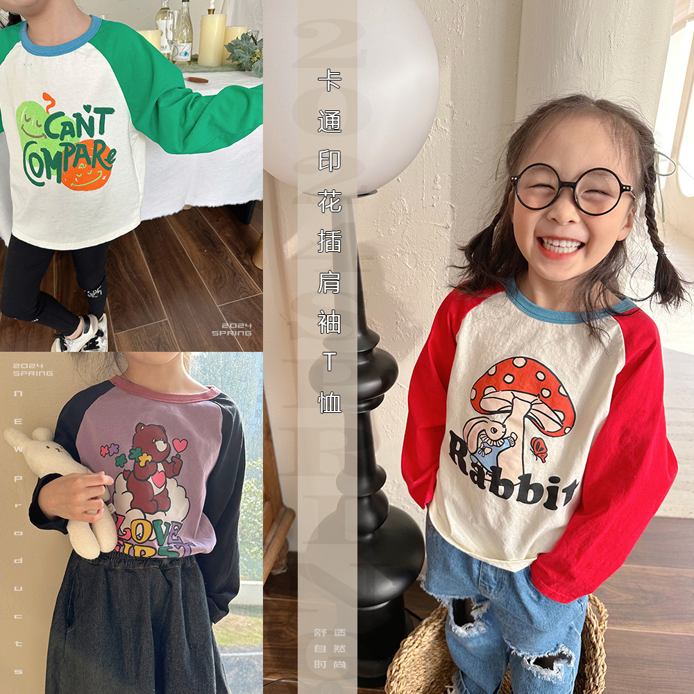 Zuoxiaoran 아동복 2024 봄, 가을 새로운 한국어 버전 아동용 긴팔 만화 프린트 티셔츠 소년 소녀 라글란 슬리브 T