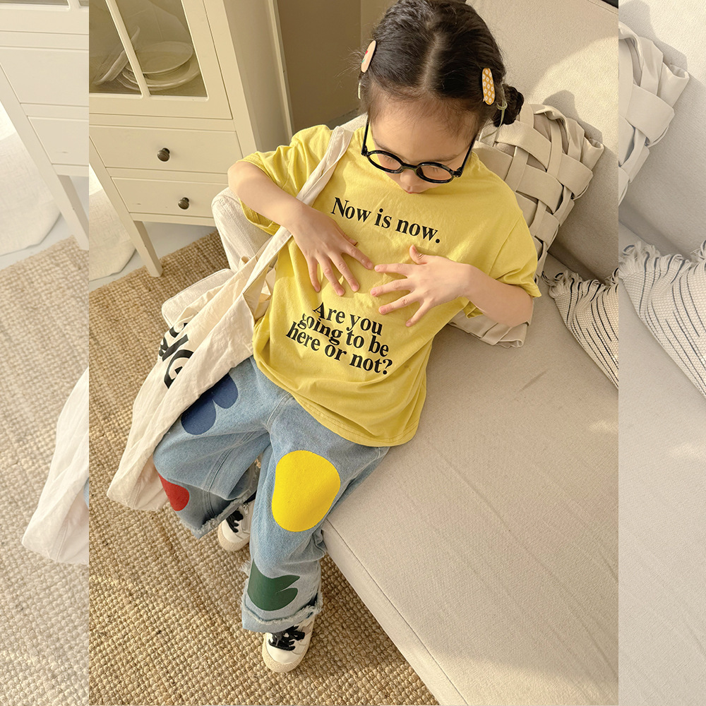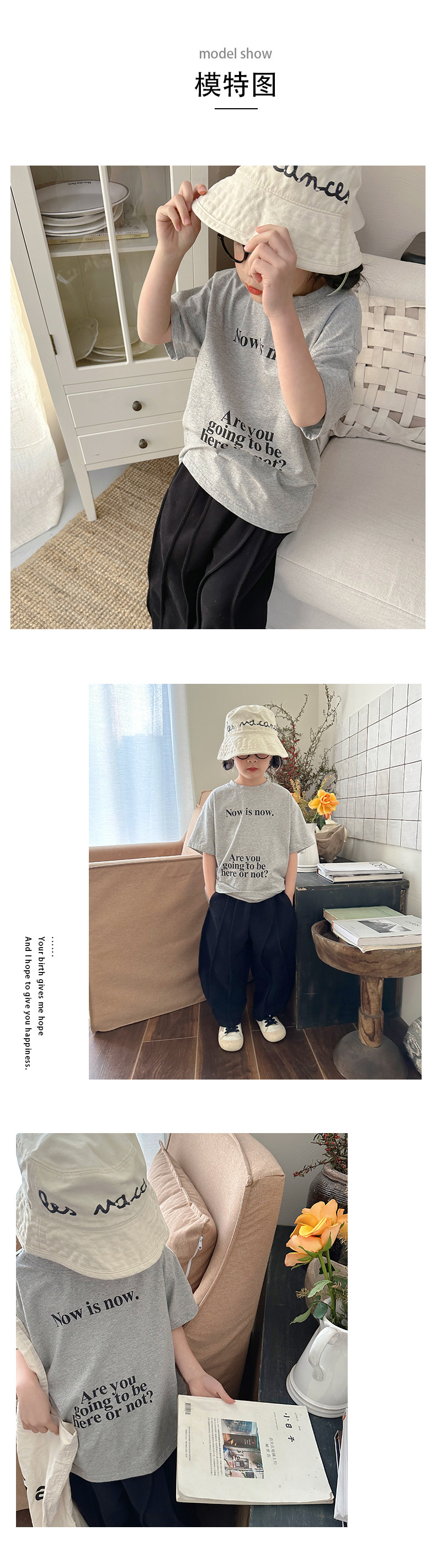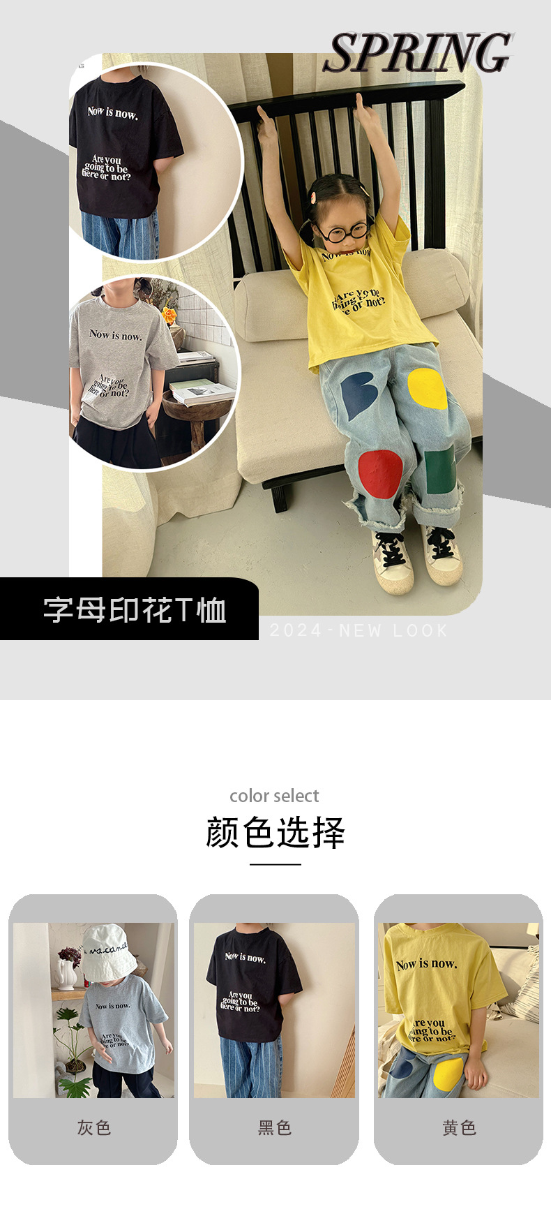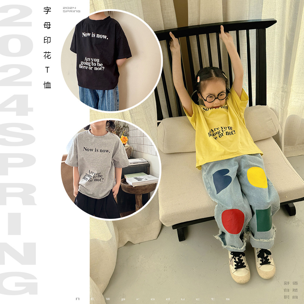 Zuo Xiaoran 2024 봄 한국식 어린이 편지 인쇄 티셔츠 패션 소년 소녀 짧은 소매 라운드 넥 티셔츠스토어 가기