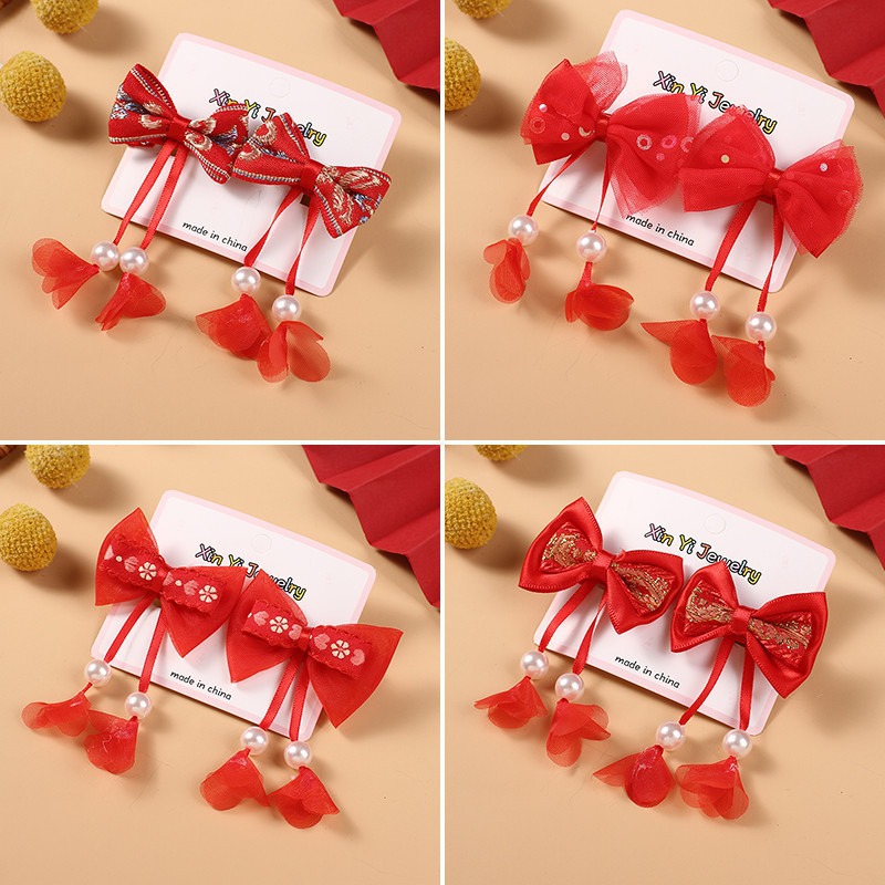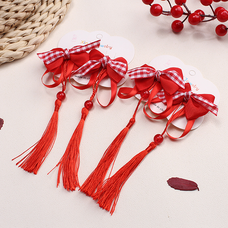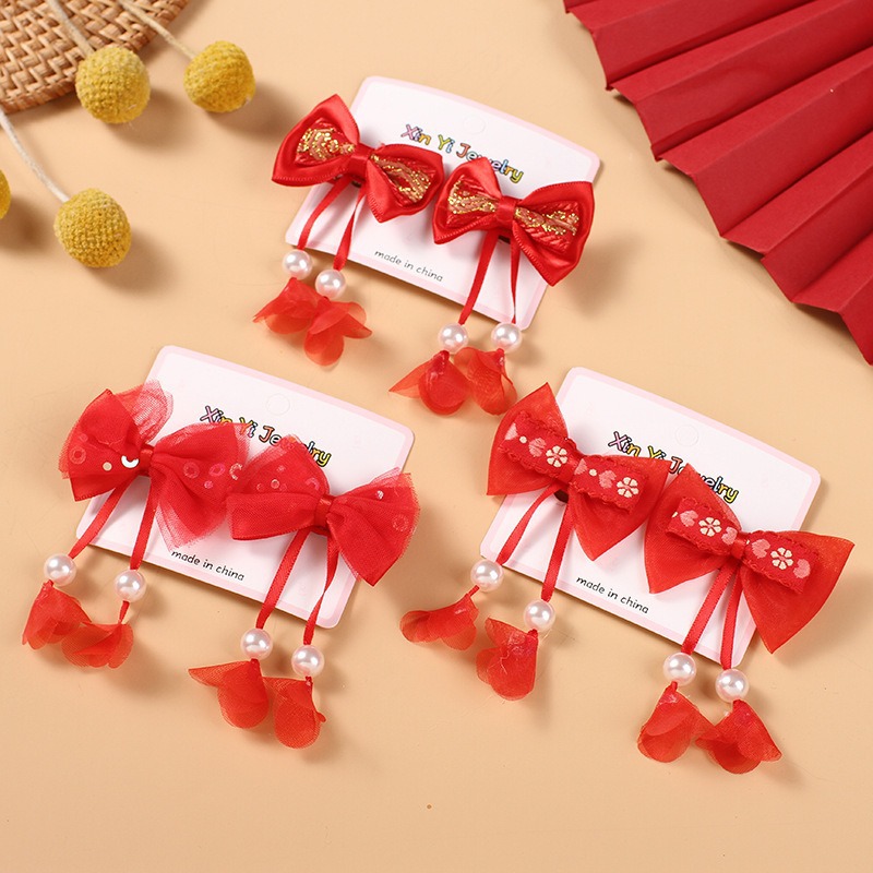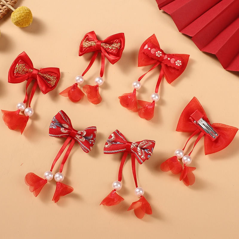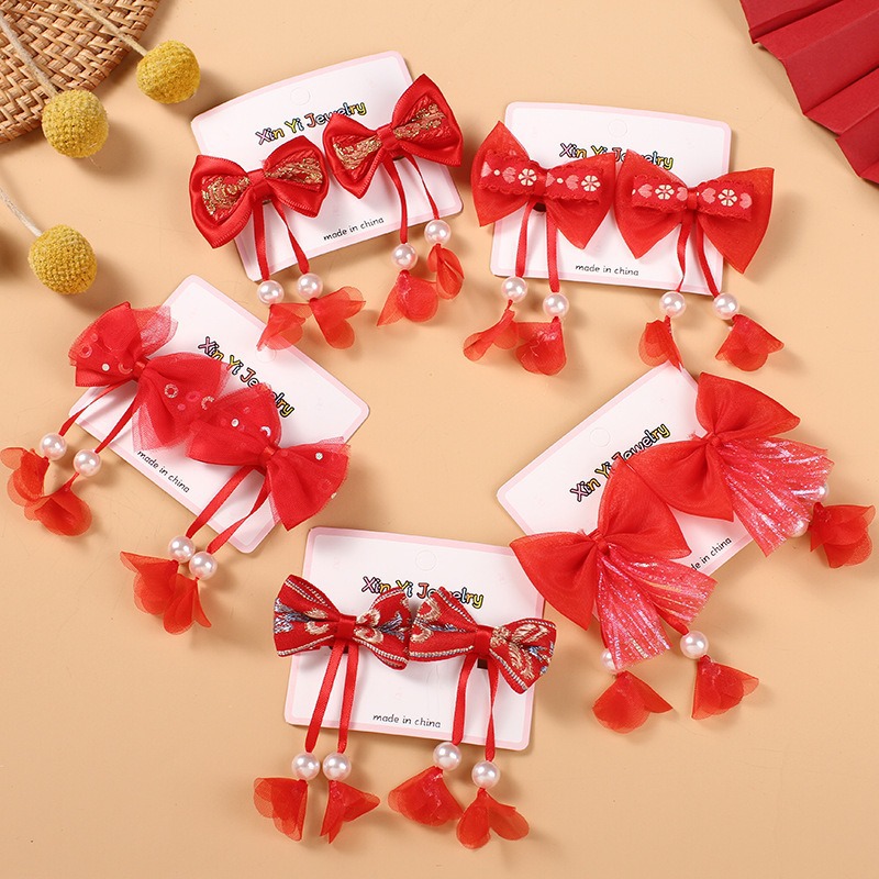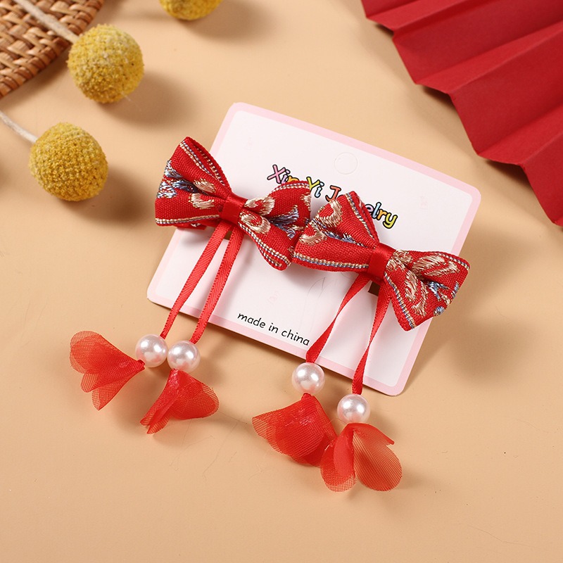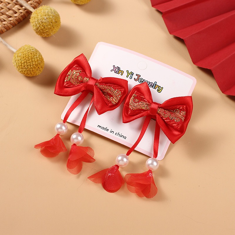 붉은 새해 어린이 머리핀 활 진주 술 머리핀 중국 스타일 소녀 한푸 쌍 클립 골동품 헤어 액세서리