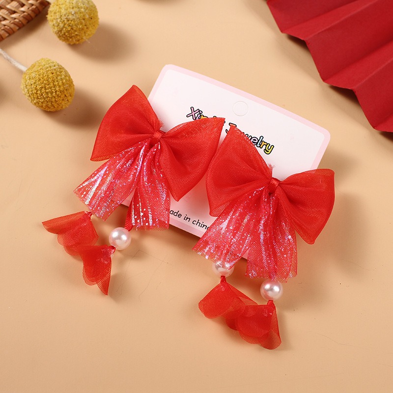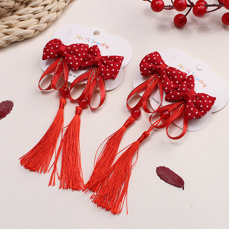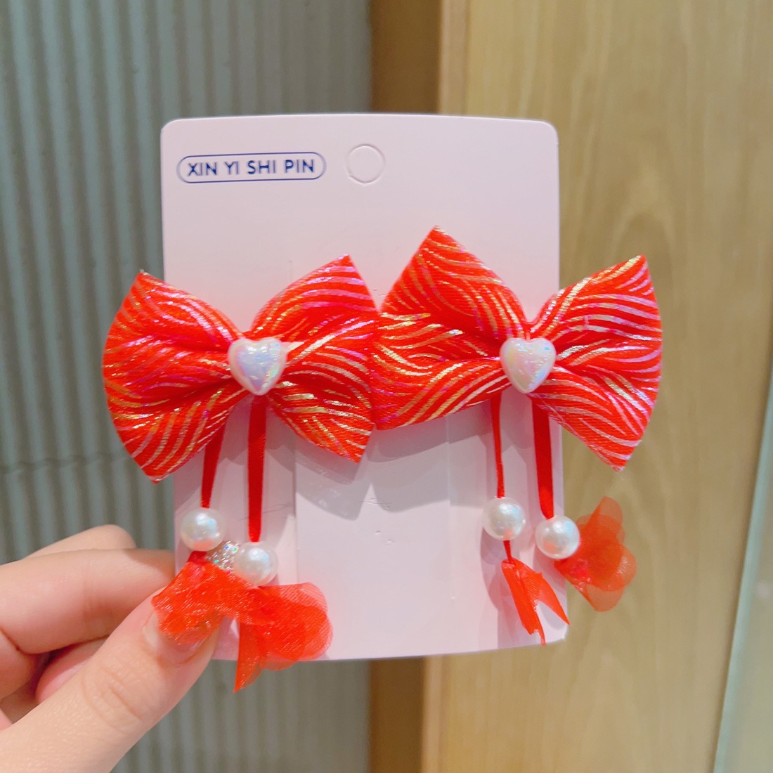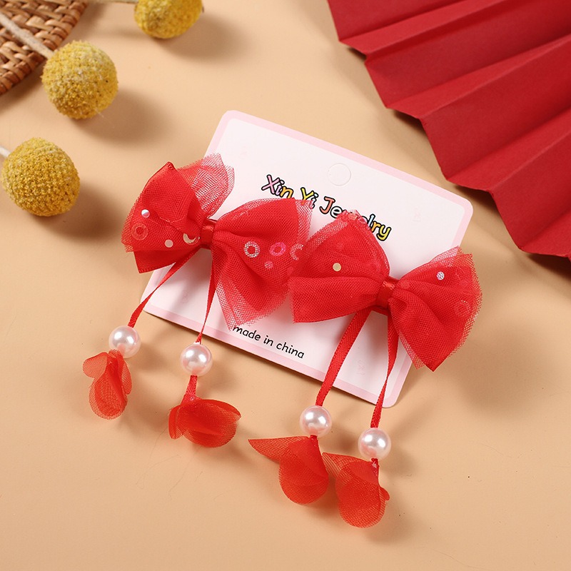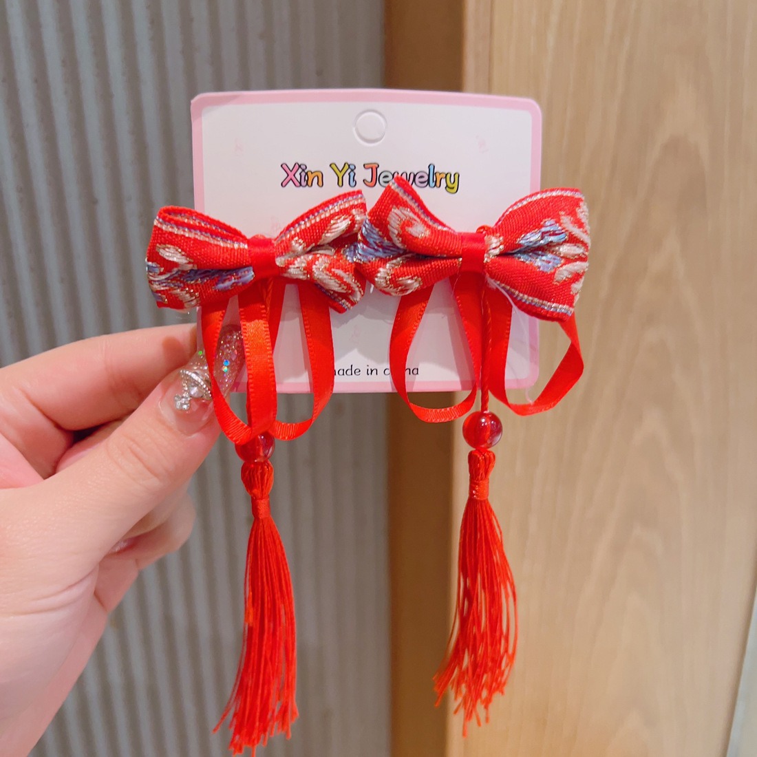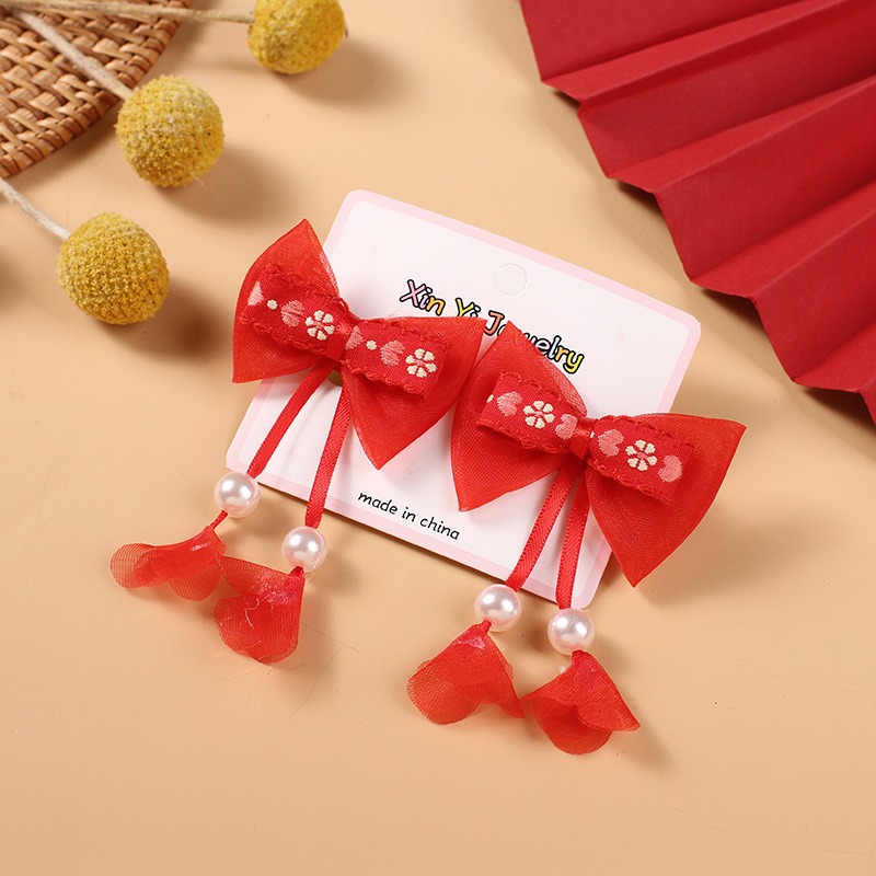 붉은 새해 어린이 머리핀 활 진주 술 머리핀 중국 스타일 소녀 한푸 쌍 클립 골동품 헤어 액세서리