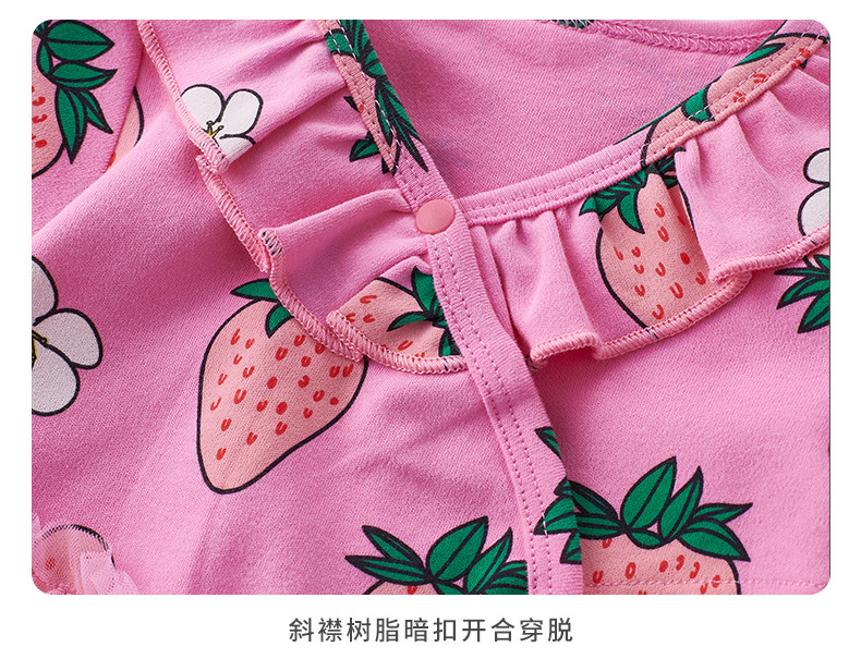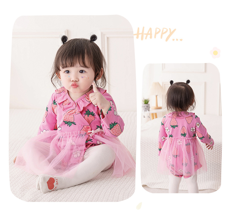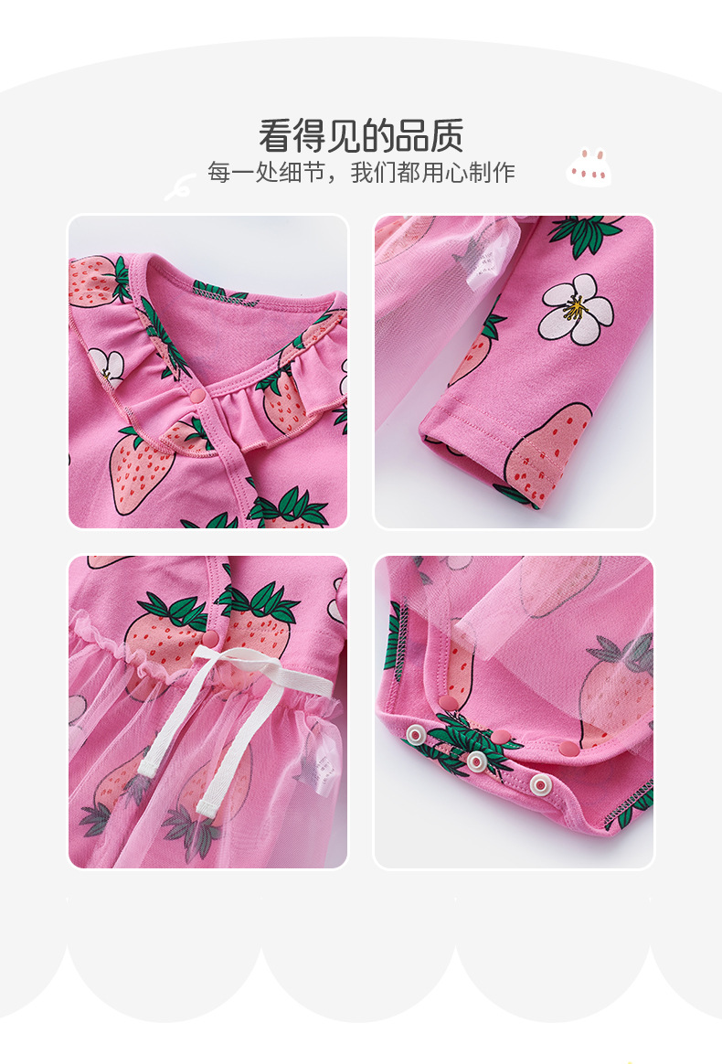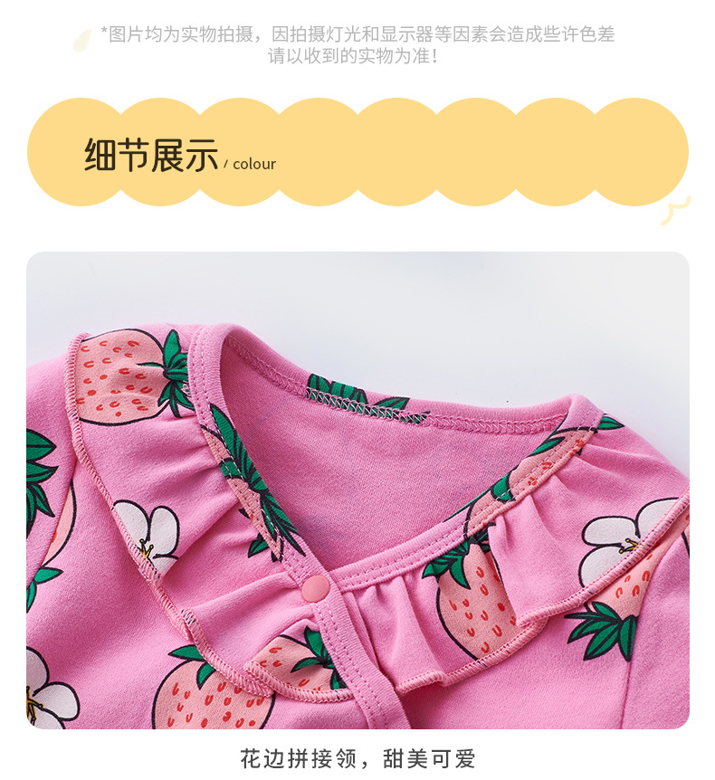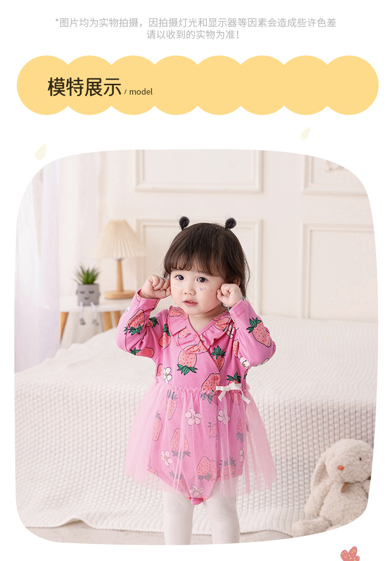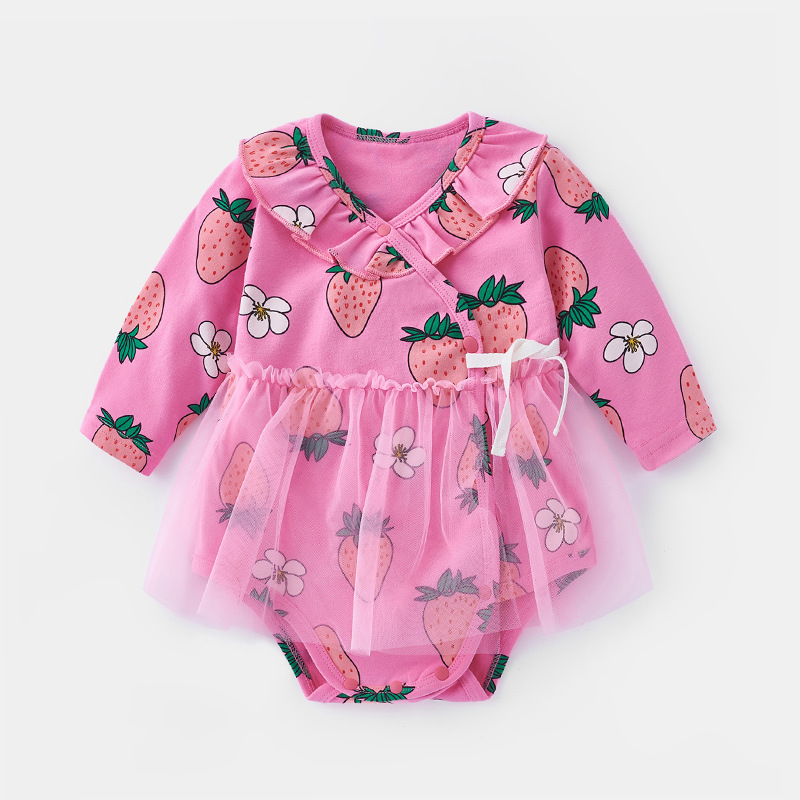아기의 면화 가방 방귀 옷 2024 봄 딸기 인쇄 삼각형 점프 수트 소녀 아기의 봄과 가을 점프 수트 3512스토어 가기