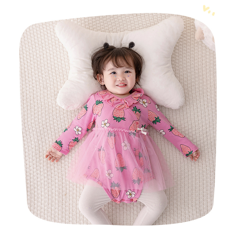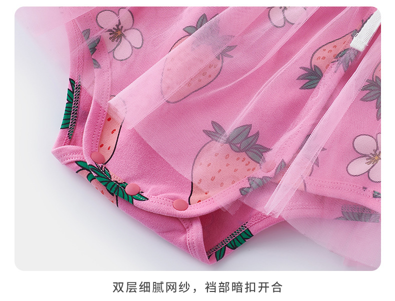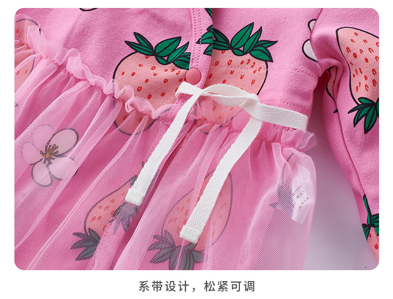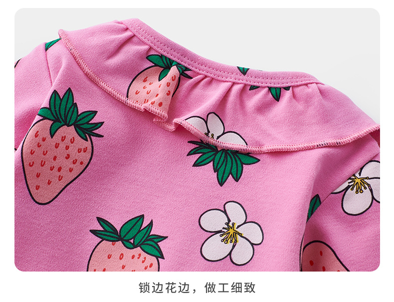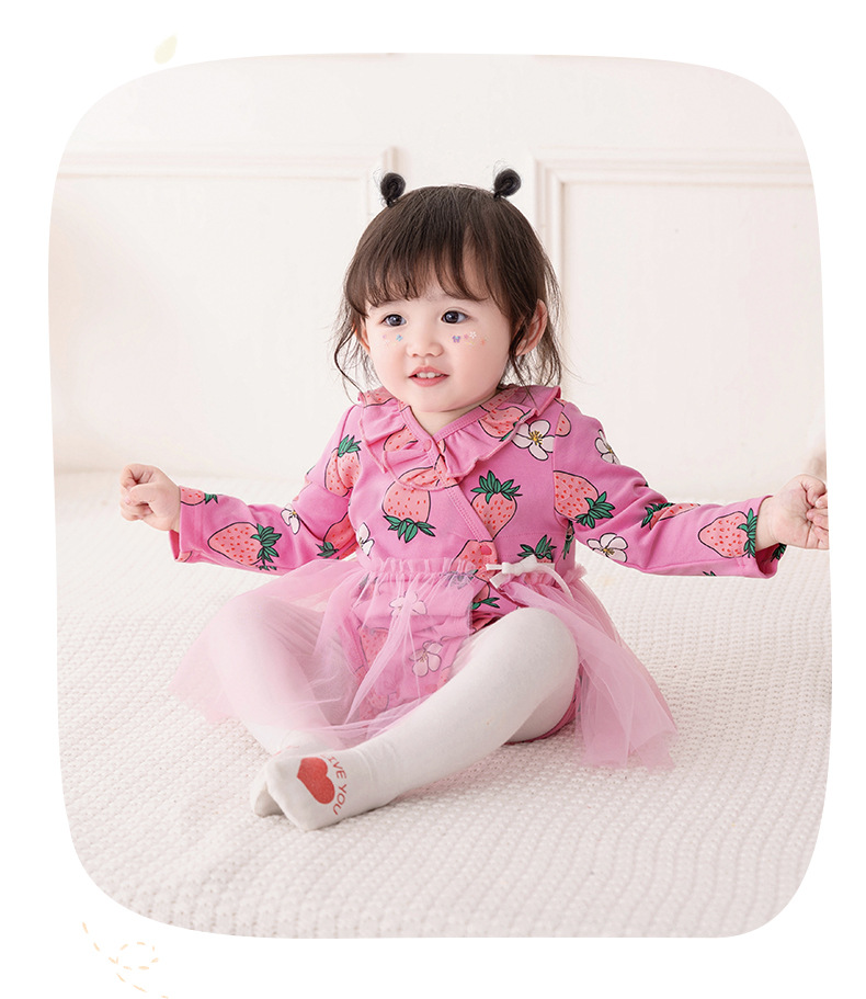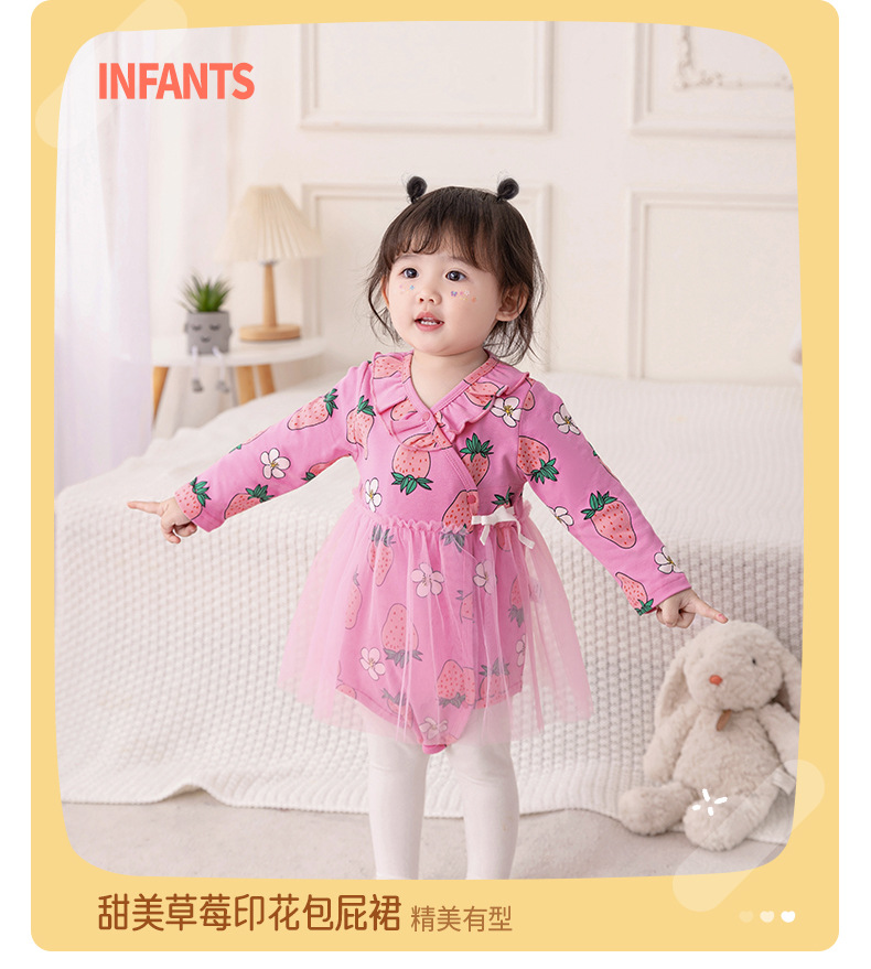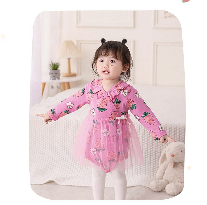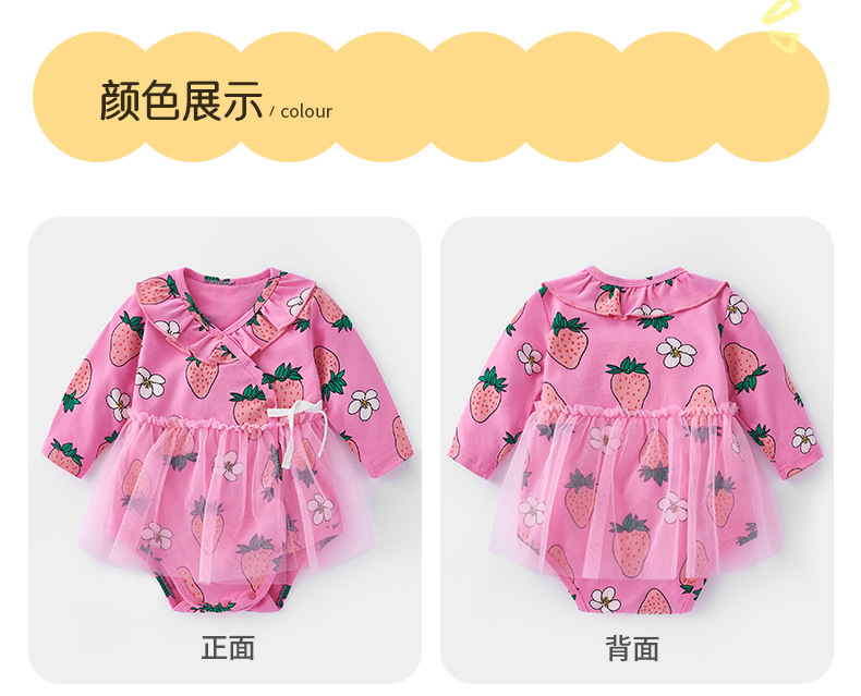 아기의 면화 가방 방귀 옷 2024 봄 딸기 인쇄 삼각형 점프 수트 소녀 아기의 봄과 가을 점프 수트 3512스토어 가기