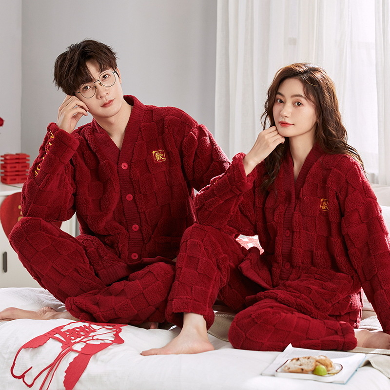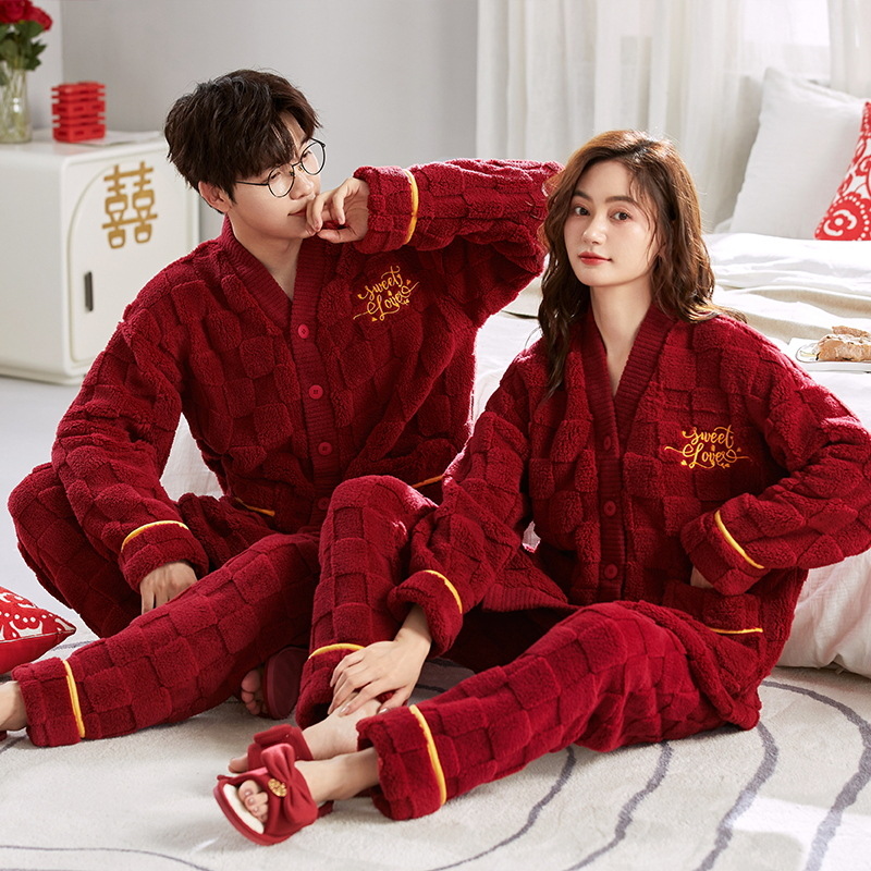 커플 잠옷 여성의 가을과 겨울 축제 기모 두꺼운 카디건 플란넬 남성 홈웨어 웨딩 년 레드