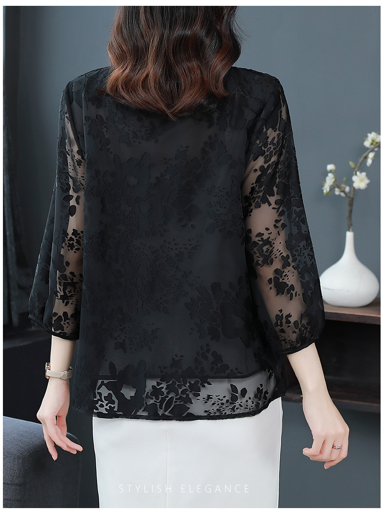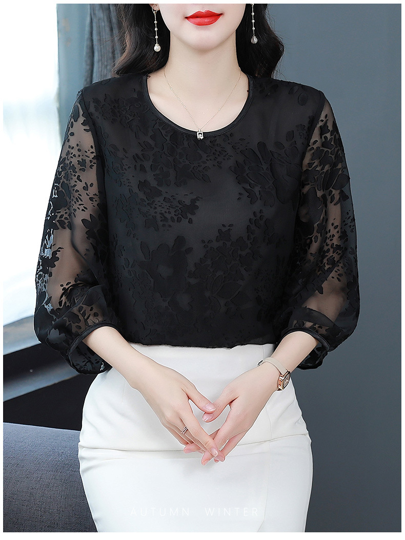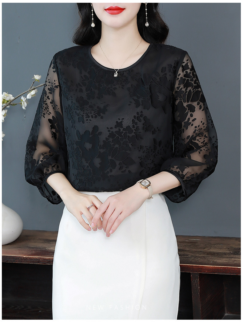 2025 새로운 헤비급 레이스 쉬폰 셔츠 여성 풀오버 베이스 디자인 라운드 넥 틈새 다용도 외국 스타일 트렌드