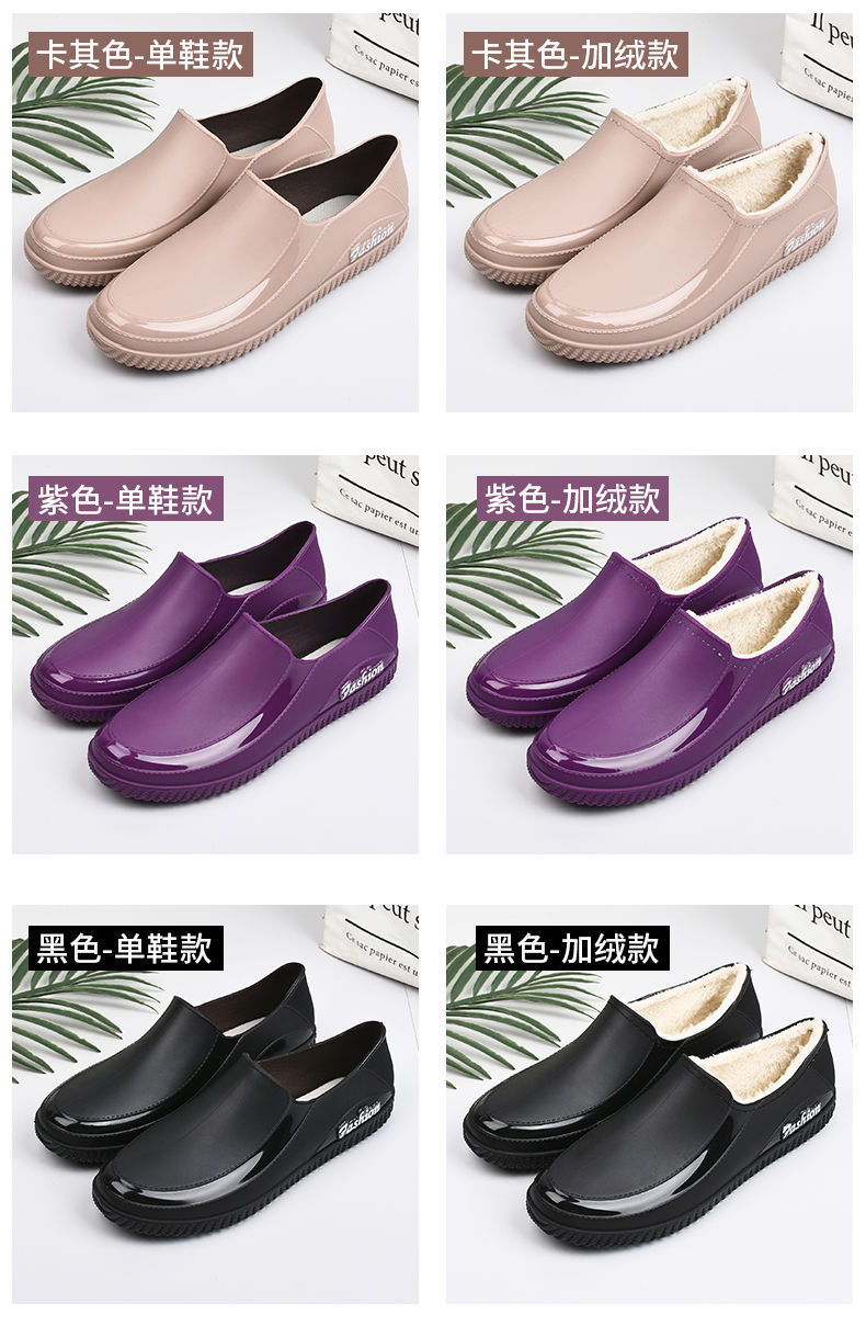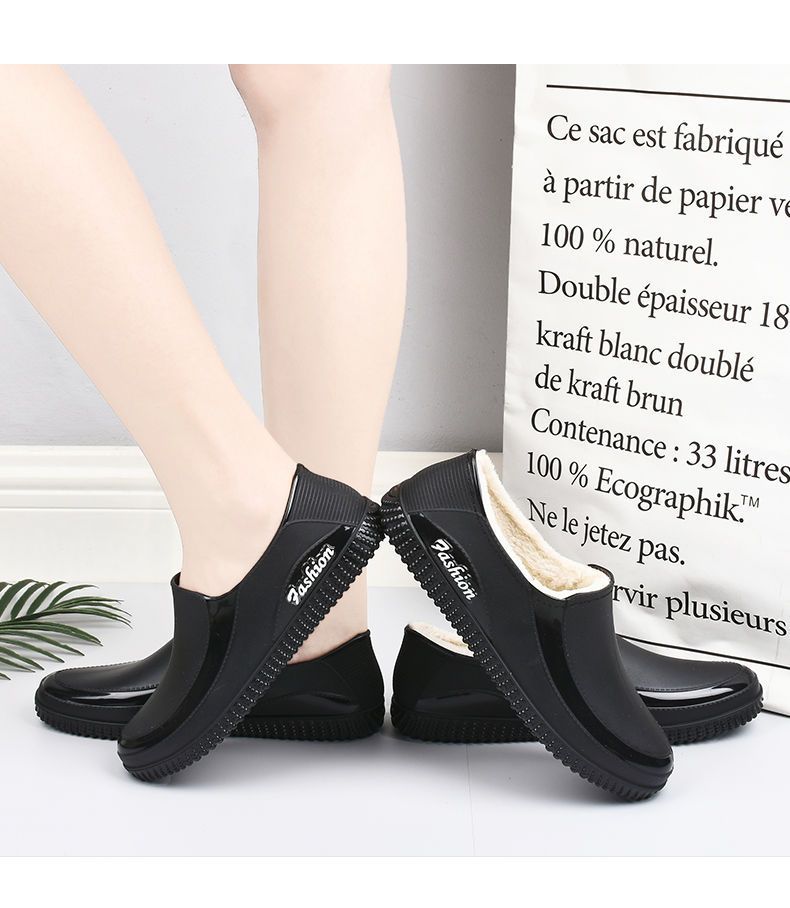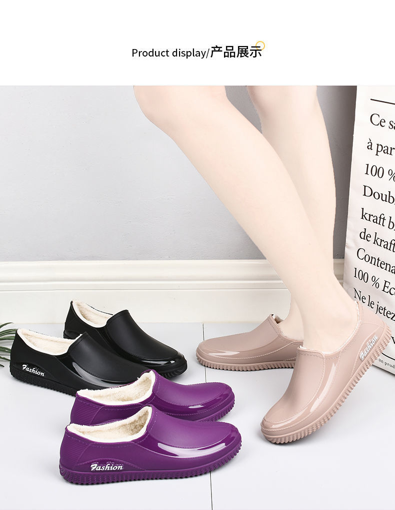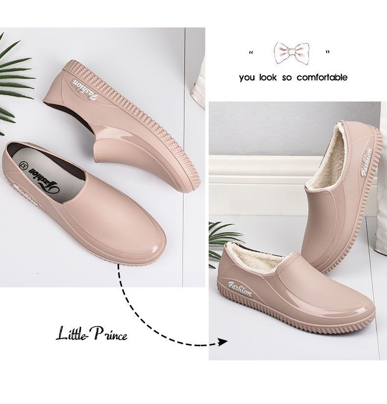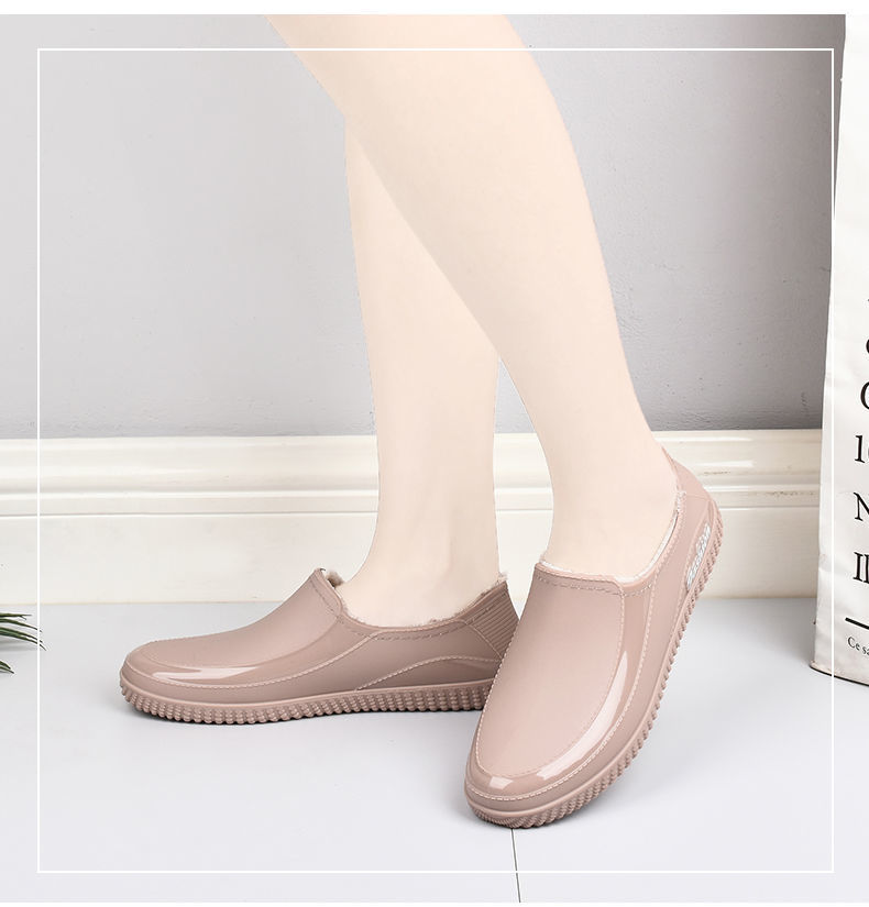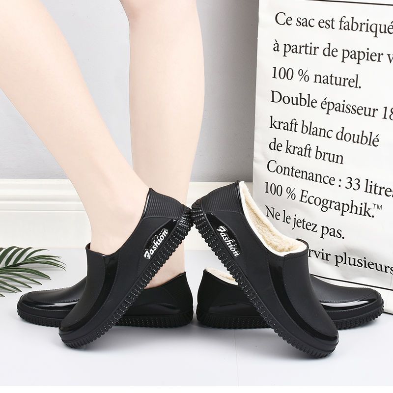 여성용 로우 탑 짧은 로우 컷 레인 부츠 방수 통합 고무 신발 고정 플러시 미끄럼 방지 유행 작업 장화스토어 가기