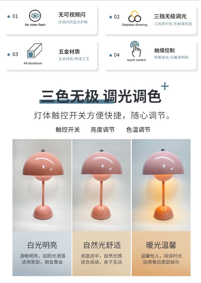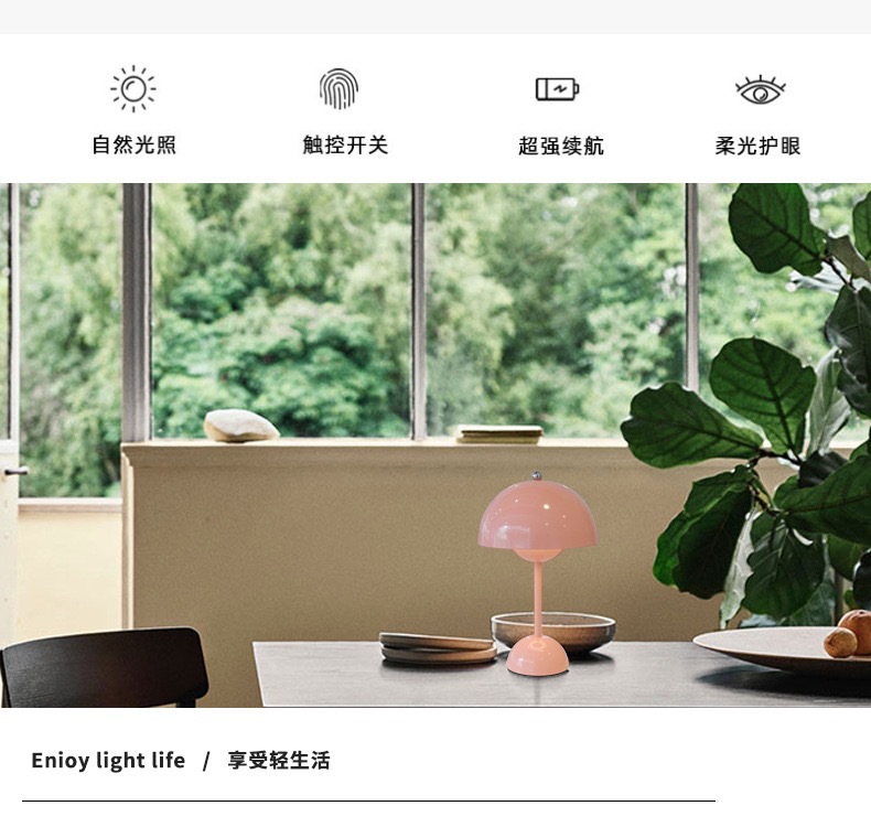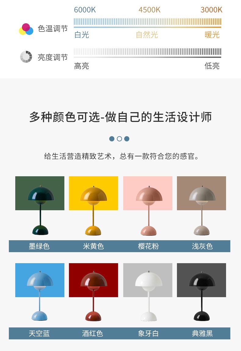 开关/使用方式:开关在顶部,轻触碰会循环灯光模式,长触调整灯光亮度