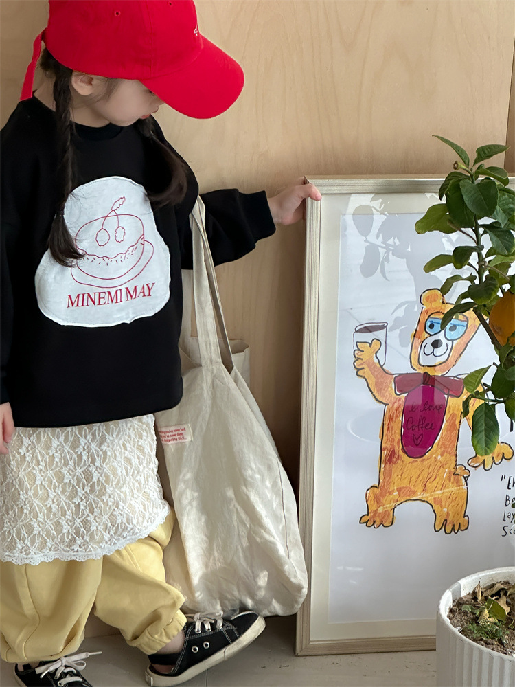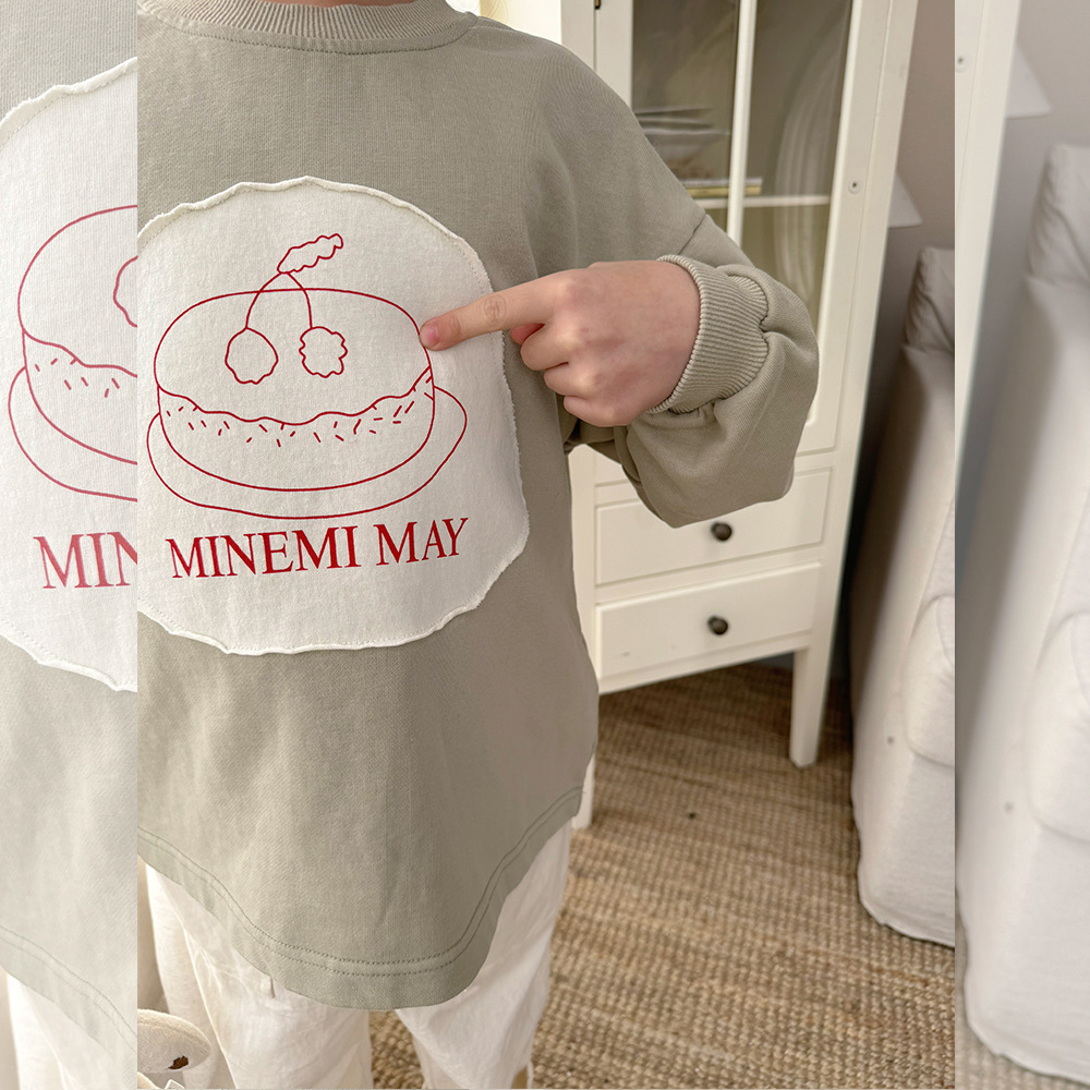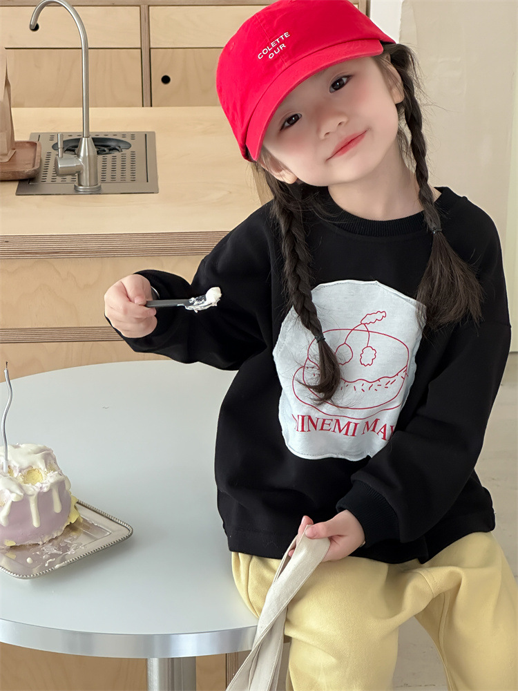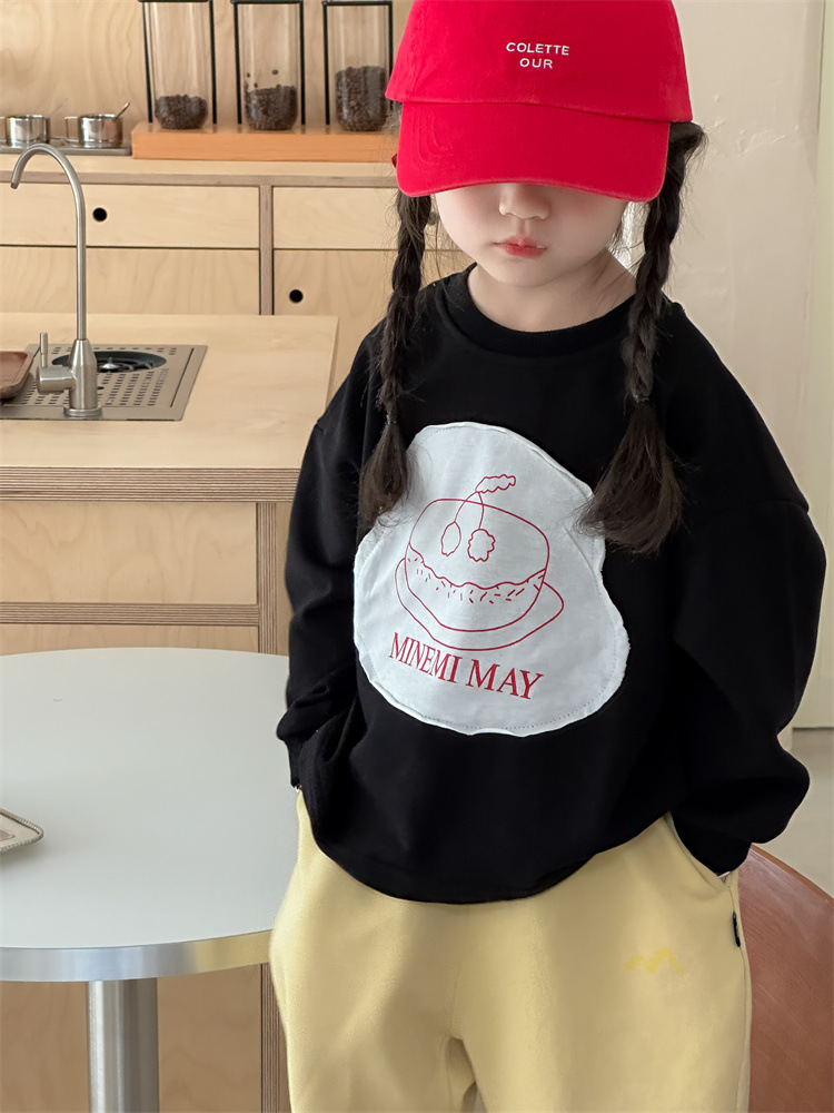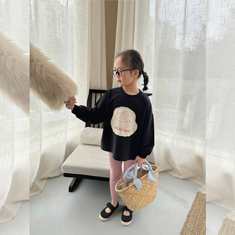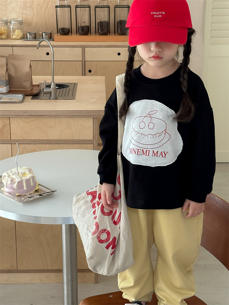 봄 2024 한국 어린이 만화 편지 티셔츠 패션 소년 소녀 둥근 목 긴 소매 프린트 패치 티셔츠