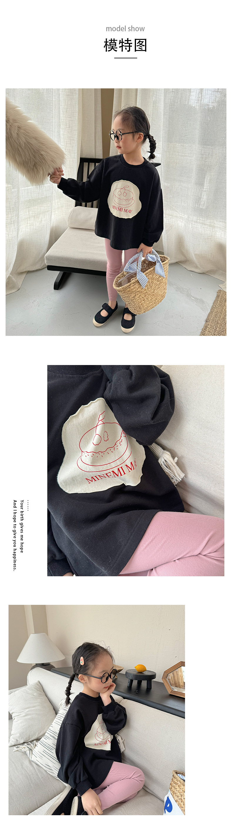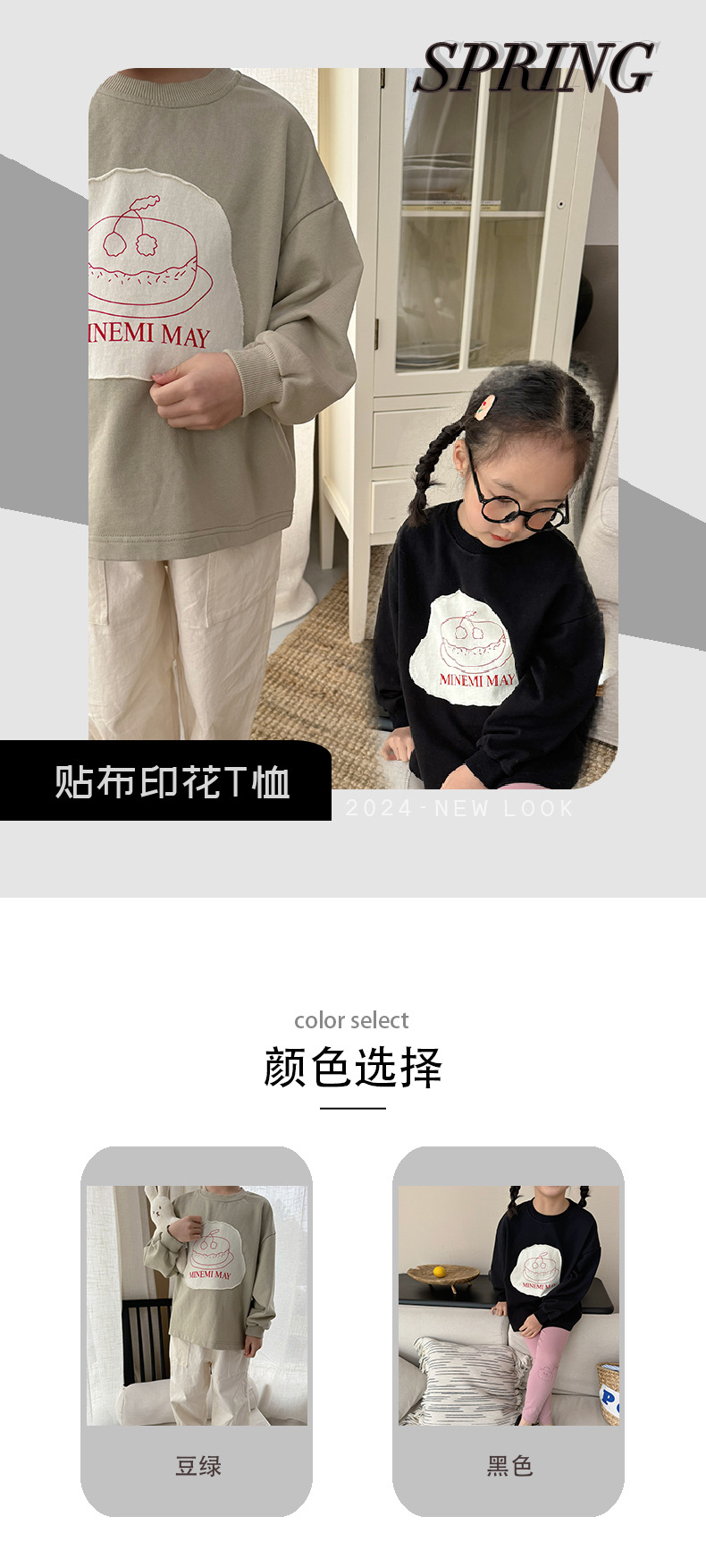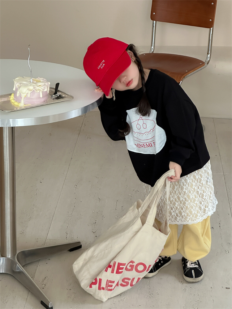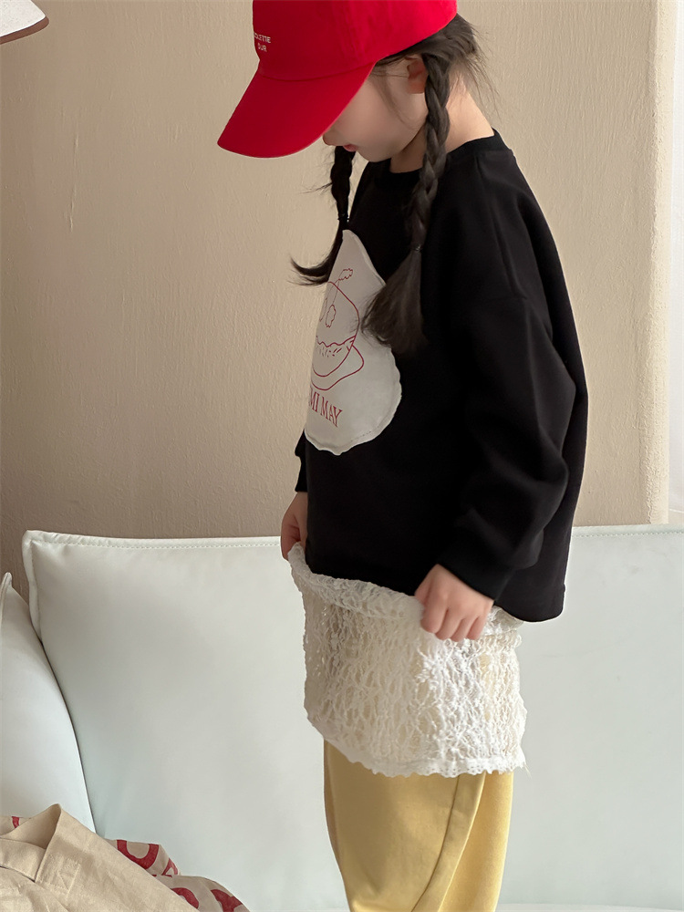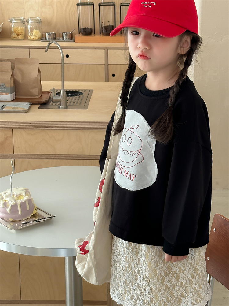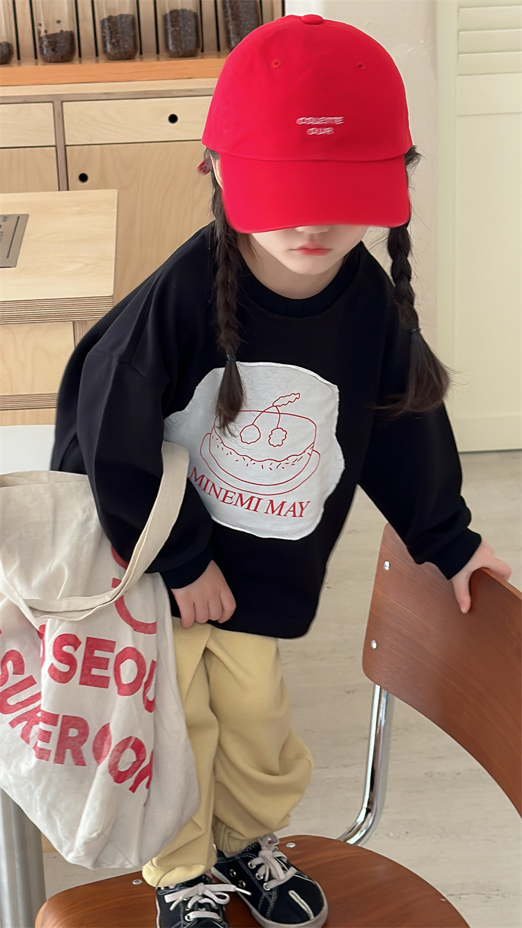 봄 2024 한국 어린이 만화 편지 티셔츠 패션 소년 소녀 둥근 목 긴 소매 프린트 패치 티셔츠